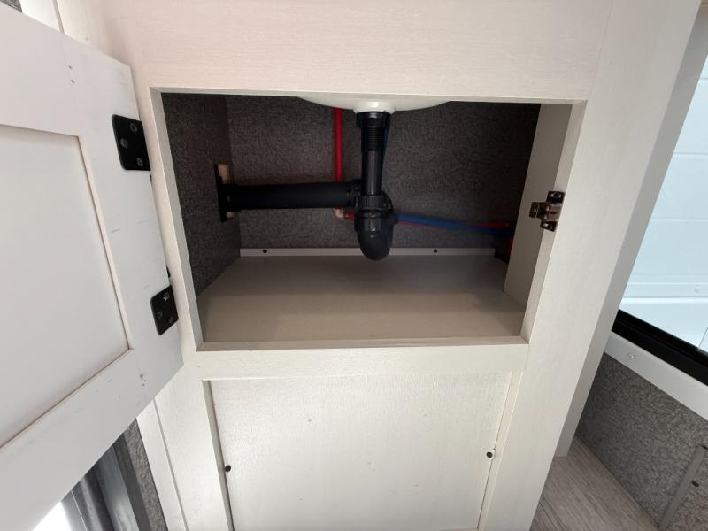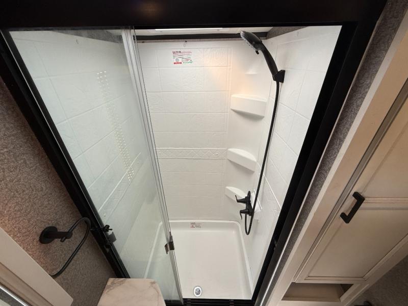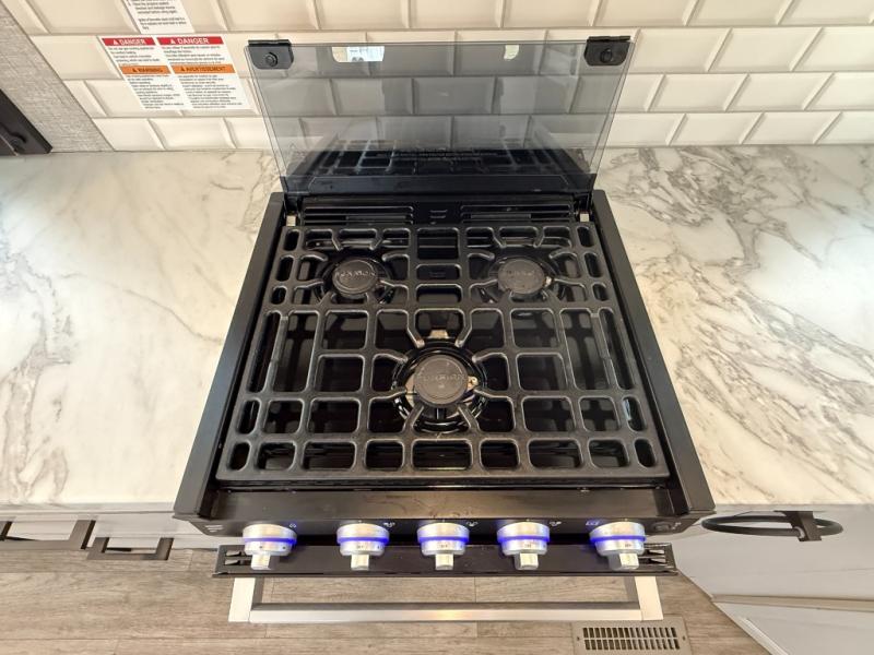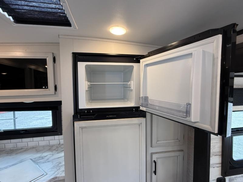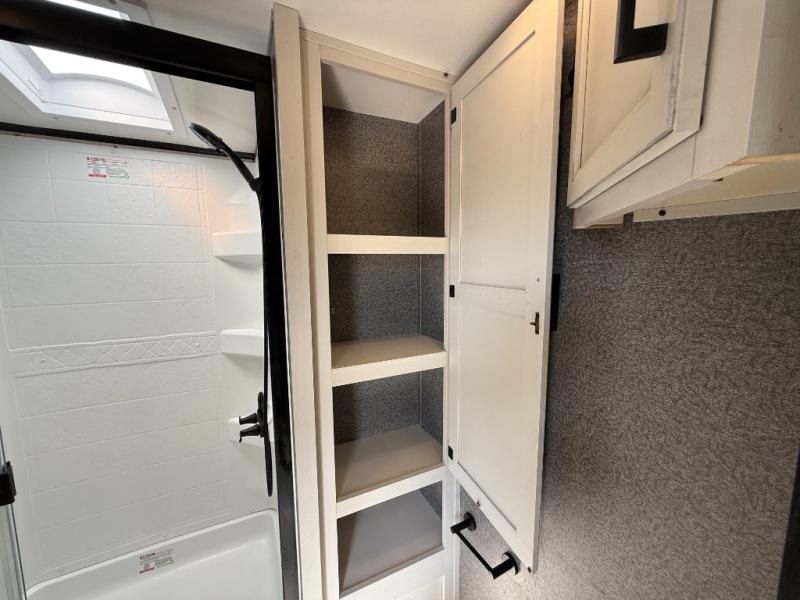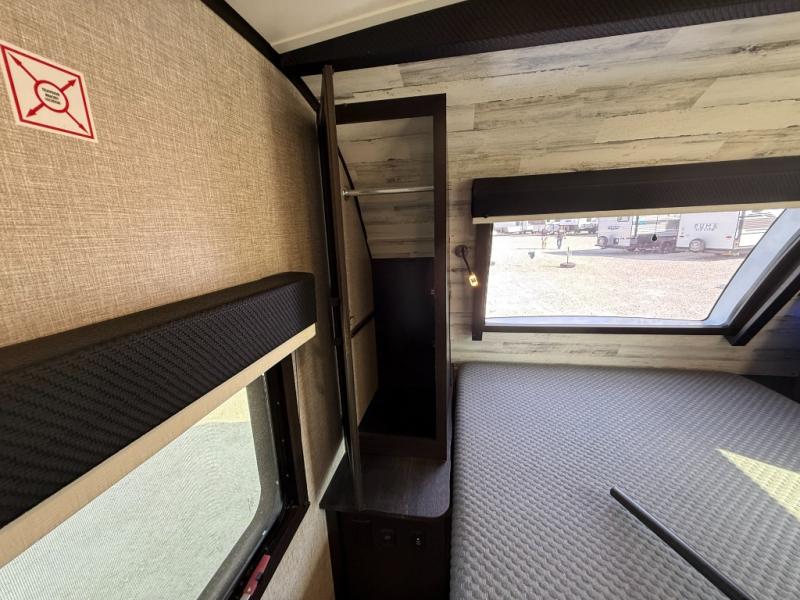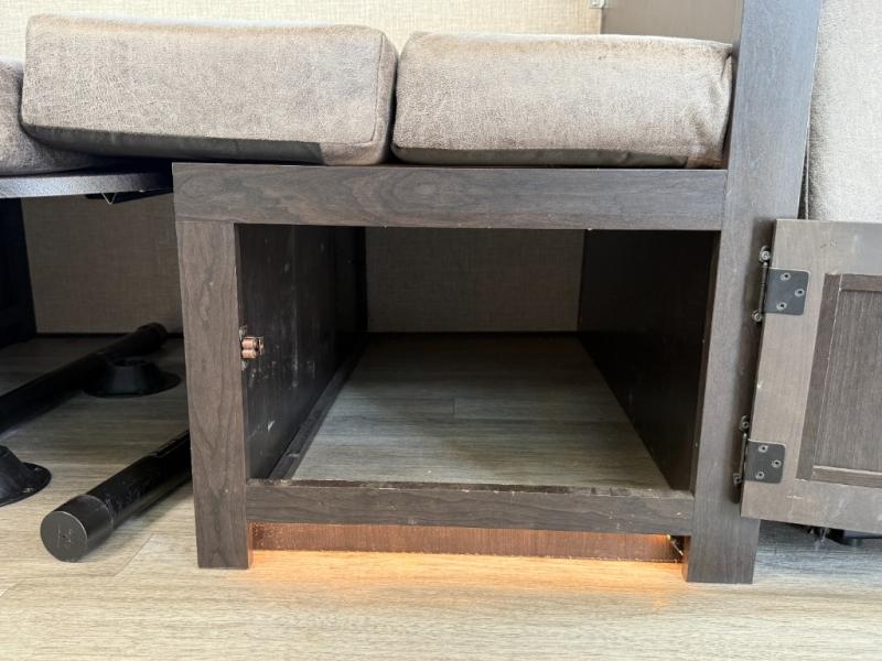 Step inside this rear kitchen travel trailer for fun family vacations. The large slide will provide the chef space to cook, while the kids watch a movie on the TV on lift. If the weather is just right, you will probably want to cook on the outside kitchen while the kids ride their bikes around the campsite. This model includes a tri-fold sofa and a booth dinette that will be perfect for meal times, relaxing, and sleeping space at night. You and your spouse can take the front private bedroom with a queen bed and dual wardrobes for your things, and the full bath is centrally located for easy access!