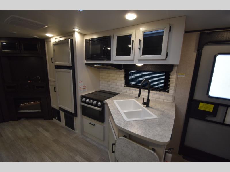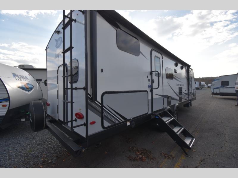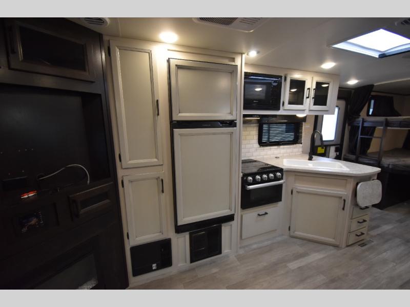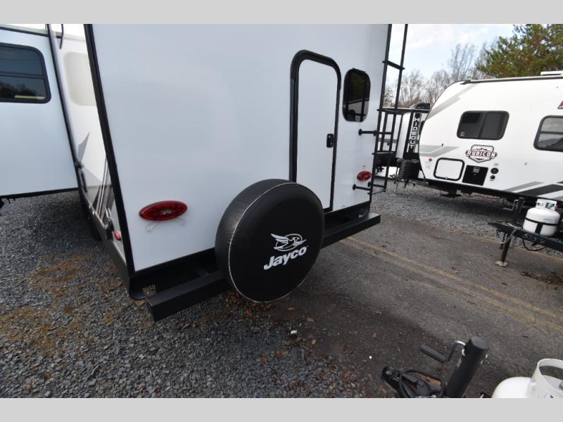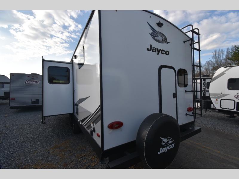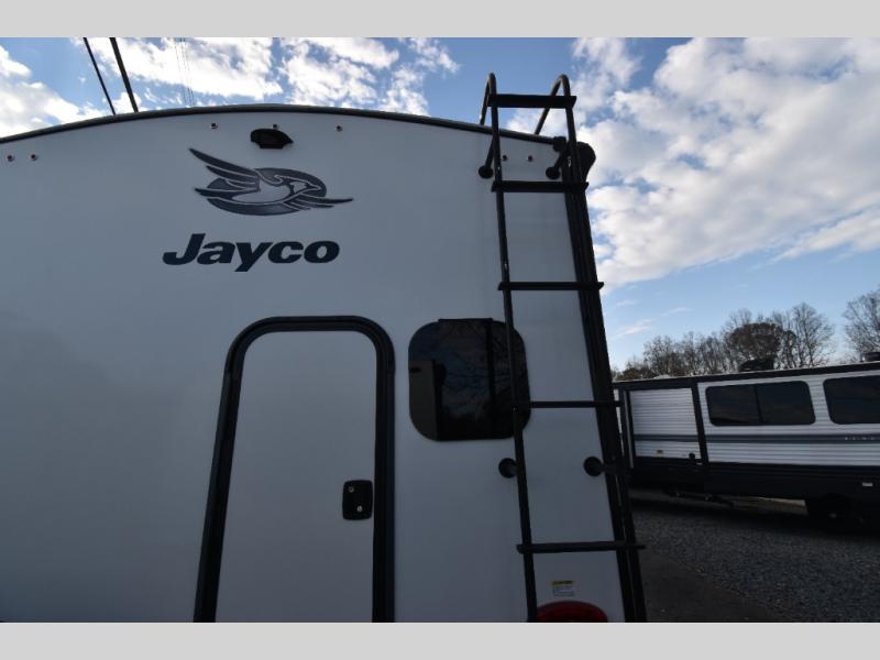 The lightweight White Hawk travel trailers by Jayco will blow you away with their roomy interiors, luxurious amenities, and durable construction. The Magnum Truss Roof System can withstand 50% more weight than the competition, and the Stronghold VBL lamination is the lightest, yet strongest in the industry. Each model includes the JAYCOMMAND "Smart RV" system with a tire pressure monitor system, plus American-made Goodyear tires for maximum durability and carrying capacity. You will love the sleek look of the front molded fiberglass cap with an automotive windshield and blue LED accent lighting, along with the frameless windows and automotive-style aluminum rims. The White Hawk travel trailers also include an arched interior ceiling, a kitchen skylight with a shade, residential vinyl flooring with cold crack resistance, and an electric fireplace.