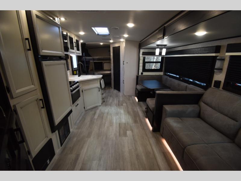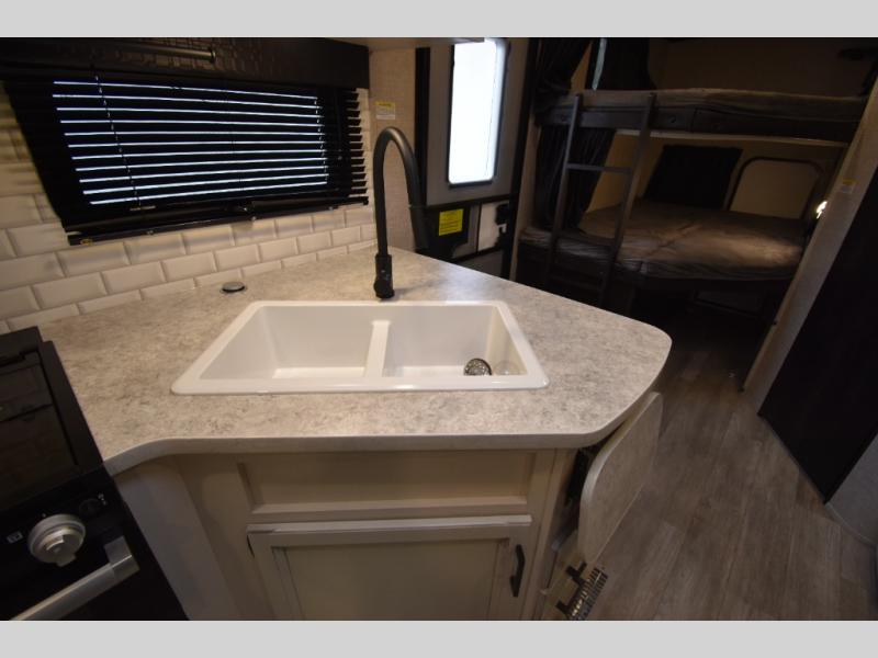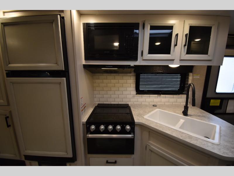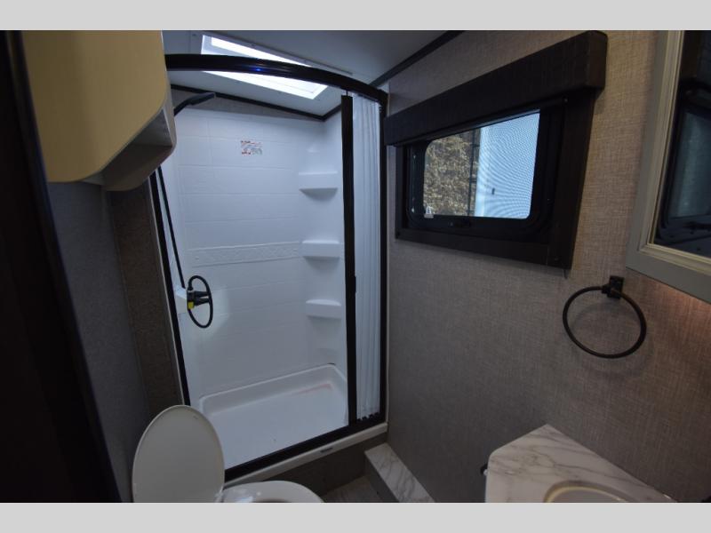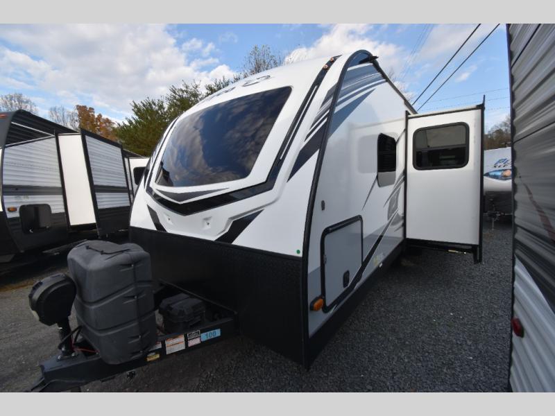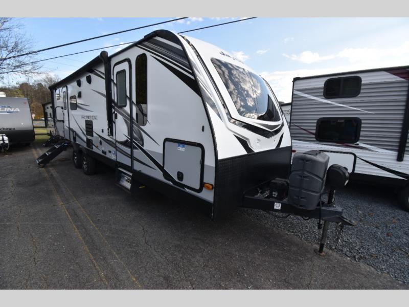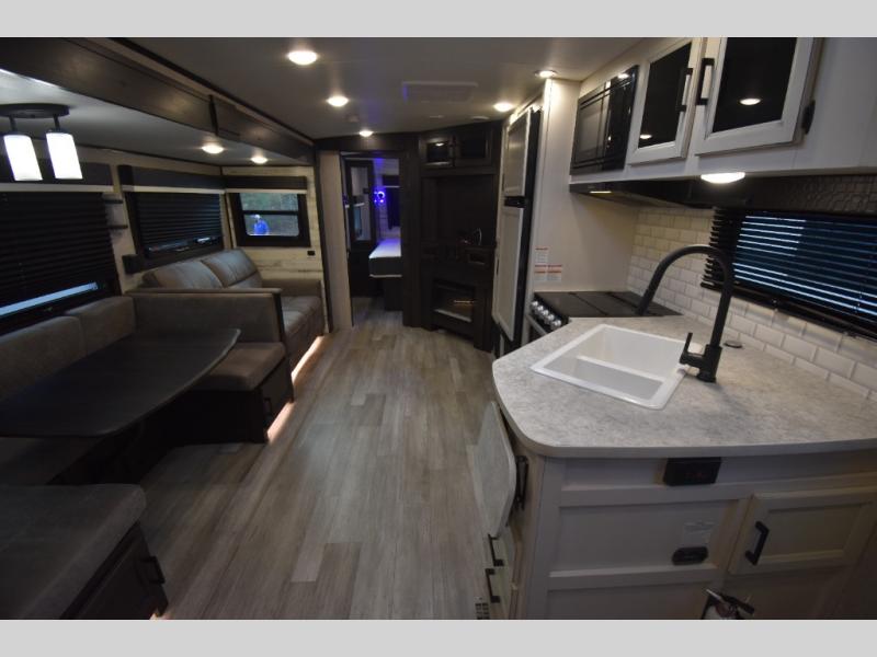 The lightweight White Hawk travel trailers by Jayco will blow you away with their roomy interiors, luxurious amenities, and durable construction. The Magnum Truss Roof System can withstand 50% more weight than the competition, and the Stronghold VBL lamination is the lightest, yet strongest in the industry. Each model includes the JAYCOMMAND "Smart RV" system with a tire pressure monitor system, plus American-made Goodyear tires for maximum durability and carrying capacity. You will love the sleek look of the front molded fiberglass cap with an automotive windshield and blue LED accent lighting, along with the frameless windows and automotive-style aluminum rims. The White Hawk travel trailers also include an arched interior ceiling, a kitchen skylight with a shade, residential vinyl flooring with cold crack resistance, and an electric fireplace.
