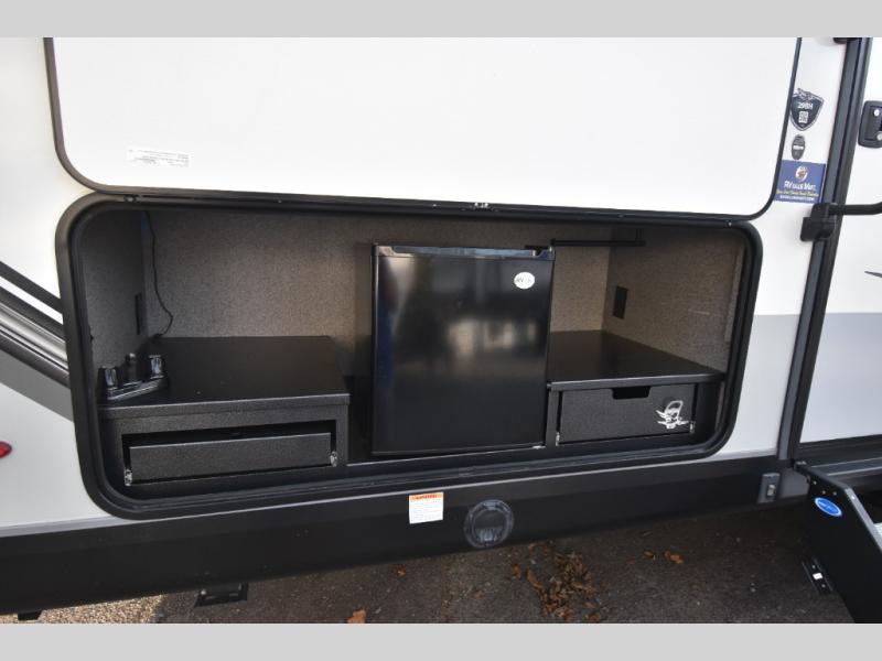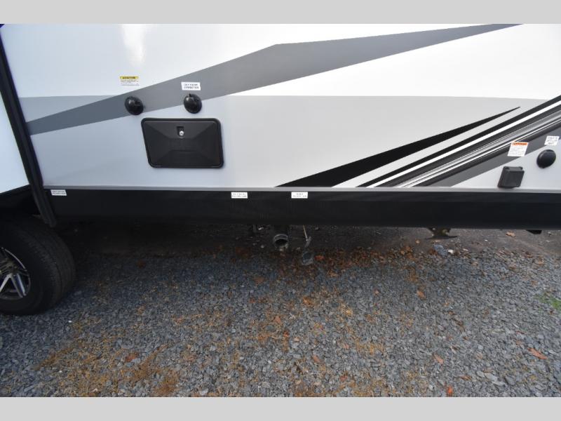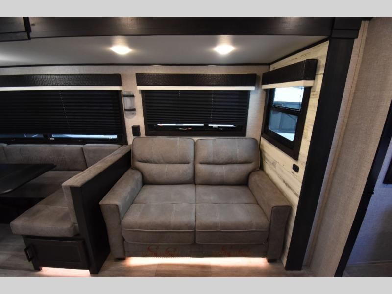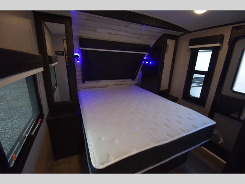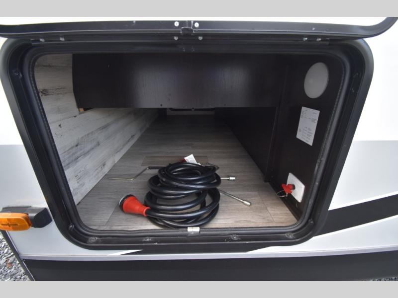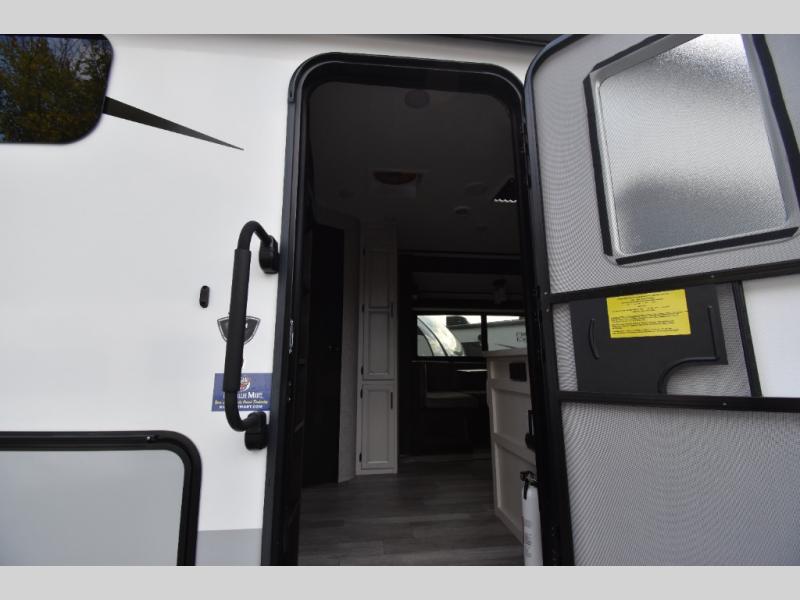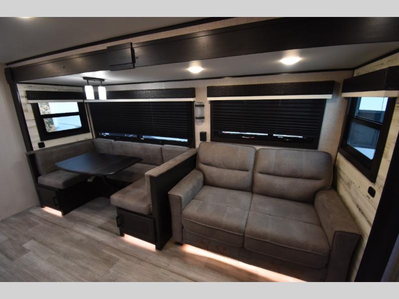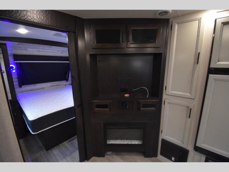 Bring the whole family along in this spacious travel trailer. You will love visiting outside while the chef of your group prepares breakfast on the outdoor kitchen, plus there is a 21' power awning to shade you from the sun. If the weather isn't cooperating, head inside and dine around the U-shaped dinette. There is also a tri-fold sofa here, a fireplace, and an LED TV for movies. This model conveniently has dual entry doors so you can enter in through the main living area, or into the front private bedroom. The bedroom also features a queen bed, dual wardrobes, and a closet to keep your items organized. Start camping today!