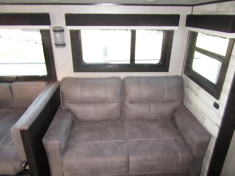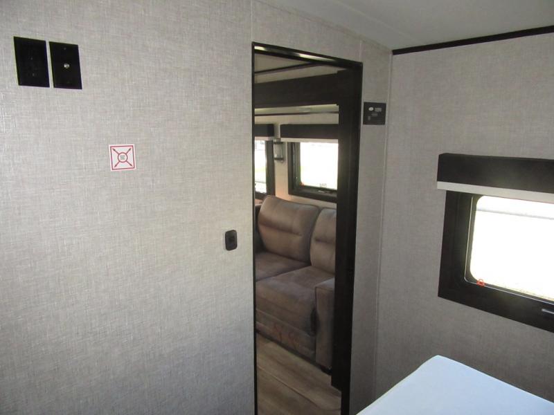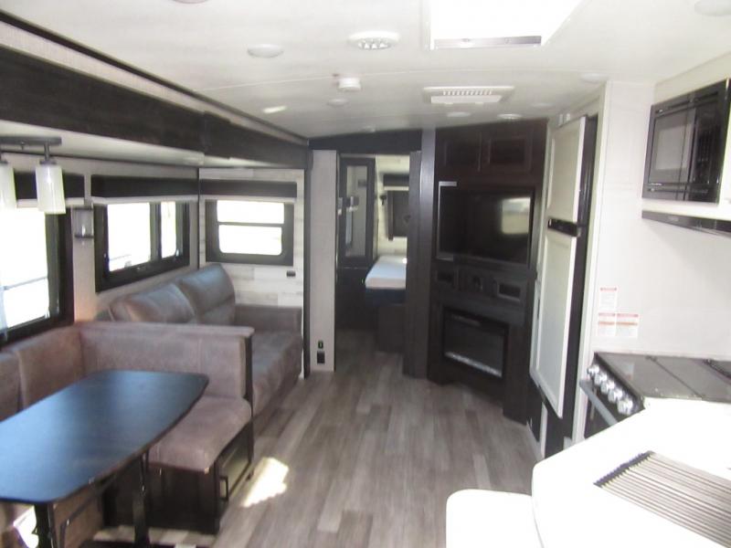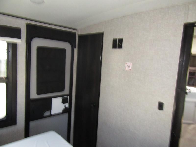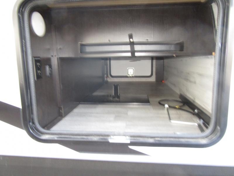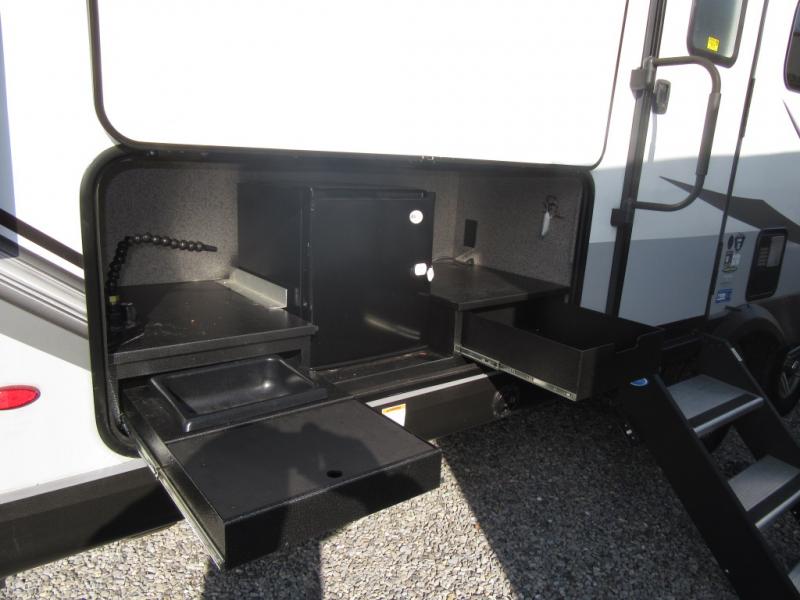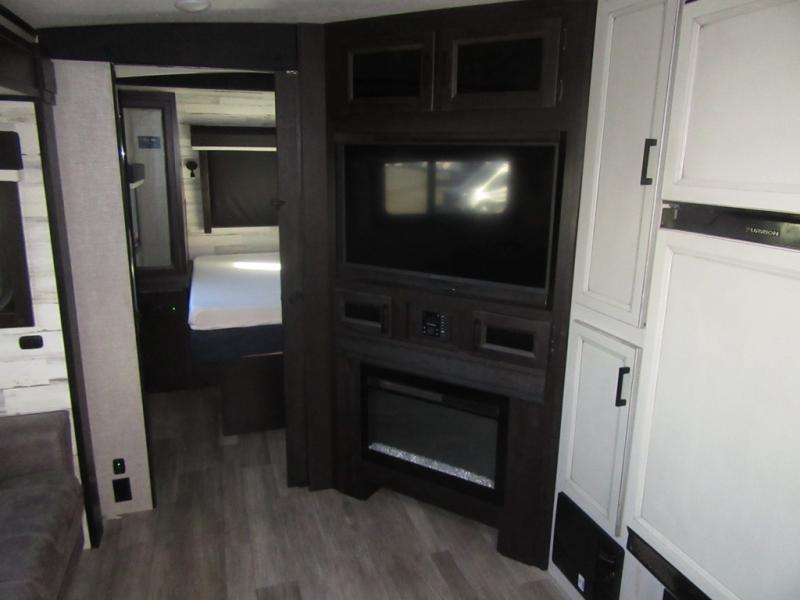 Bring the whole family along in this spacious travel trailer. You will love visiting outside while the chef of your group prepares breakfast on the outdoor kitchen, plus there is a 21' power awning to shade you from the sun. If the weather isn't cooperating, head inside and dine around the U-shaped dinette. There is also a tri-fold sofa here, a fireplace, and an LED TV for movies. This model conveniently has dual entry doors so you can enter in through the main living area, or into the front private bedroom. The bedroom also features a queen bed, dual wardrobes, and a closet to keep your items organized. Start camping today!