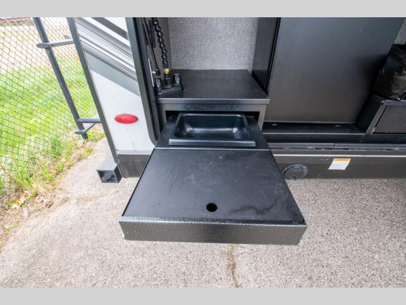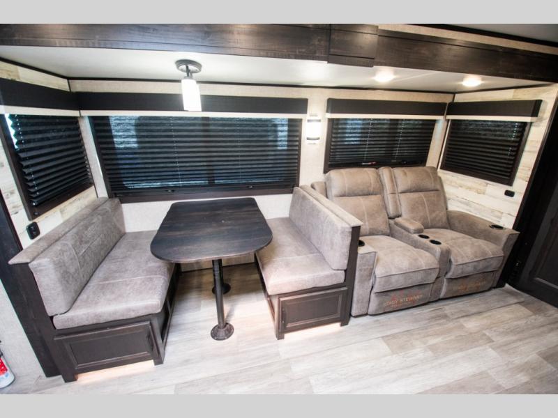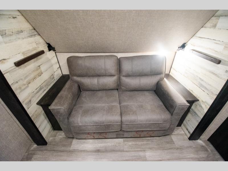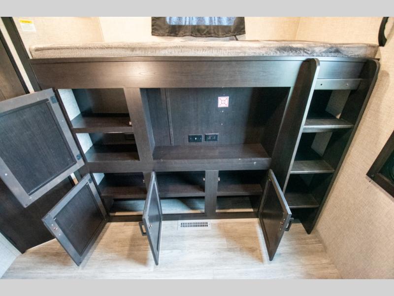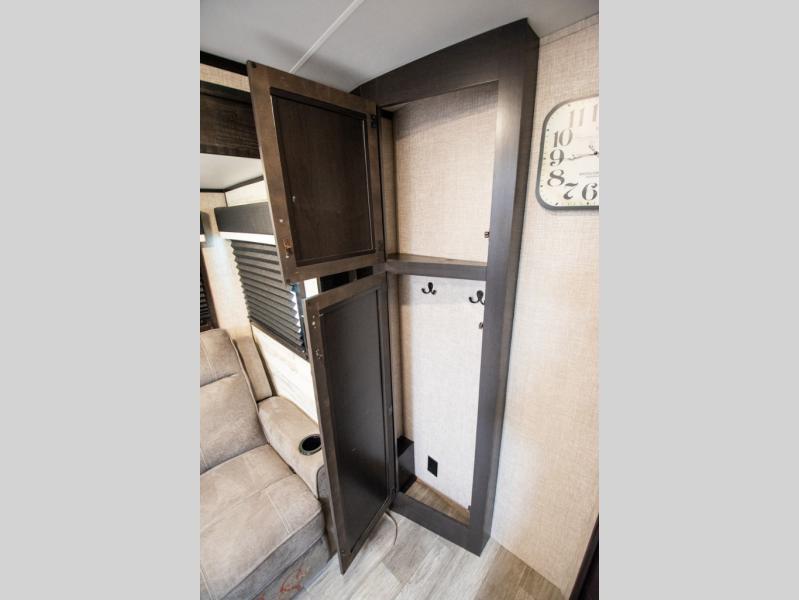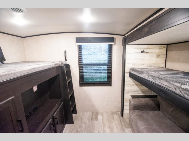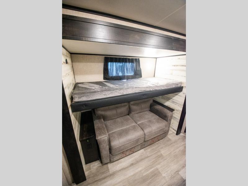 Family camping trips just got sweeter in this double slide out travel trailer that can sleep nine to ten people each night. You will enjoy your own private bedroom up front with a queen bed and three wardrobes. Your guests can make themselves comfortable in the rear private bunkhouse suite that includes two bunks, a tri-fold sofa, plus a convenient half bath! The full bath includes a radius shower with a skylight, a medicine cabinet, plus a linen closet for clean towels. This model includes a three burner cooktop and a microwave oven indoors to prepare meals, plus there is an outdoor kitchen for a sunrise breakfast. There are even two power awnings for maximum protection from the hot summer sun!