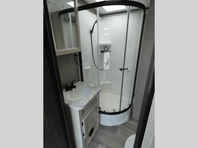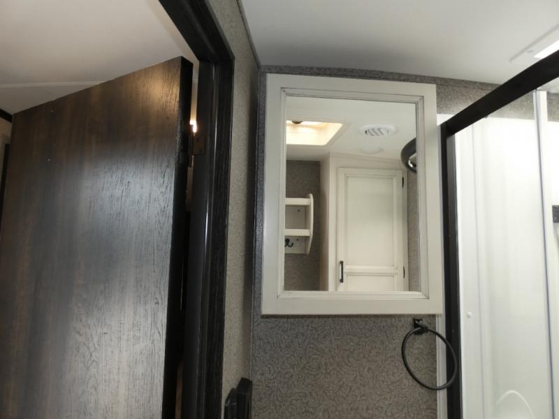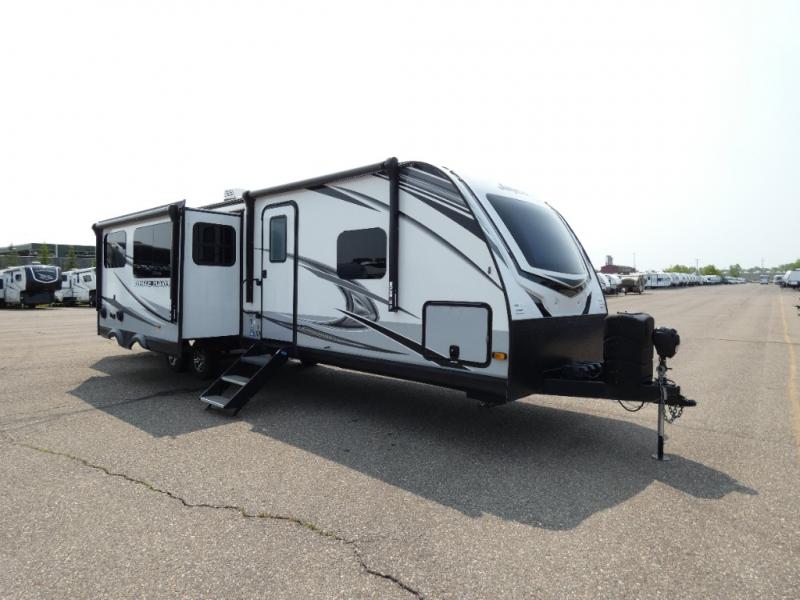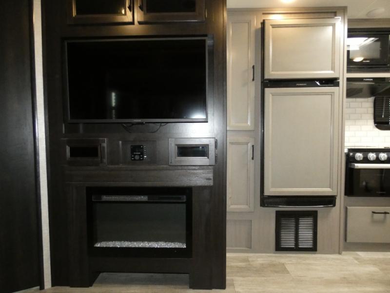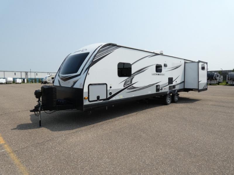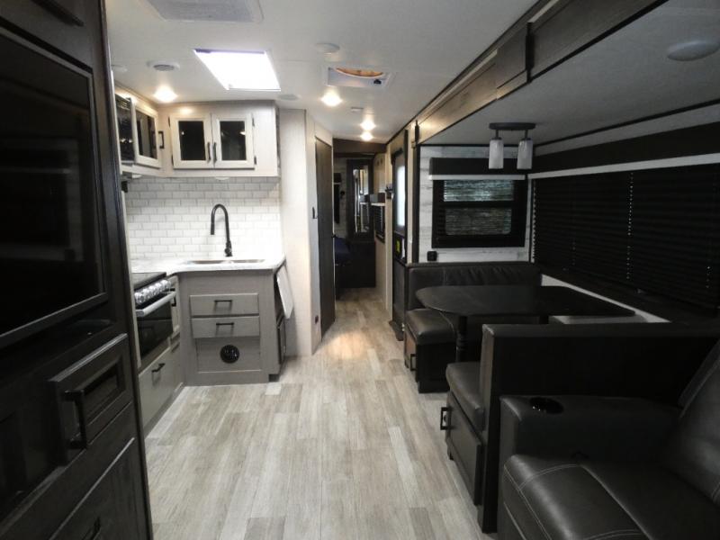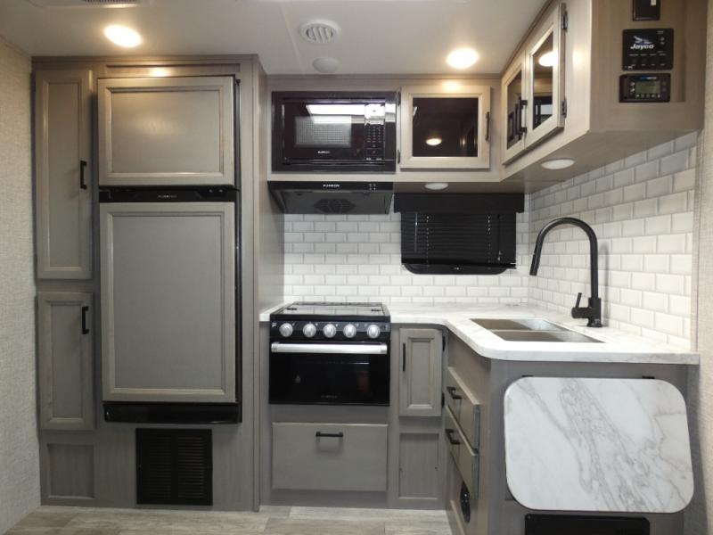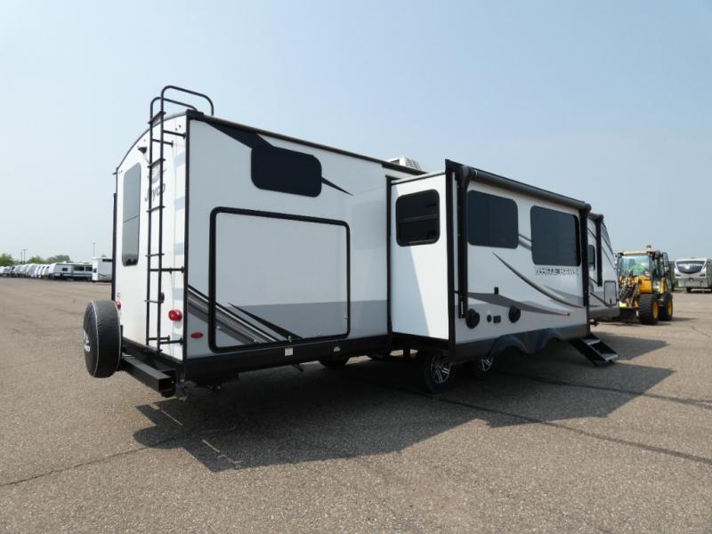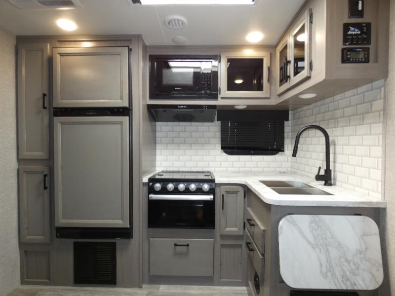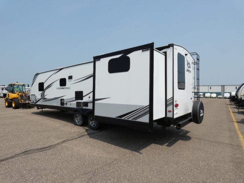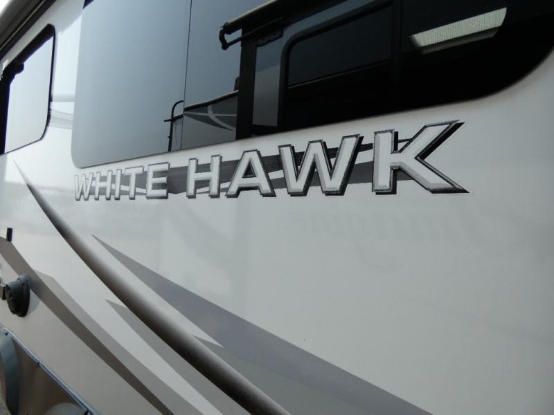 The lightweight White Hawk travel trailers by Jayco will blow you away with their roomy interiors, luxurious amenities, and durable construction. The Magnum Truss Roof System can withstand 50% more weight than the competition, and the Stronghold VBL lamination is the lightest, yet strongest in the industry. Each model includes the JAYCOMMAND "Smart RV" system with a tire pressure monitor system, plus American-made Goodyear tires for maximum durability and carrying capacity. You will love the sleek look of the front molded fiberglass cap with an automotive windshield and blue LED accent lighting, along with the frameless windows and automotive-style aluminum rims. The White Hawk travel trailers also include an arched interior ceiling, a kitchen skylight with a shade, residential vinyl flooring with cold crack resistance, and an electric fireplace.
