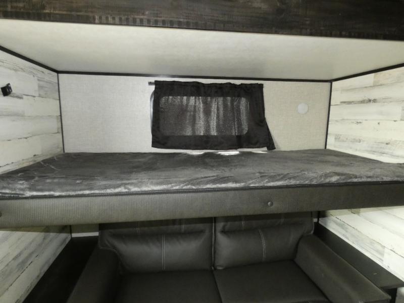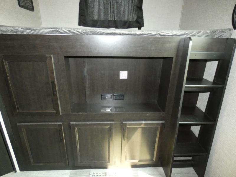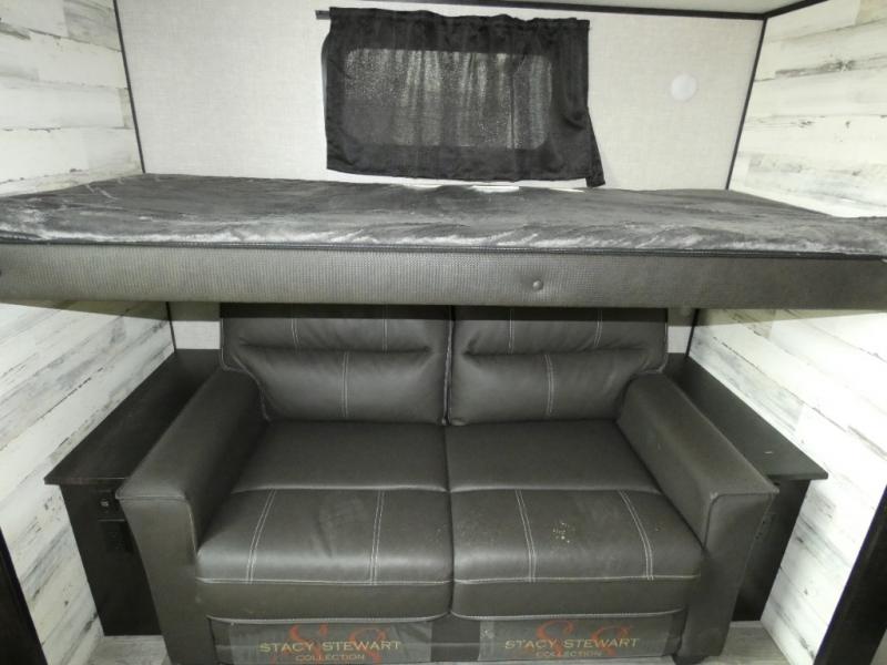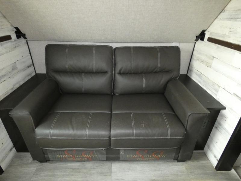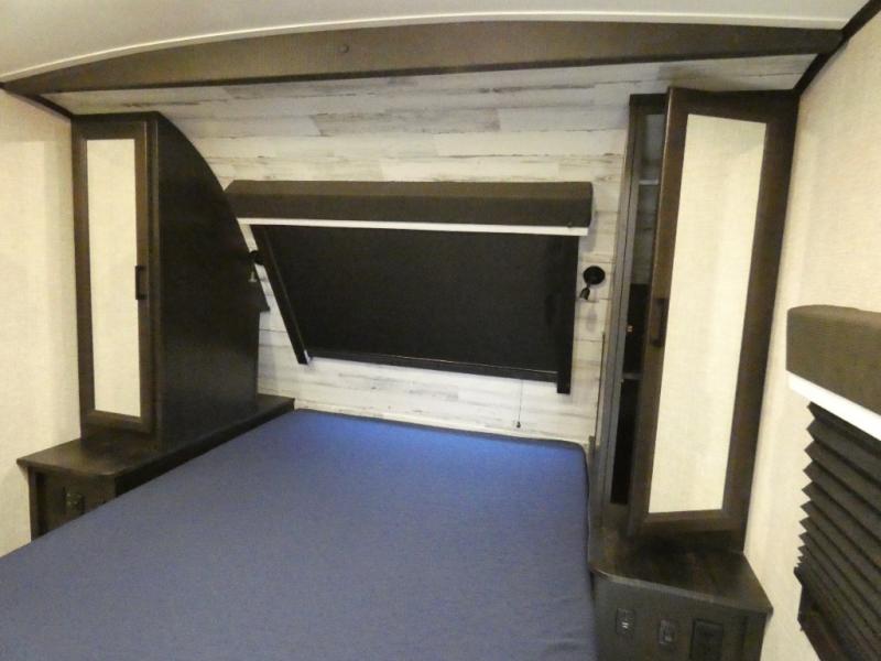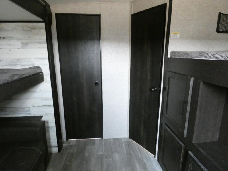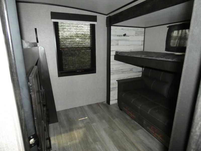 Family camping trips just got sweeter in this double slide out travel trailer that can sleep nine to ten people each night. You will enjoy your own private bedroom up front with a queen bed and three wardrobes. Your guests can make themselves comfortable in the rear private bunkhouse suite that includes two bunks, a tri-fold sofa, plus a convenient half bath! The full bath includes a radius shower with a skylight, a medicine cabinet, plus a linen closet for clean towels. This model includes a three burner cooktop and a microwave oven indoors to prepare meals, plus there is an outdoor kitchen for a sunrise breakfast. There are even two power awnings for maximum protection from the hot summer sun!