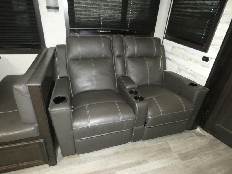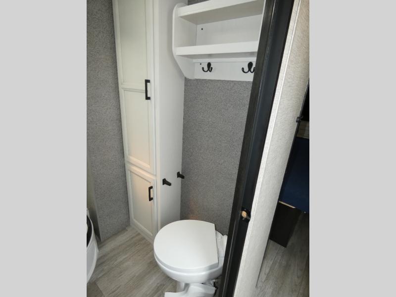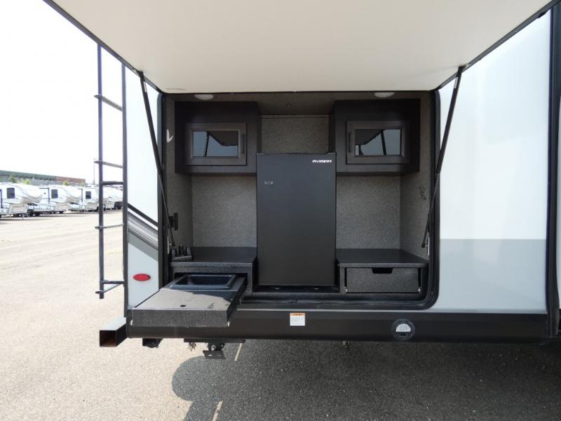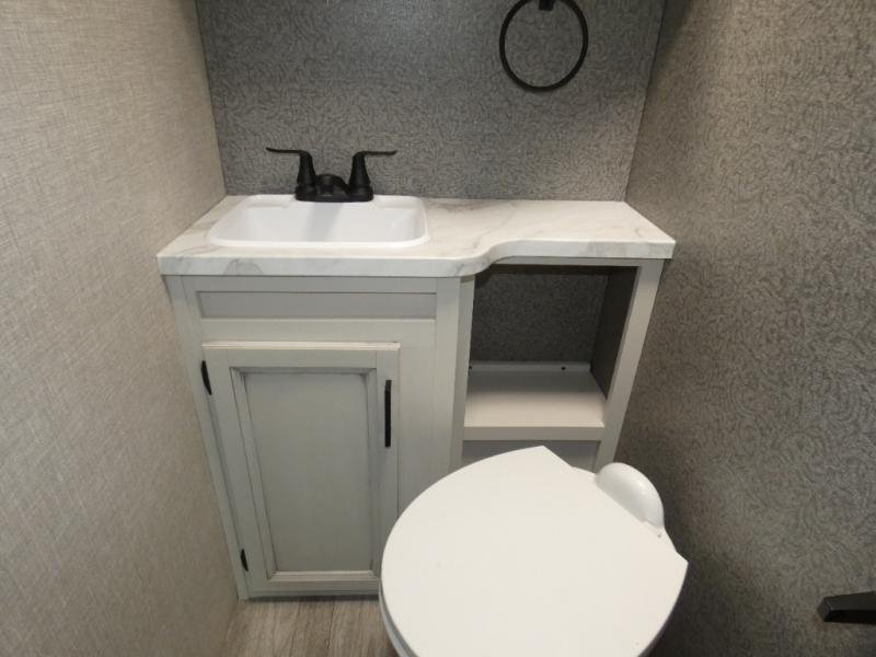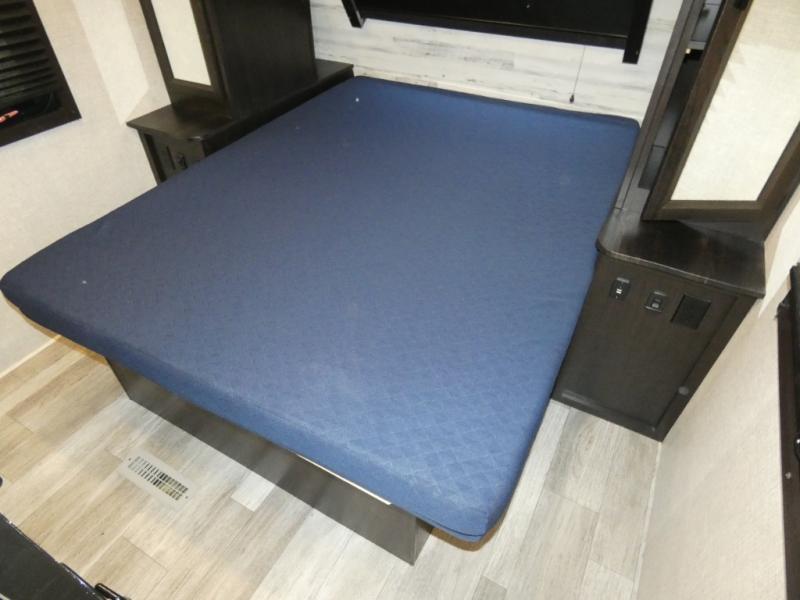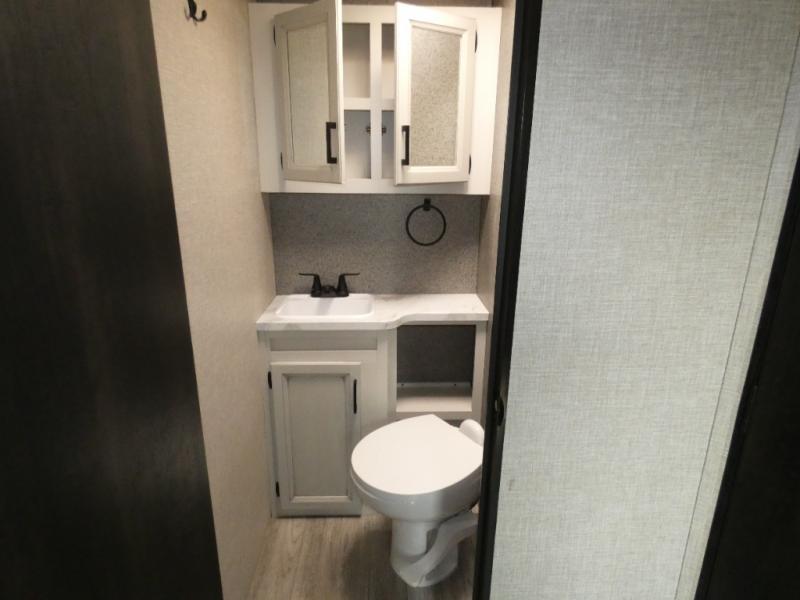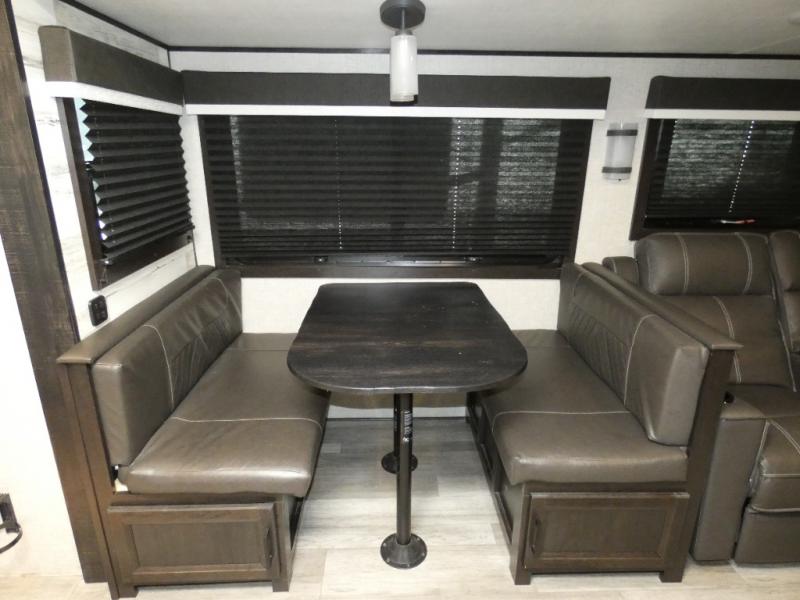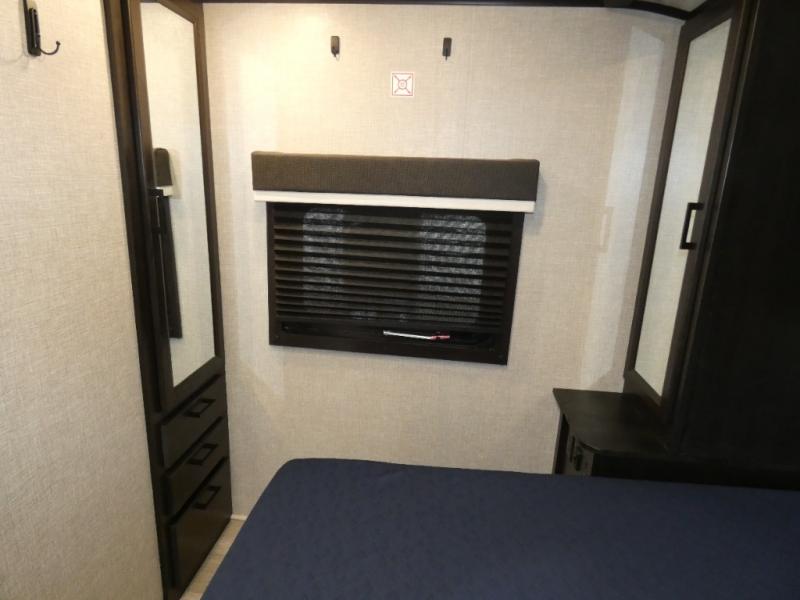 Family camping trips just got sweeter in this double slide out travel trailer that can sleep nine to ten people each night. You will enjoy your own private bedroom up front with a queen bed and three wardrobes. Your guests can make themselves comfortable in the rear private bunkhouse suite that includes two bunks, a tri-fold sofa, plus a convenient half bath! The full bath includes a radius shower with a skylight, a medicine cabinet, plus a linen closet for clean towels. This model includes a three burner cooktop and a microwave oven indoors to prepare meals, plus there is an outdoor kitchen for a sunrise breakfast. There are even two power awnings for maximum protection from the hot summer sun!