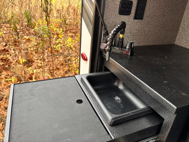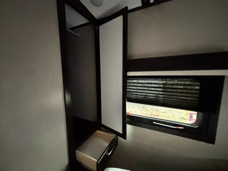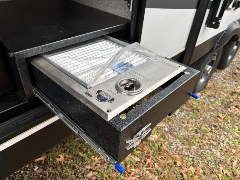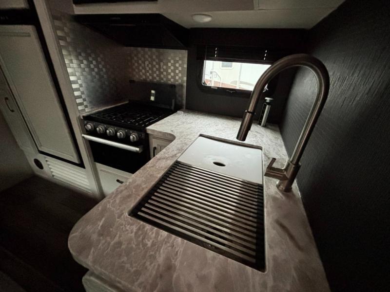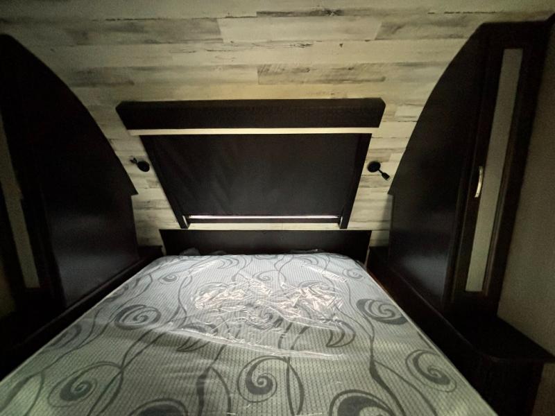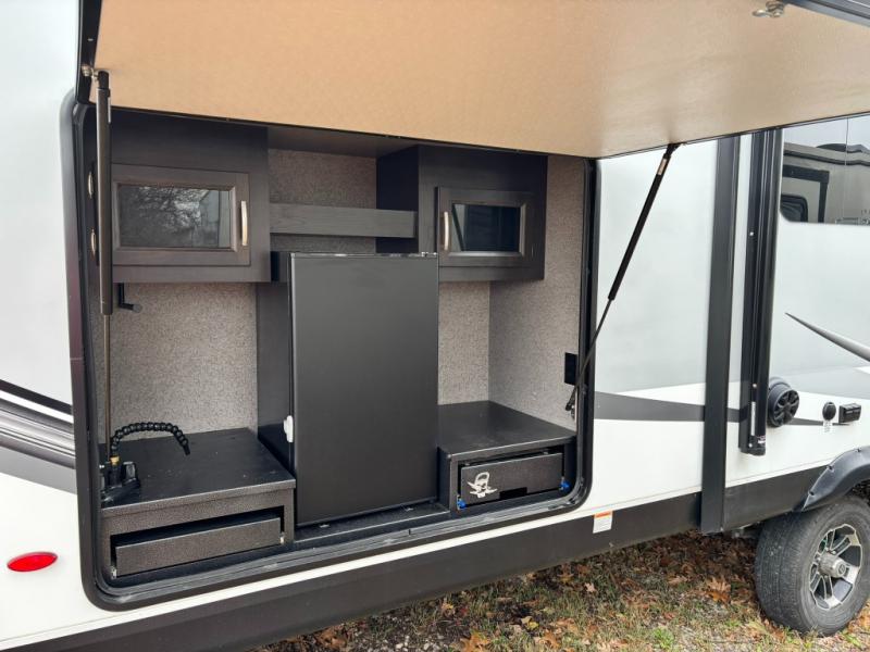 Family camping trips just got sweeter in this double slide out travel trailer that can sleep nine to ten people each night. You will enjoy your own private bedroom up front with a queen bed and three wardrobes. Your guests can make themselves comfortable in the rear private bunkhouse suite that includes two bunks, a tri-fold sofa, plus a convenient half bath! The full bath includes a radius shower with a skylight, a medicine cabinet, plus a linen closet for clean towels. This model includes a three burner cooktop and a microwave oven indoors to prepare meals, plus there is an outdoor kitchen for a sunrise breakfast. There are even two power awnings for maximum protection from the hot summer sun!