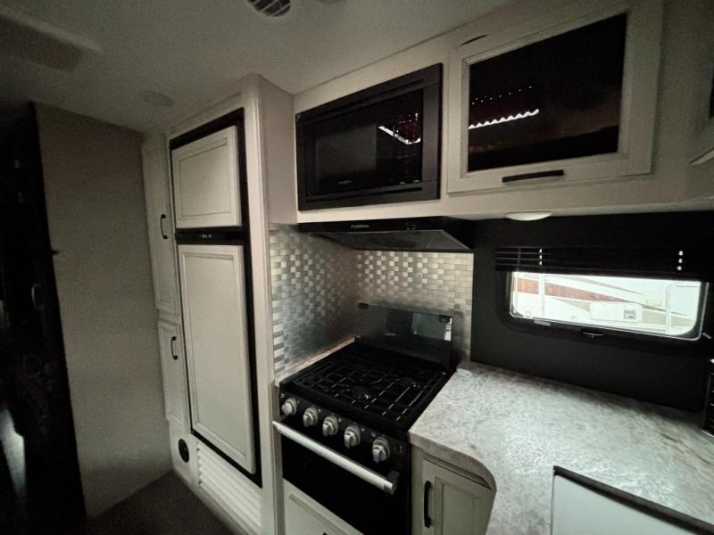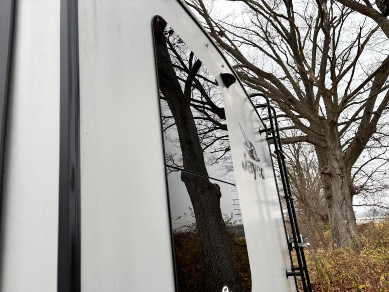 The lightweight White Hawk travel trailers by Jayco will blow you away with their roomy interiors, luxurious amenities, and durable construction. The Magnum Truss Roof System can withstand 50% more weight than the competition, and the Stronghold VBL lamination is the lightest, yet strongest in the industry. Each model includes the JAYCOMMAND "Smart RV" system with a tire pressure monitor system, plus American-made Goodyear tires for maximum durability and carrying capacity. You will love the sleek look of the front molded fiberglass cap with an automotive windshield and blue LED accent lighting, along with the frameless windows and automotive-style aluminum rims. The White Hawk travel trailers also include an arched interior ceiling, a kitchen skylight with a shade, residential vinyl flooring with cold crack resistance, and an electric fireplace.
