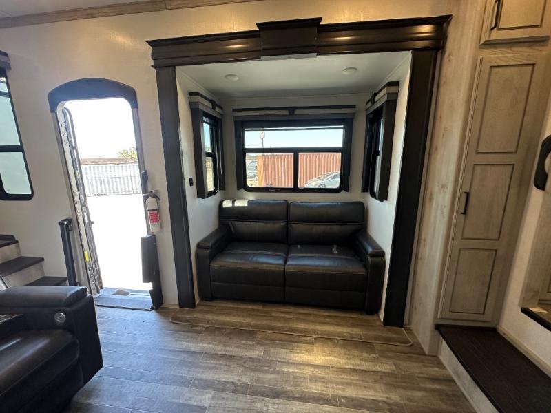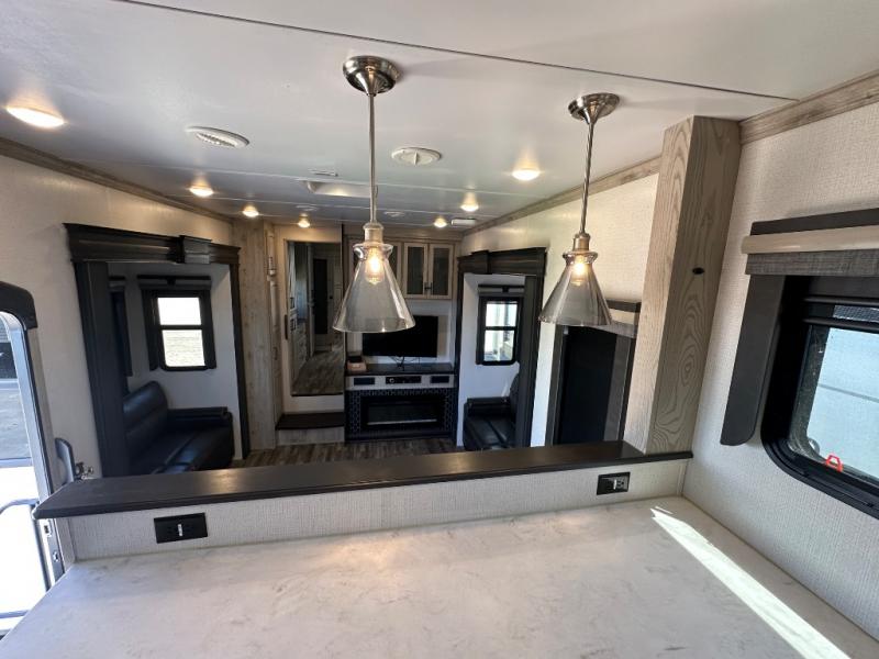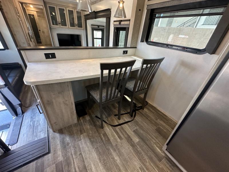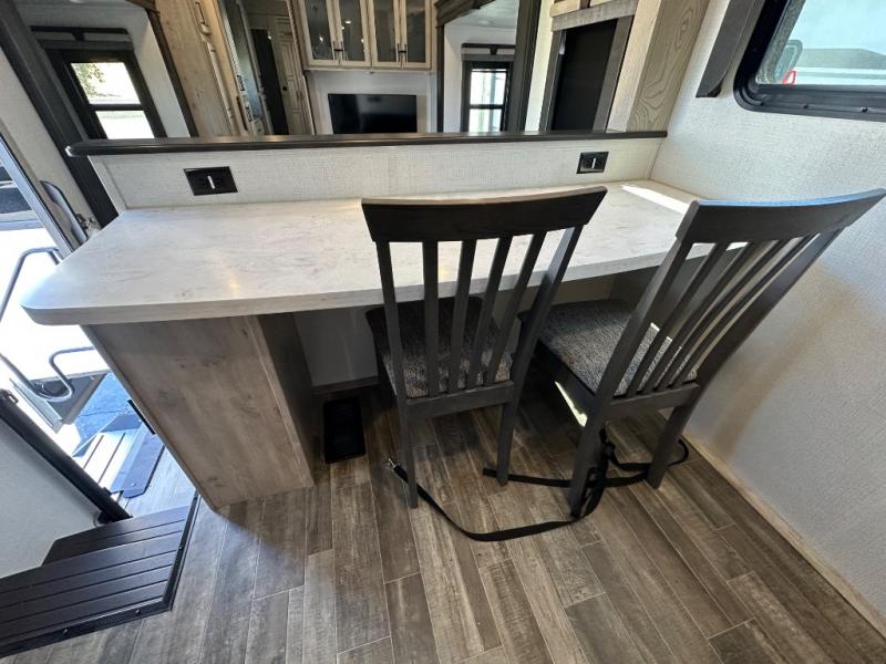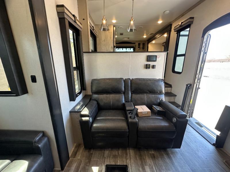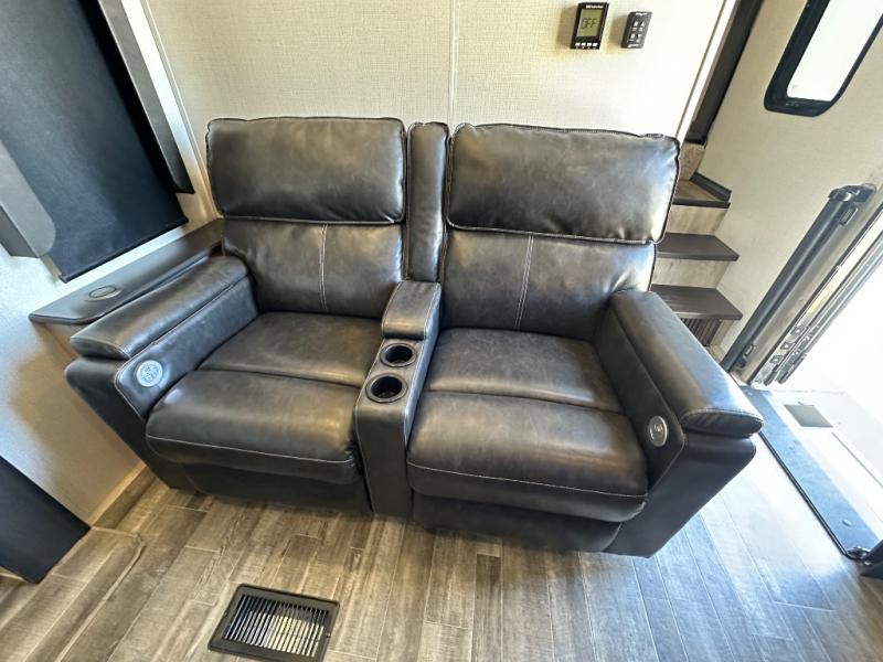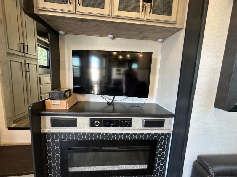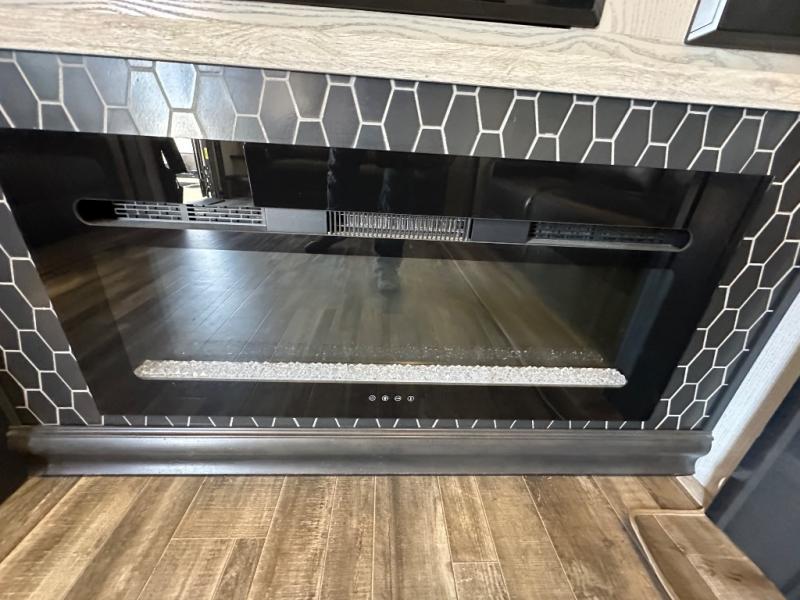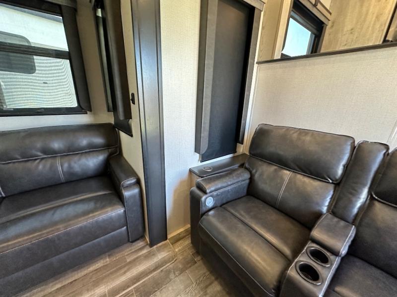 The chef of your group will love cooking in the front kitchen of this fifth wheel! The kitchen not only has extra countertop space to prepare your meals, a convection microwave, and 18 cu. ft. gas/electric refrigerator, but also a bar top with two bar stools overlooking the middle living area. Inside the living area is opposing tri-fold sofa sleeper slides that can be converted for extra sleeping spaces and Thomas Payne theater seating with heat, massage, LED lights, and a USB charging station across from an entertainment center with a 40" fireplace and 50" TV. The master suite has a king bed slide that has storage underneath and a chest with wardrobes on either side, plus access to the full rear bathroom which has a walk-in shower, a dual sink vanity for two to get ready at once, and an area prepped to add an optional washer and dryer!