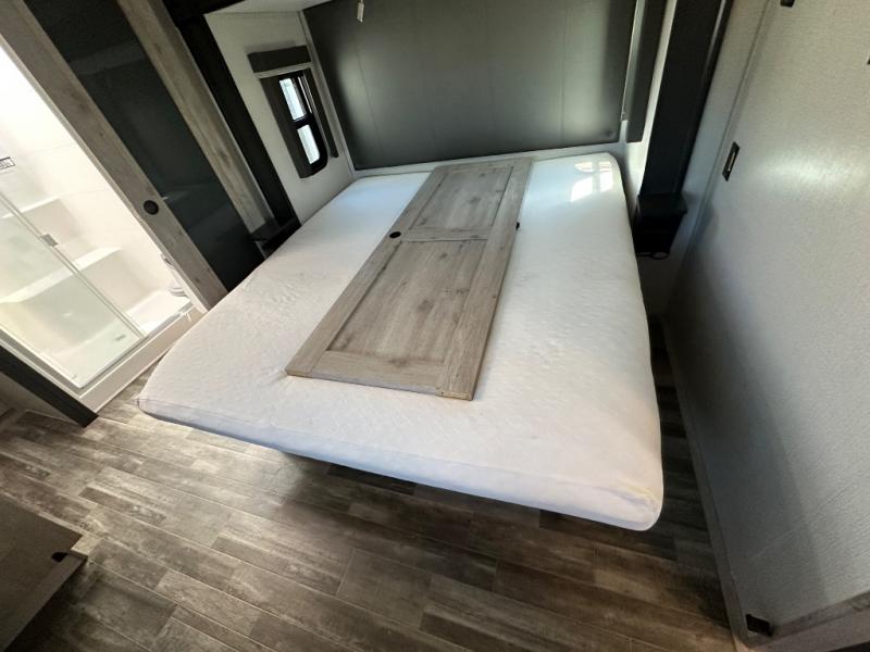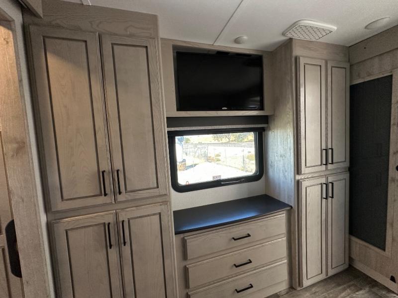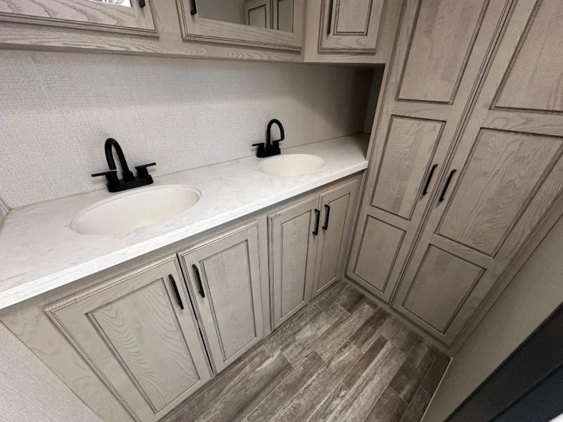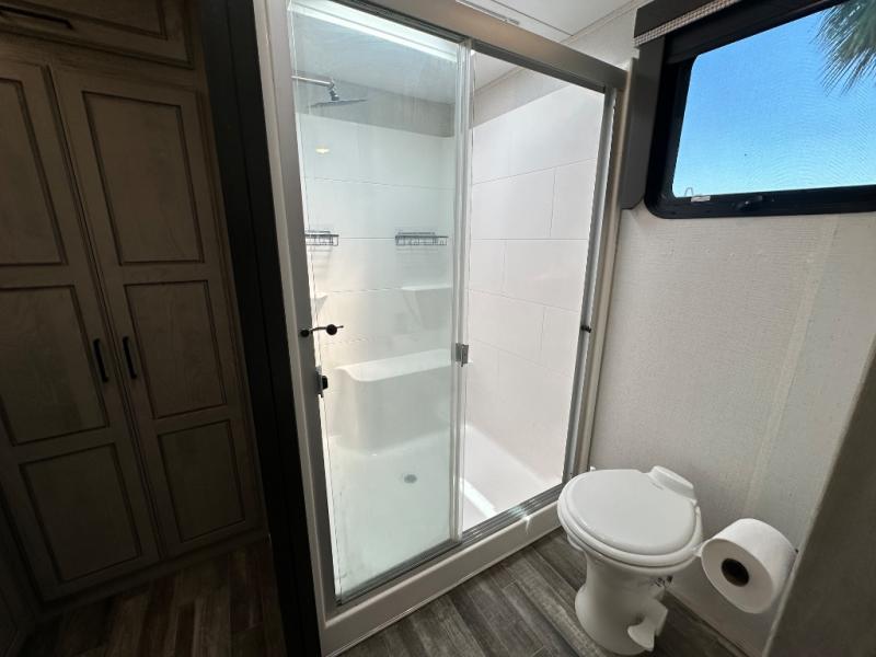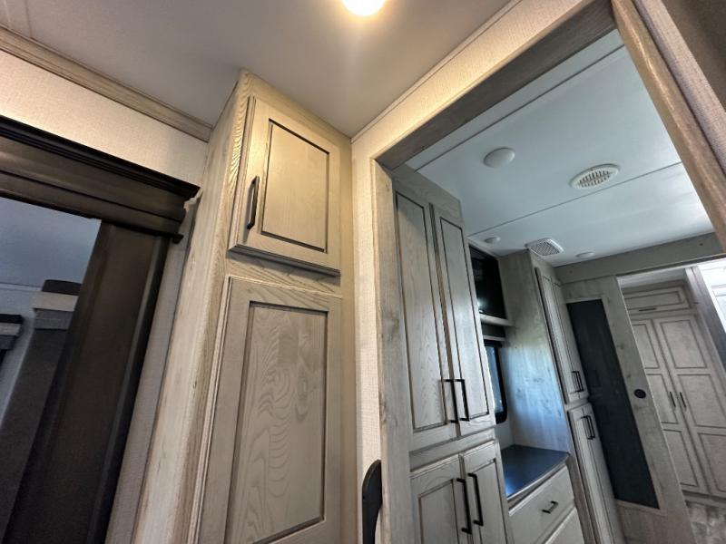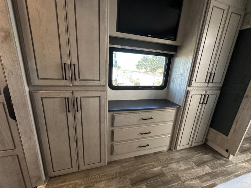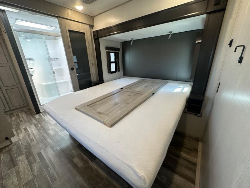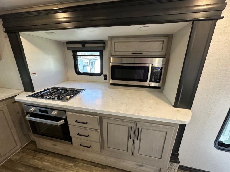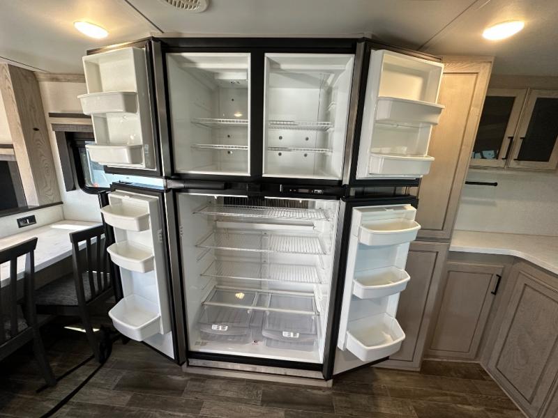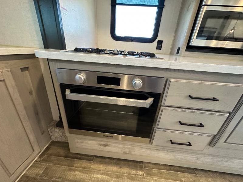 The chef of your group will love cooking in the front kitchen of this fifth wheel! The kitchen not only has extra countertop space to prepare your meals, a convection microwave, and 18 cu. ft. gas/electric refrigerator, but also a bar top with two bar stools overlooking the middle living area. Inside the living area is opposing tri-fold sofa sleeper slides that can be converted for extra sleeping spaces and Thomas Payne theater seating with heat, massage, LED lights, and a USB charging station across from an entertainment center with a 40" fireplace and 50" TV. The master suite has a king bed slide that has storage underneath and a chest with wardrobes on either side, plus access to the full rear bathroom which has a walk-in shower, a dual sink vanity for two to get ready at once, and an area prepped to add an optional washer and dryer!