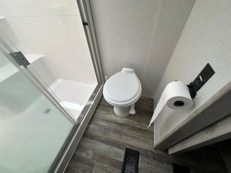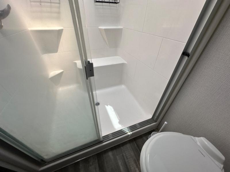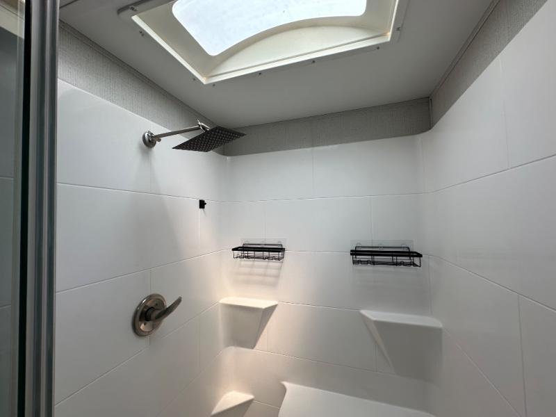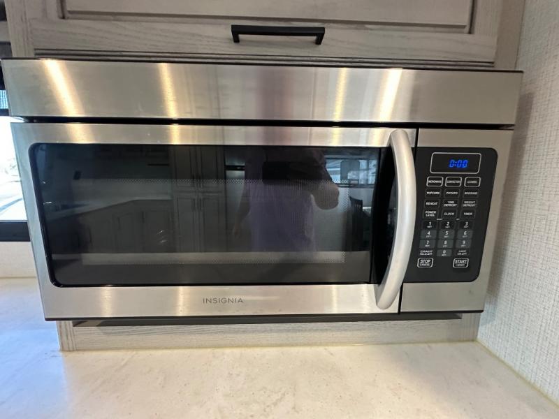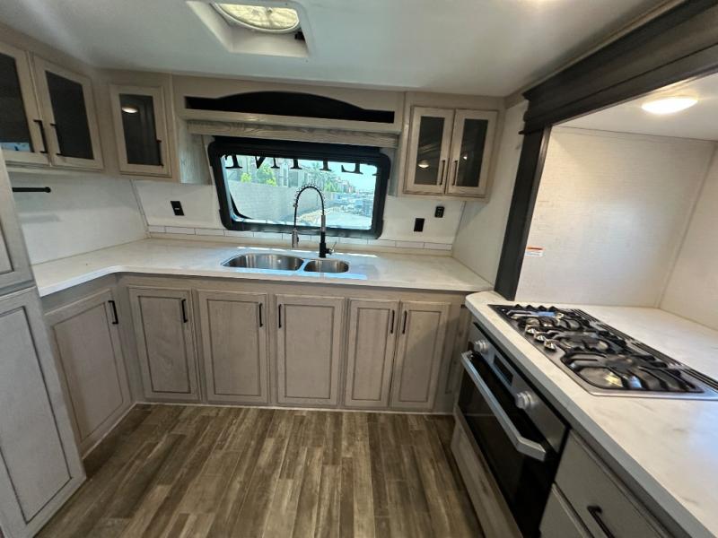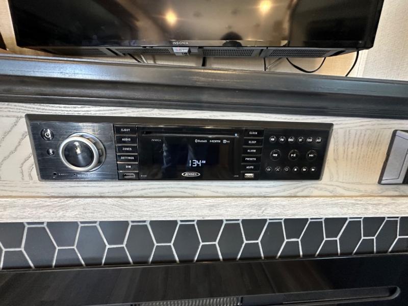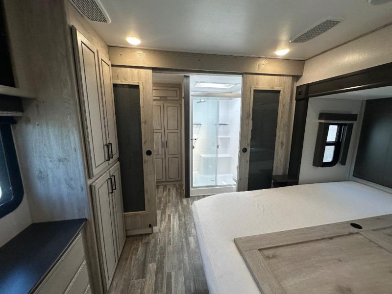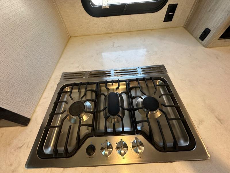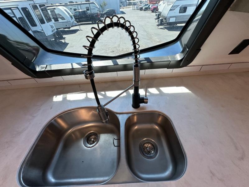 The chef of your group will love cooking in the front kitchen of this fifth wheel! The kitchen not only has extra countertop space to prepare your meals, a convection microwave, and 18 cu. ft. gas/electric refrigerator, but also a bar top with two bar stools overlooking the middle living area. Inside the living area is opposing tri-fold sofa sleeper slides that can be converted for extra sleeping spaces and Thomas Payne theater seating with heat, massage, LED lights, and a USB charging station across from an entertainment center with a 40" fireplace and 50" TV. The master suite has a king bed slide that has storage underneath and a chest with wardrobes on either side, plus access to the full rear bathroom which has a walk-in shower, a dual sink vanity for two to get ready at once, and an area prepped to add an optional washer and dryer!