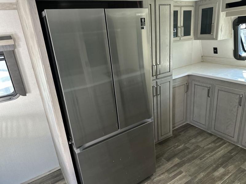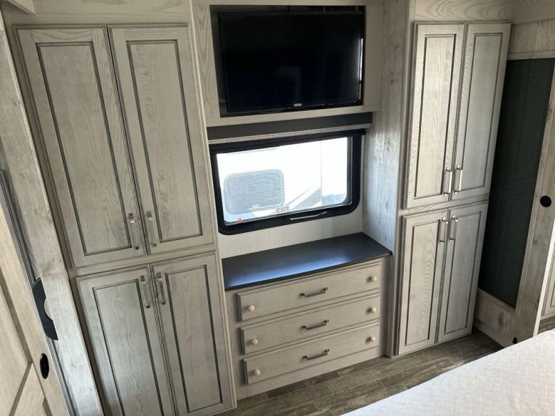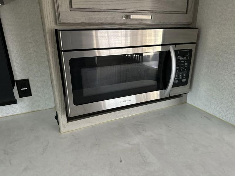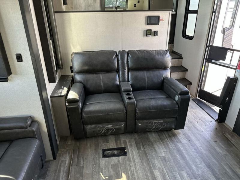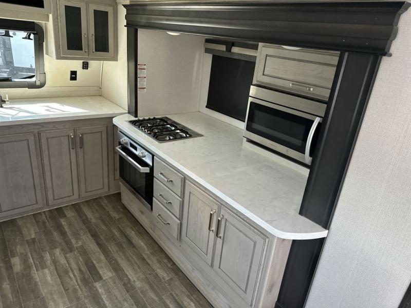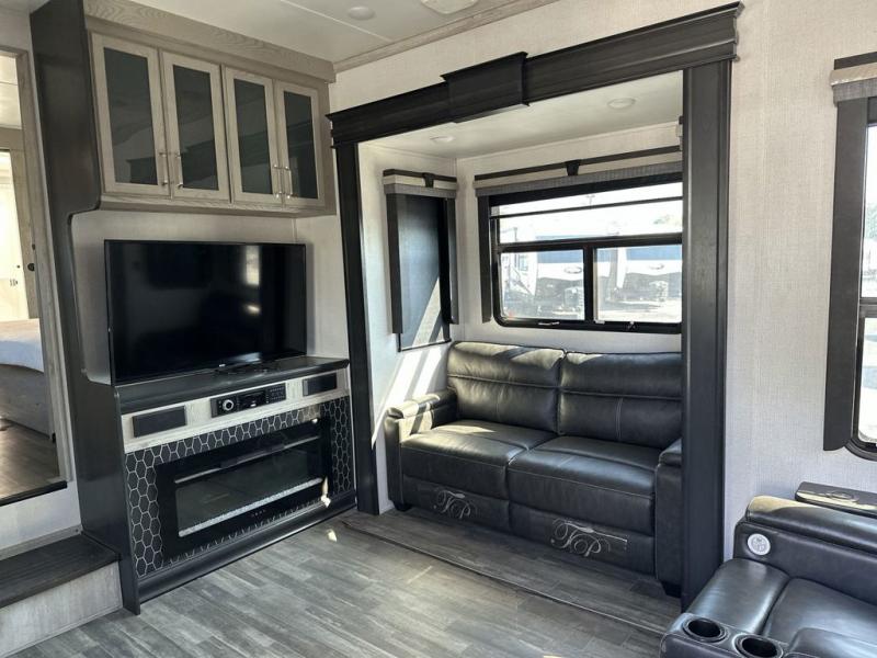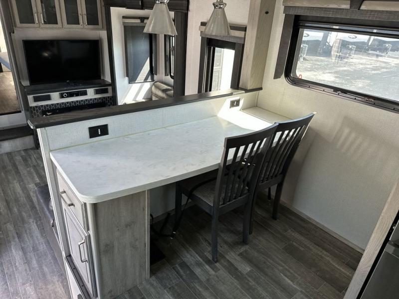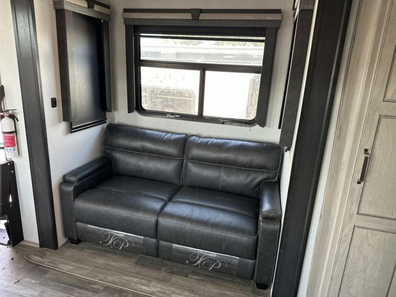 The chef of your group will love cooking in the front kitchen of this fifth wheel! The kitchen not only has extra countertop space to prepare your meals, a convection microwave, and 18 cu. ft. gas/electric refrigerator, but also a bar top with two bar stools overlooking the middle living area. Inside the living area is opposing tri-fold sofa sleeper slides that can be converted for extra sleeping spaces and Thomas Payne theater seating with heat, massage, LED lights, and a USB charging station across from an entertainment center with a 40" fireplace and 50" TV. The master suite has a king bed slide that has storage underneath and a chest with wardrobes on either side, plus access to the full rear bathroom which has a walk-in shower, a dual sink vanity for two to get ready at once, and an area prepped to add an optional washer and dryer!