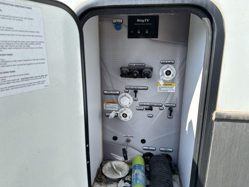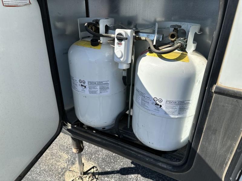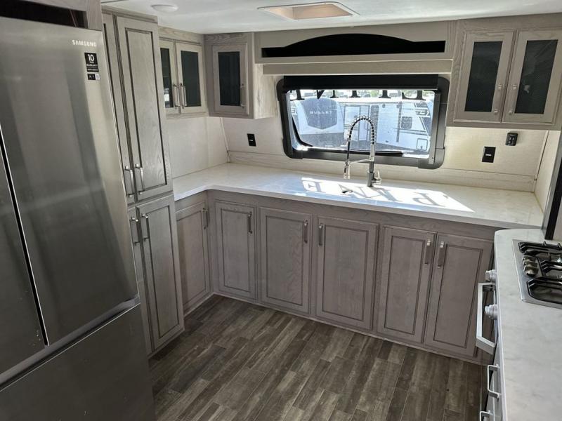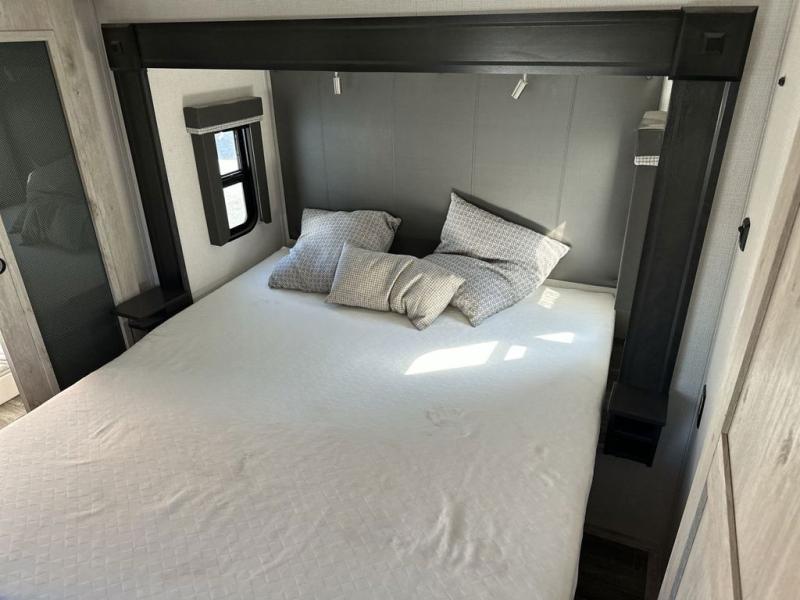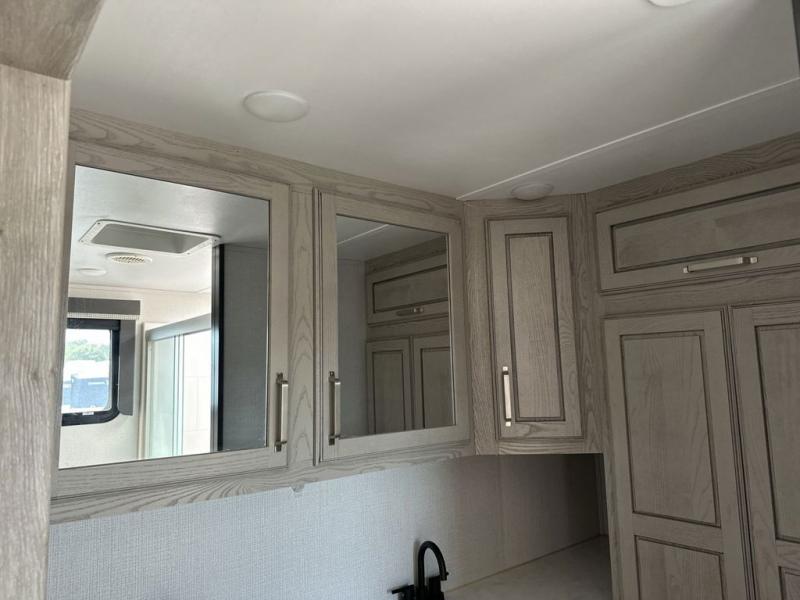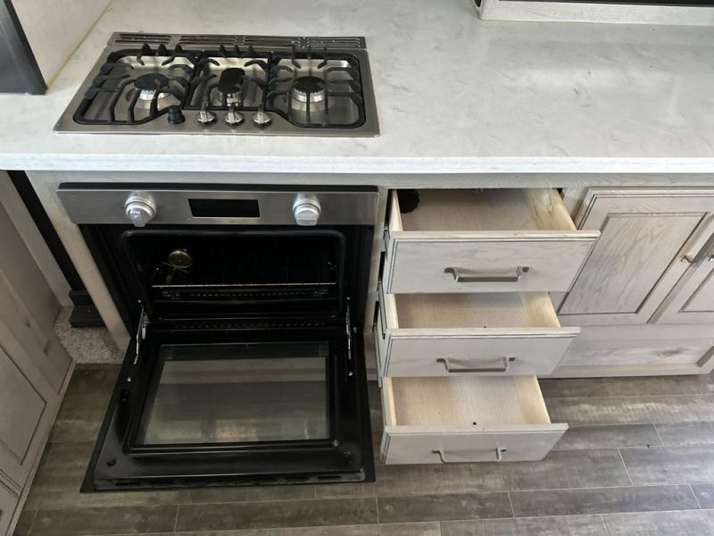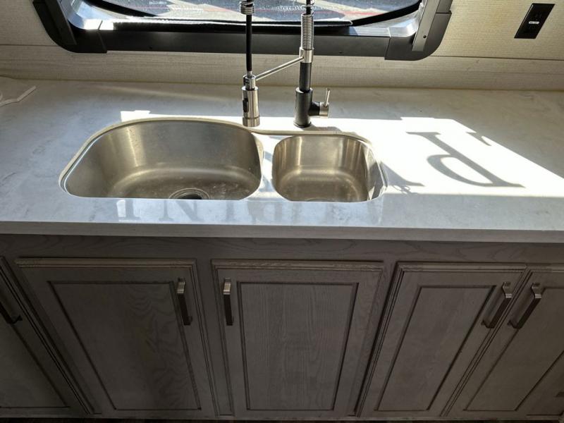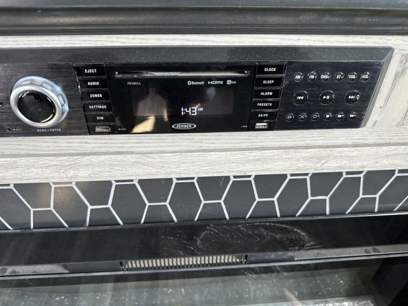 The chef of your group will love cooking in the front kitchen of this fifth wheel! The kitchen not only has extra countertop space to prepare your meals, a convection microwave, and 18 cu. ft. gas/electric refrigerator, but also a bar top with two bar stools overlooking the middle living area. Inside the living area is opposing tri-fold sofa sleeper slides that can be converted for extra sleeping spaces and Thomas Payne theater seating with heat, massage, LED lights, and a USB charging station across from an entertainment center with a 40" fireplace and 50" TV. The master suite has a king bed slide that has storage underneath and a chest with wardrobes on either side, plus access to the full rear bathroom which has a walk-in shower, a dual sink vanity for two to get ready at once, and an area prepped to add an optional washer and dryer!