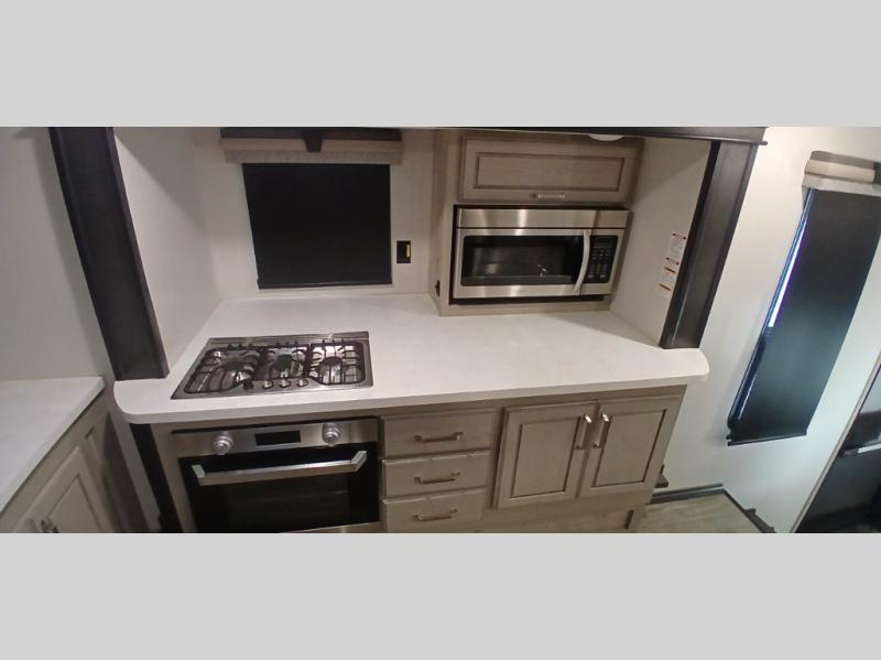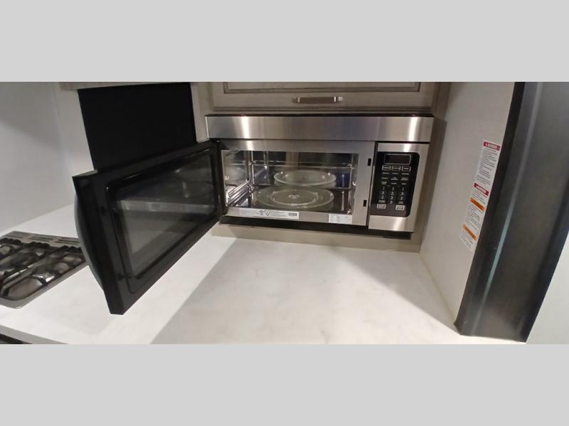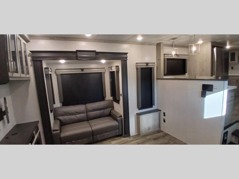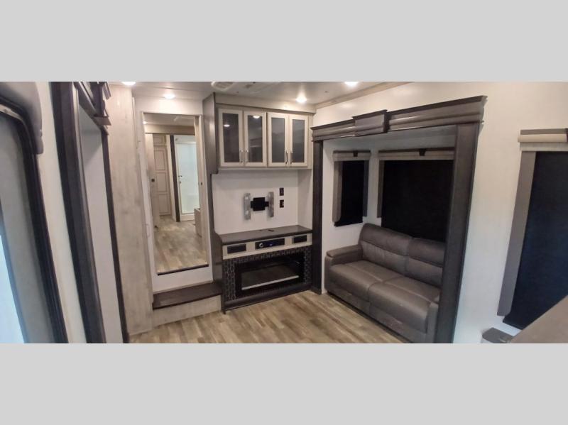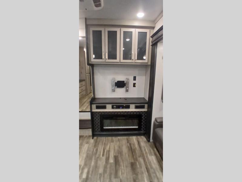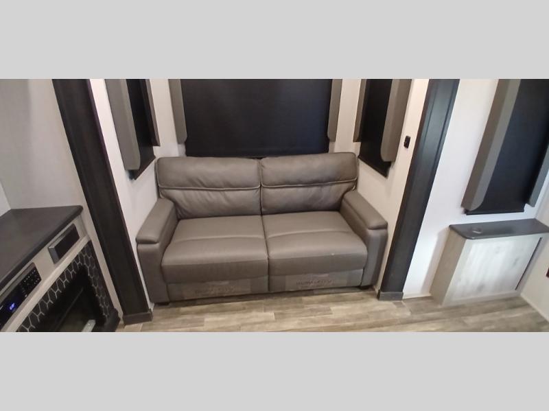 The chef of your group will love cooking in the front kitchen of this fifth wheel! The kitchen not only has extra countertop space to prepare your meals, a convection microwave, and 18 cu. ft. gas/electric refrigerator, but also a bar top with two bar stools overlooking the middle living area. Inside the living area is opposing tri-fold sofa sleeper slides that can be converted for extra sleeping spaces and Thomas Payne theater seating with heat, massage, LED lights, and a USB charging station across from an entertainment center with a 40" fireplace and 50" TV. The master suite has a king bed slide that has storage underneath and a chest with wardrobes on either side, plus access to the full rear bathroom which has a walk-in shower, a dual sink vanity for two to get ready at once, and an area prepped to add an optional washer and dryer!