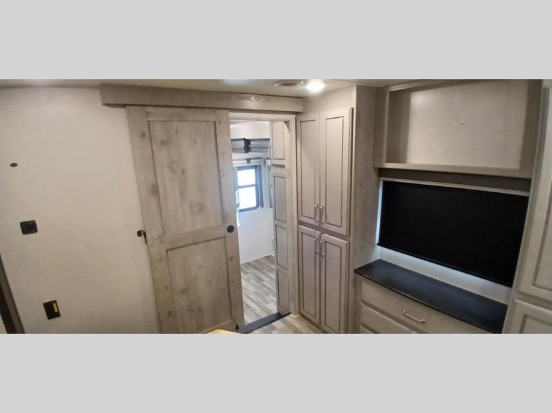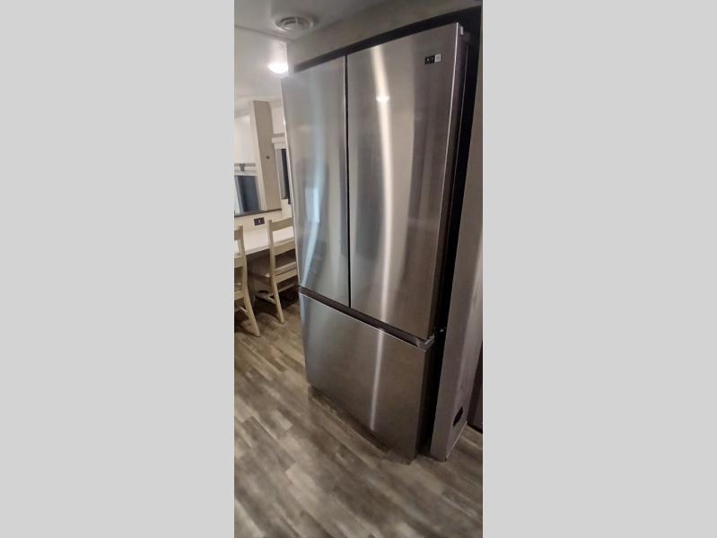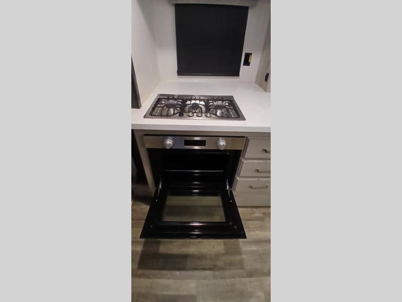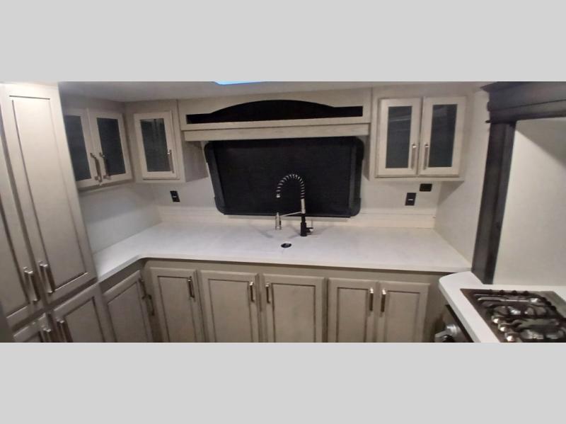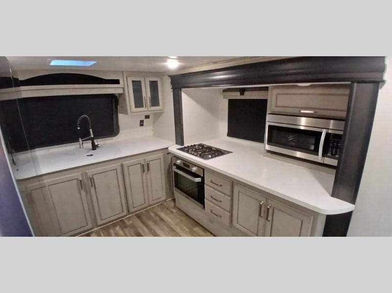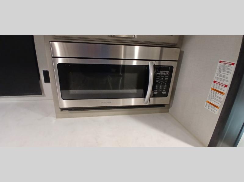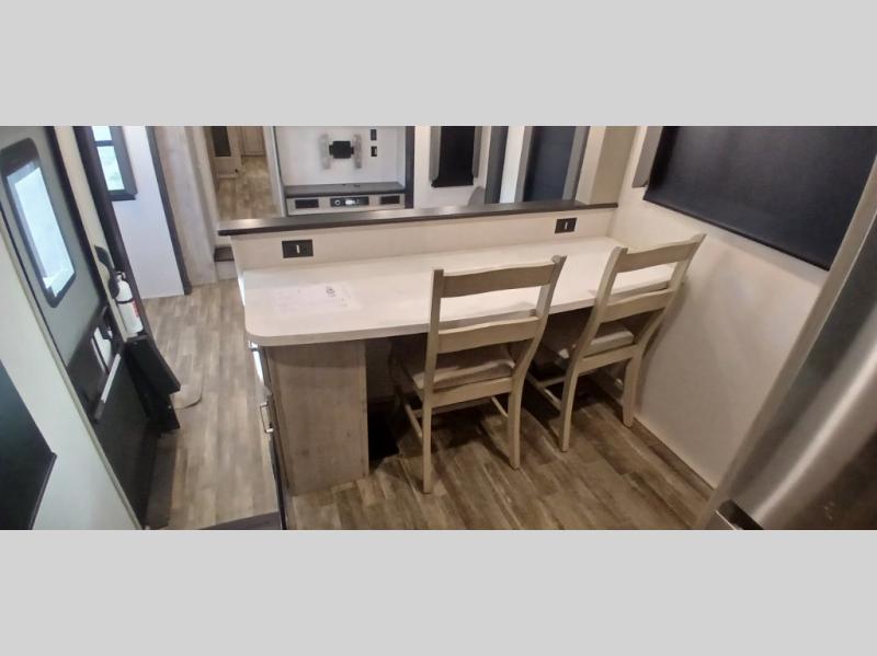 The chef of your group will love cooking in the front kitchen of this fifth wheel! The kitchen not only has extra countertop space to prepare your meals, a convection microwave, and 18 cu. ft. gas/electric refrigerator, but also a bar top with two bar stools overlooking the middle living area. Inside the living area is opposing tri-fold sofa sleeper slides that can be converted for extra sleeping spaces and Thomas Payne theater seating with heat, massage, LED lights, and a USB charging station across from an entertainment center with a 40" fireplace and 50" TV. The master suite has a king bed slide that has storage underneath and a chest with wardrobes on either side, plus access to the full rear bathroom which has a walk-in shower, a dual sink vanity for two to get ready at once, and an area prepped to add an optional washer and dryer!