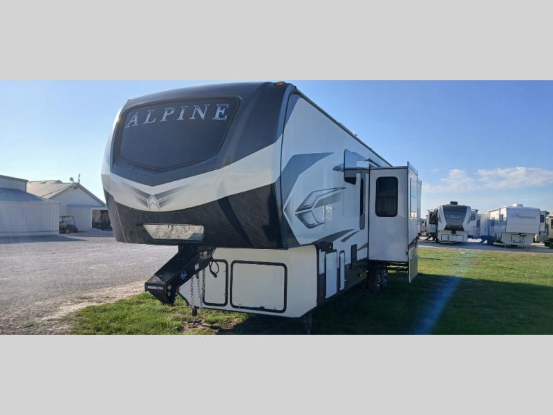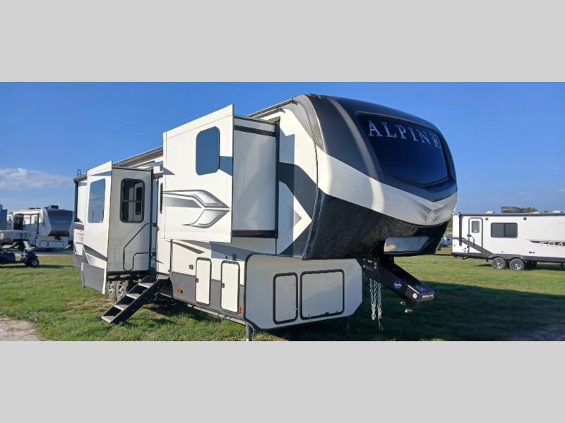 Luxury is not an option, it is a standard with each one of these Keystone RV Alpine fifth wheels! A 100" wide body construction, almost 7' tall slides, high ceilings, and panoramic frameless windows create an open, residential feeling. The Tru-Fit slide construction is more durable and minimizes motor structural stress, as well as resists leaking. Exclusive 12V color-coded wiring is different from conventional RV wiring in that it is easy to trace and clearly labeled to help savvy owners with DIY diagnosis/repair and helps dealer service techs troubleshoot/repair quickly which saves you time and money. The in-floor heat vents run straight through the unit and are typically positioned in low-traffic areas just like in your home for a more efficient air flow, plus it helps to keep the cabinet storage space. Come find your favorite model today!