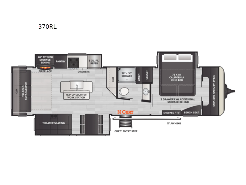 Camp in comfort with this travel trailer in tow! Once you arrive at the campground, set up the 11' power awning and enjoy a cold drink before heading out for the day. The chef of your group can prepare lunch at the kitchen island that includes a flip-up counter workstation, while the little ones play a game at the free-standing table. There is also theater seating here and a 40" TV with a fireplace for those cooler fall evenings. When it's time to call it a night, you will love the slide out California king bed with two drawers underneath, plus additional storage behind the drawers. There is a walk-in closet with wrap-around shelving, plus a bench seat and even more shelves for all your valuables.