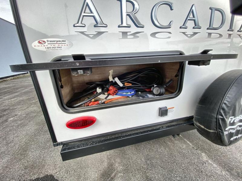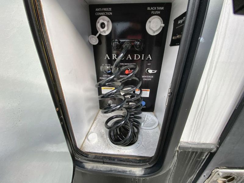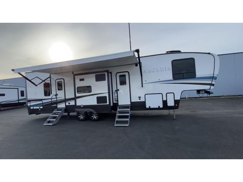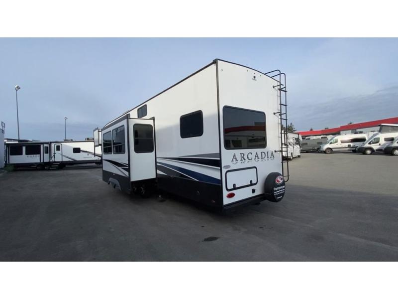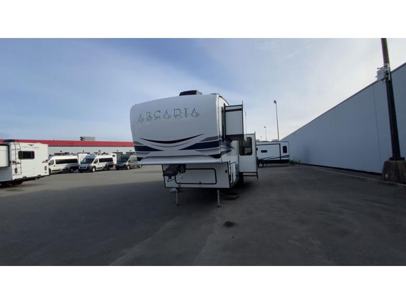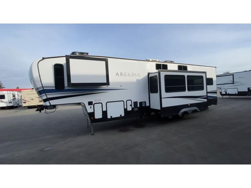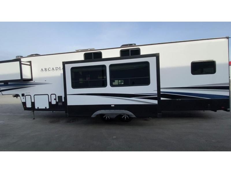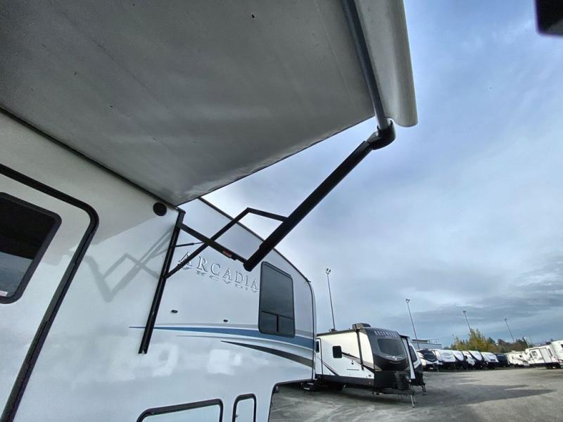 It's time to camp better with Keystone, and the Arcadia travel trailers and 3/4 ton fifth wheels allow you to do just that! There are many features that come standard you are sure to appreciate, like the Blade high-performance air flow system, the Tru-Fit slide construction, and the durable Hyper Deck flooring. Each model features the Curt Performance Package with HD axles with reinforced axle wall tube, HD forward self-adjusting brake assembly, a rubberized equalization suspension system, and more to create a smooth towing experience. You will enjoy an HD flat screen TV included with each model, plus there is a Winegard AIR 360 amplified omni-directional antenna and satellite and cable prep on all TV's to keep you entertained throughout your camping trips. The Arcadia kitchen features custom cabinetry with solid wood and painted cabinet doors, oversized drawers for maximum storage space, a stainless steel farmhouse style sink, plus many more comforts.