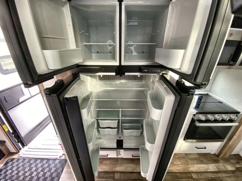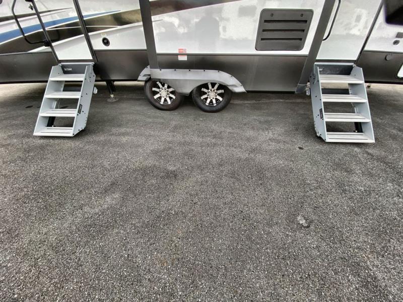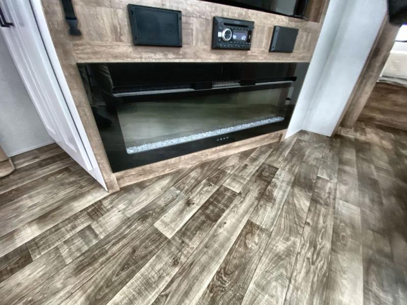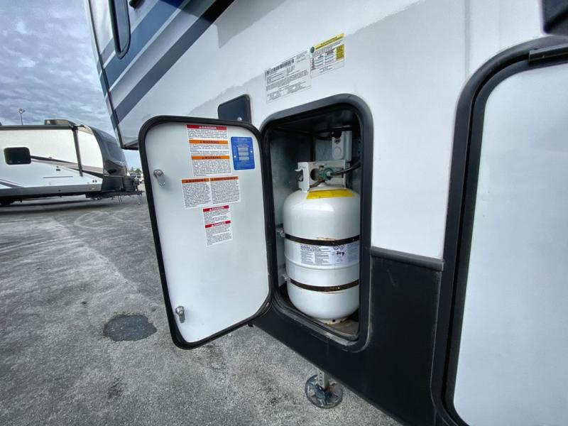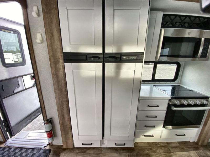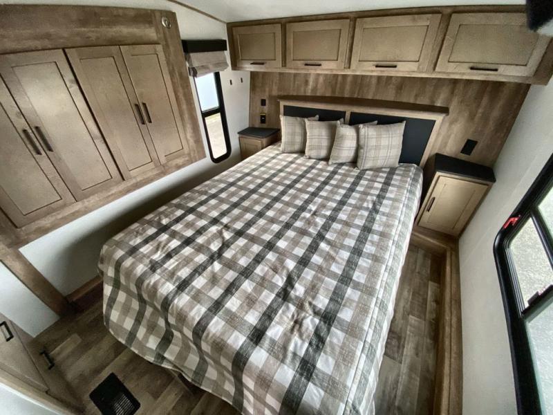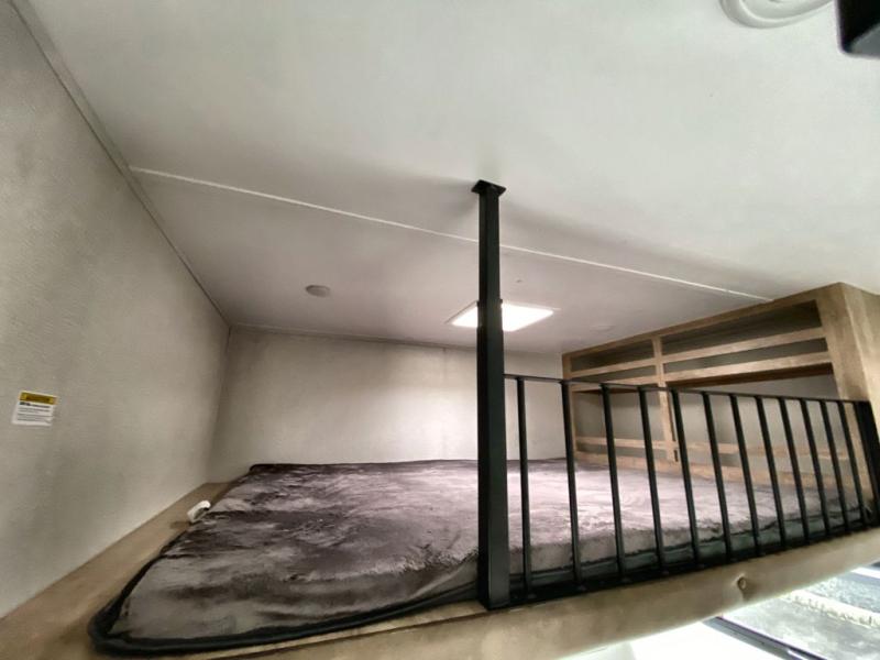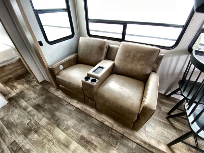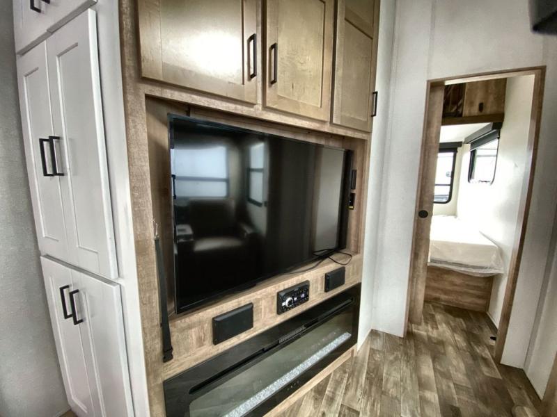 This 3/4 ton fifth wheel with a bath and a half, dual entry doors, plus a loft area will be perfect for camping with family or friends. The bunkhouse suite includes its own half bath, a comfortable bed, with a loft area above with storage and a TV. You will also find rear storage just outside of this room to keep all your hiking gear. Head to the main living area to relax on the theater seating across from the 50" TV and fireplace. The chef of your group will appreciate the kitchen island with a flip-up counter workstation for all the food prep, plus there is additional counter space and a free-standing table with four chairs to dine at. You will feel right at home in the front private bedroom with its queen bed and large slide out wardrobe. This model also includes an outside refrigerator so you can quickly grab a cold drink as you relax in your camp chair!