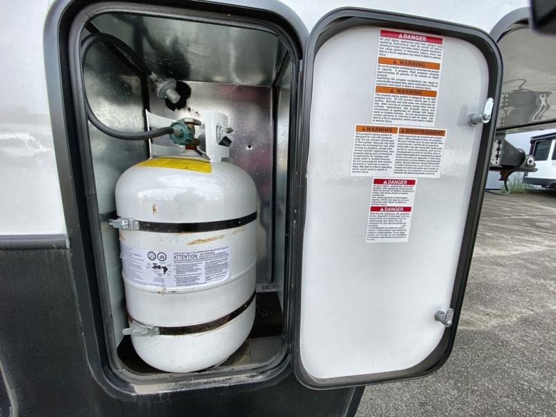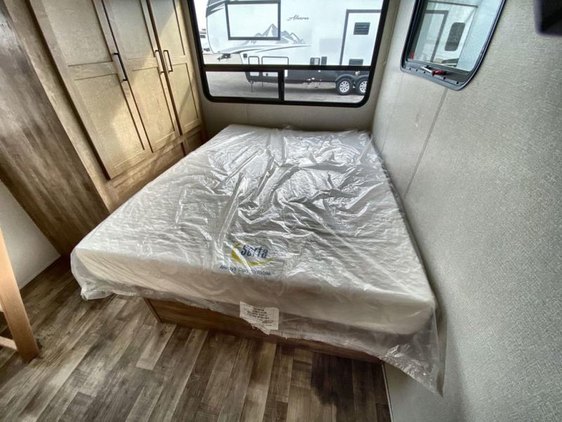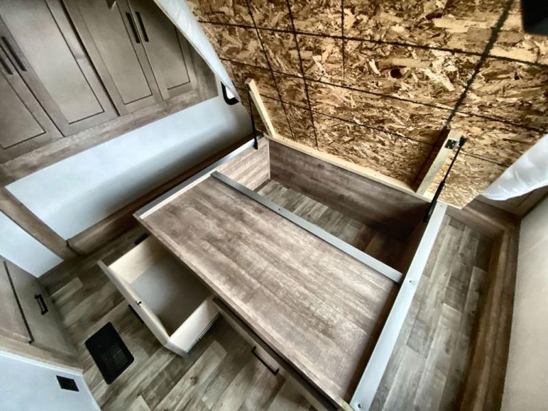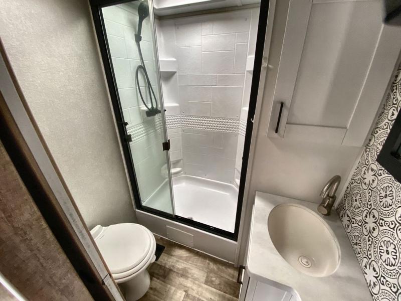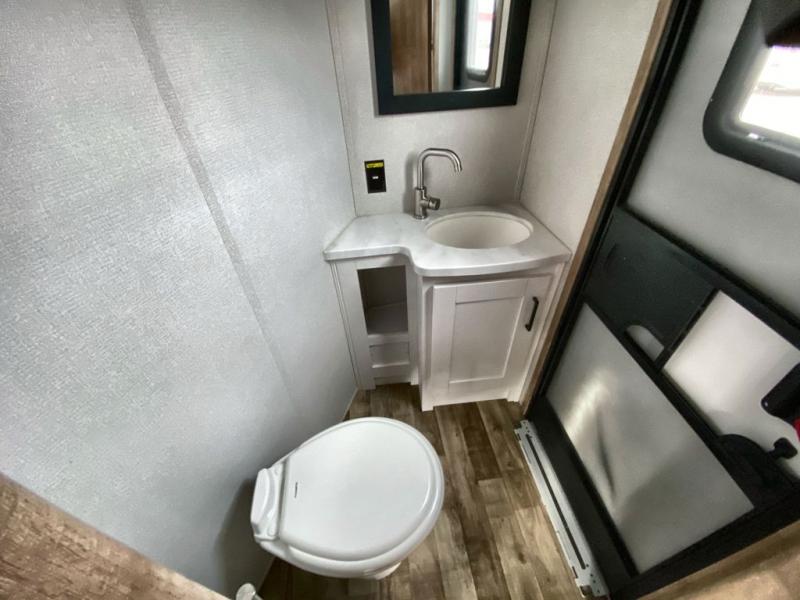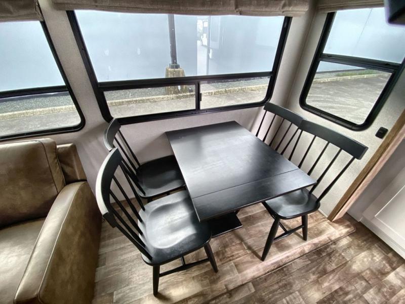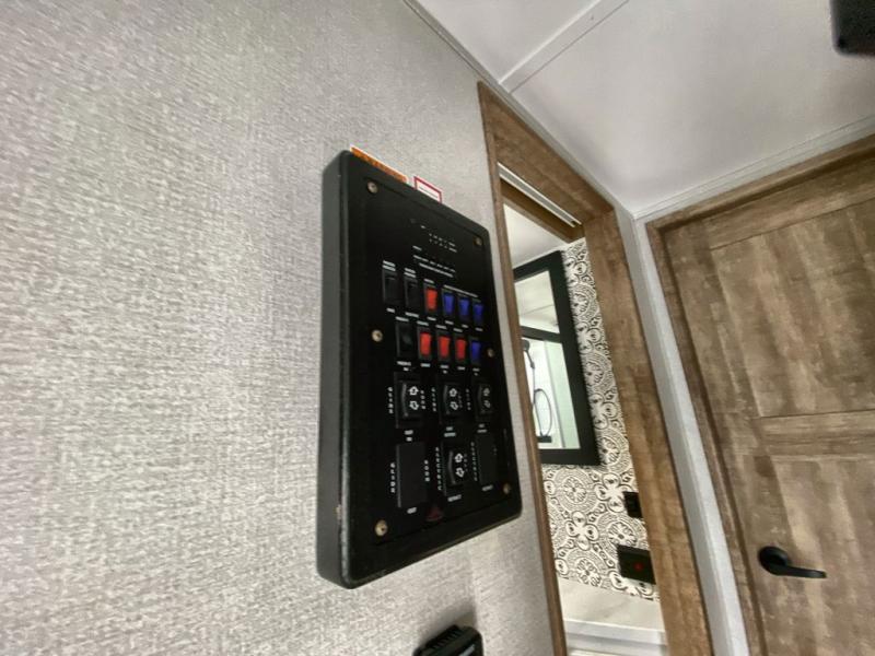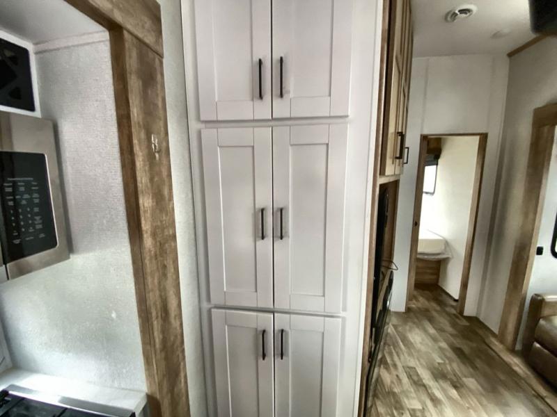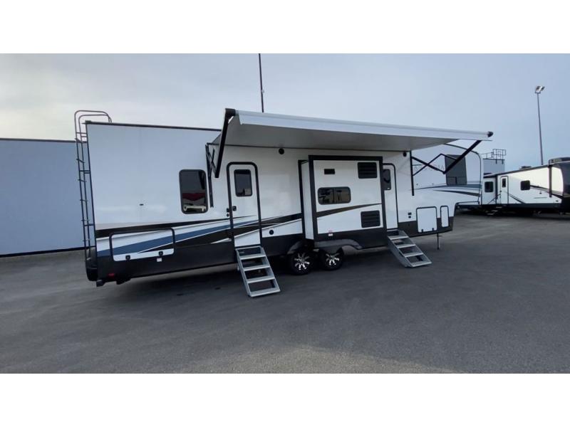 This 3/4 ton fifth wheel with a bath and a half, dual entry doors, plus a loft area will be perfect for camping with family or friends. The bunkhouse suite includes its own half bath, a comfortable bed, with a loft area above with storage and a TV. You will also find rear storage just outside of this room to keep all your hiking gear. Head to the main living area to relax on the theater seating across from the 50" TV and fireplace. The chef of your group will appreciate the kitchen island with a flip-up counter workstation for all the food prep, plus there is additional counter space and a free-standing table with four chairs to dine at. You will feel right at home in the front private bedroom with its queen bed and large slide out wardrobe. This model also includes an outside refrigerator so you can quickly grab a cold drink as you relax in your camp chair!