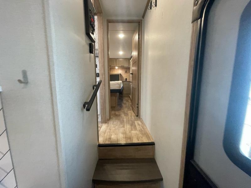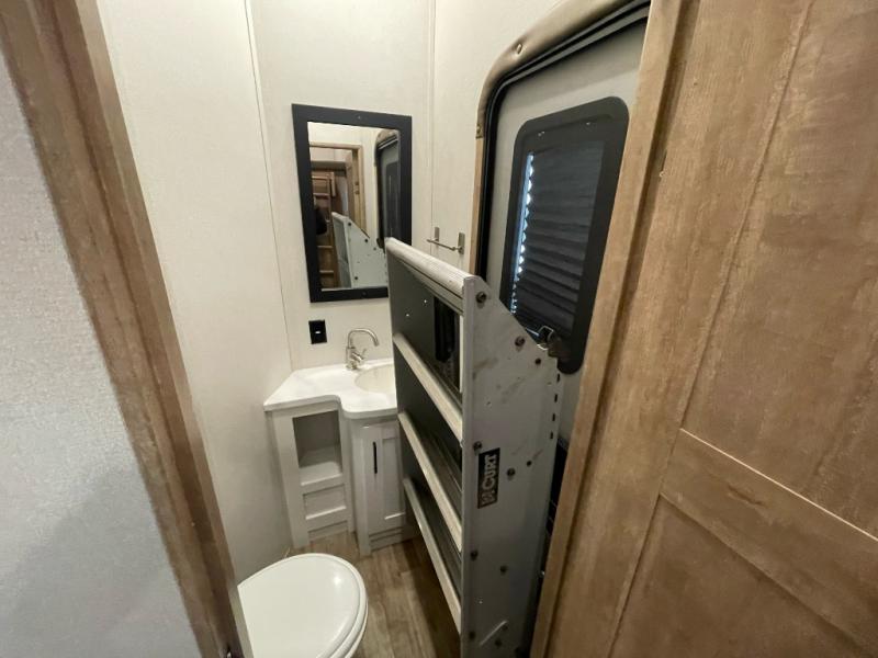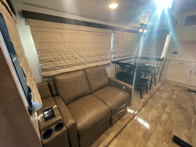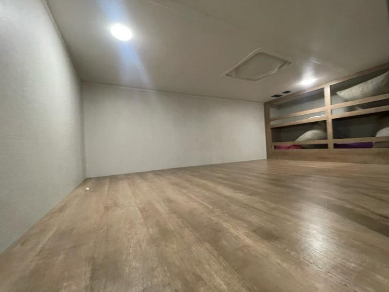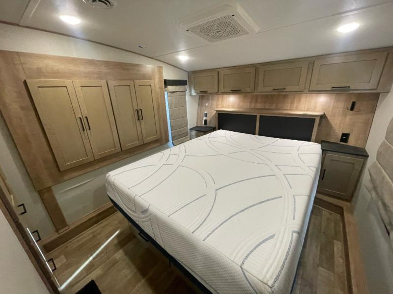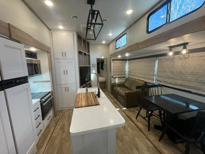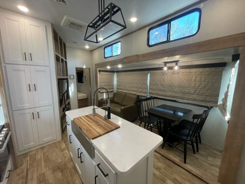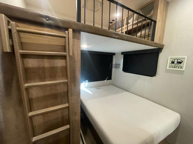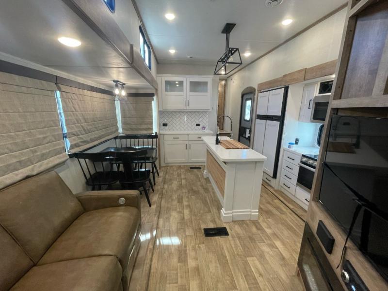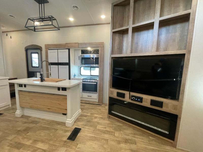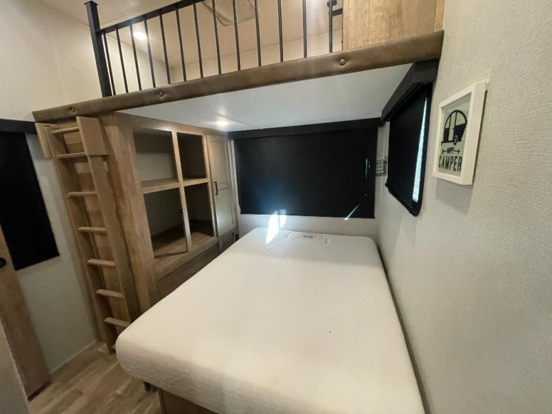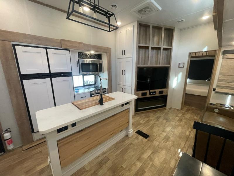 This 3/4 ton fifth wheel with a bath and a half, dual entry doors, plus a loft area will be perfect for camping with family or friends. The bunkhouse suite includes its own half bath, a comfortable bed, with a loft area above with storage and a TV. You will also find rear storage just outside of this room to keep all your hiking gear. Head to the main living area to relax on the theater seating across from the 50" TV and fireplace. The chef of your group will appreciate the kitchen island with a flip-up counter workstation for all the food prep, plus there is additional counter space and a free-standing table with four chairs to dine at. You will feel right at home in the front private bedroom with its queen bed and large slide out wardrobe. This model also includes an outside refrigerator so you can quickly grab a cold drink as you relax in your camp chair!