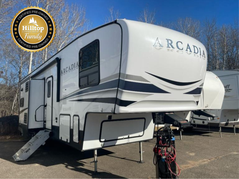 It's time to camp better with Keystone, and the Arcadia travel trailers and 3/4 ton fifth wheels allow you to do just that! There are many features that come standard you are sure to appreciate, like the Blade high-performance air flow system, the Tru-Fit slide construction, and the durable Hyper Deck flooring. Each model features the Curt Performance Package with HD axles with reinforced axle wall tube, HD forward self-adjusting brake assembly, a rubberized equalization suspension system, and more to create a smooth towing experience. You will enjoy an HD flat screen TV included with each model, plus there is a Winegard AIR 360 amplified omni-directional antenna and satellite and cable prep on all TV's to keep you entertained throughout your camping trips. The Arcadia kitchen features custom cabinetry with solid wood and painted cabinet doors, oversized drawers for maximum storage space, a stainless steel farmhouse style sink, plus many more comforts.
