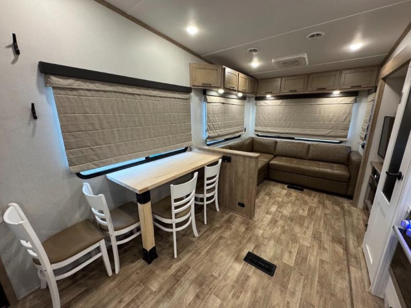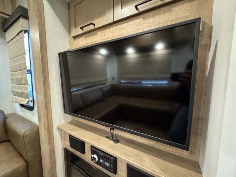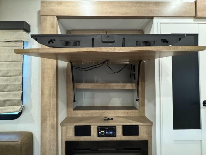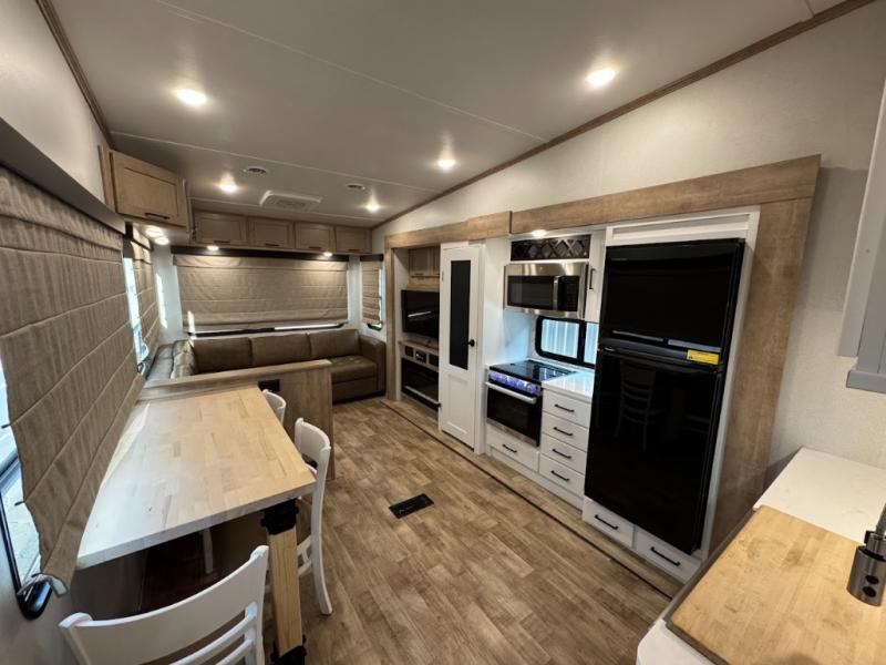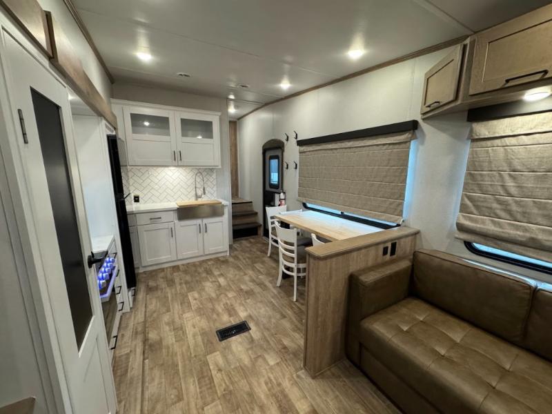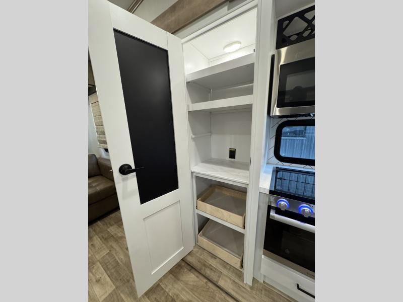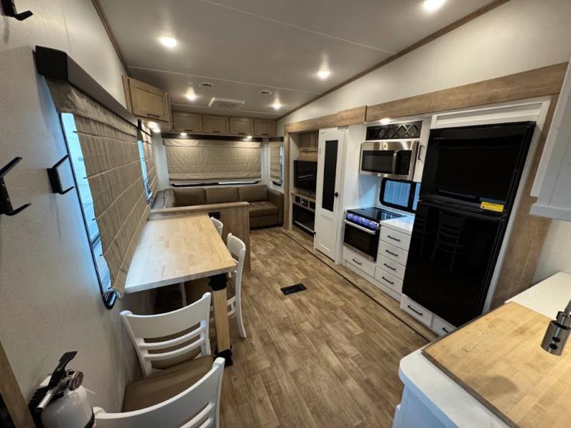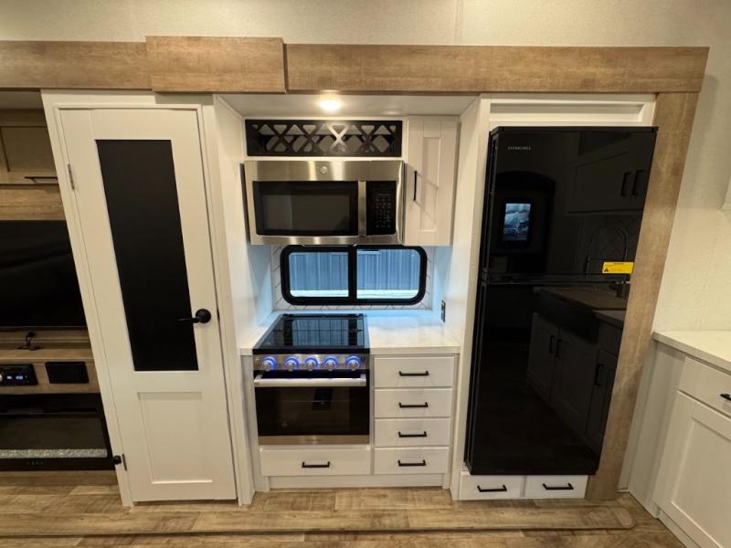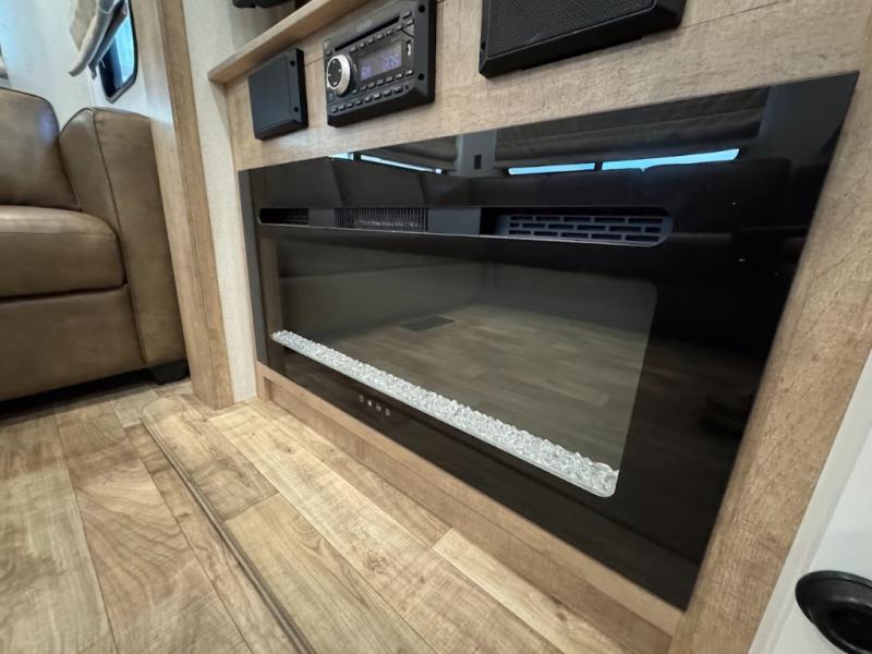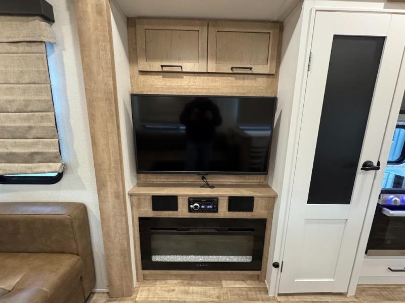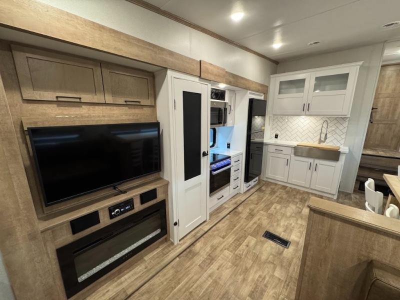 Head to your local state park for fun camping trips in this cozy fifth wheel. Your crew will love relaxing in the rear living area on the sectional sofa with a fireplace and 40" TV nearby. There is a dinette table with bench seating on one side and two chairs on the other if anyone wants to play a board game, or everyone may want to head outdoors to sit under the 17' power awning with LED lights. The kitchen includes everything you need to prepare meals each day, including a residential style range with a 21" oven, a 30" over-the-range residential microwave, plus a large pantry for snacks galore. The front private bedroom includes a queen bed just like at home, and you'll appreciate the two wardrobes, plus under-bed storage for all your items.