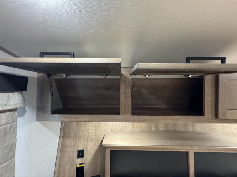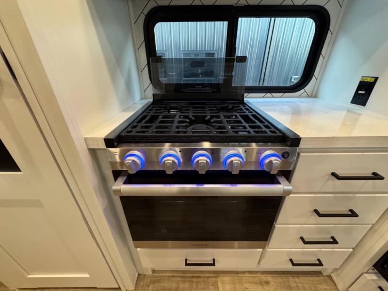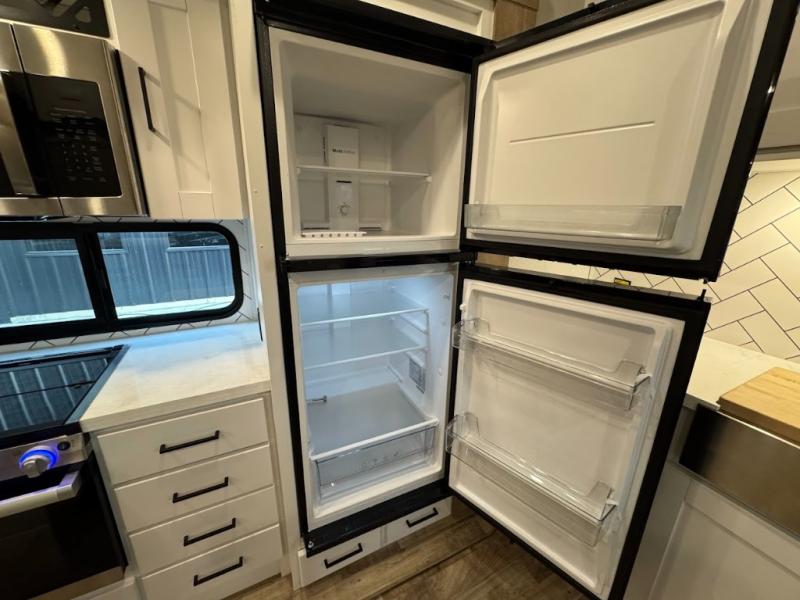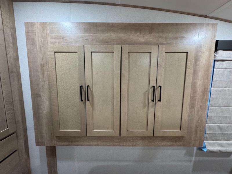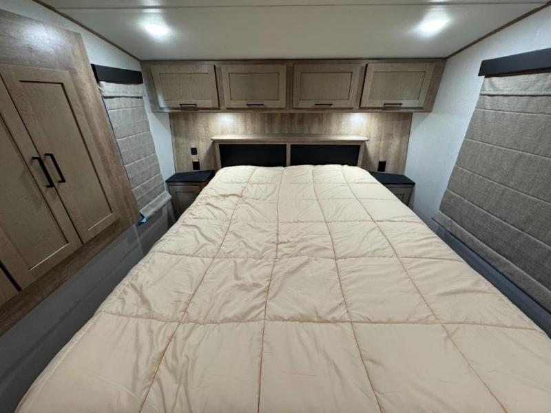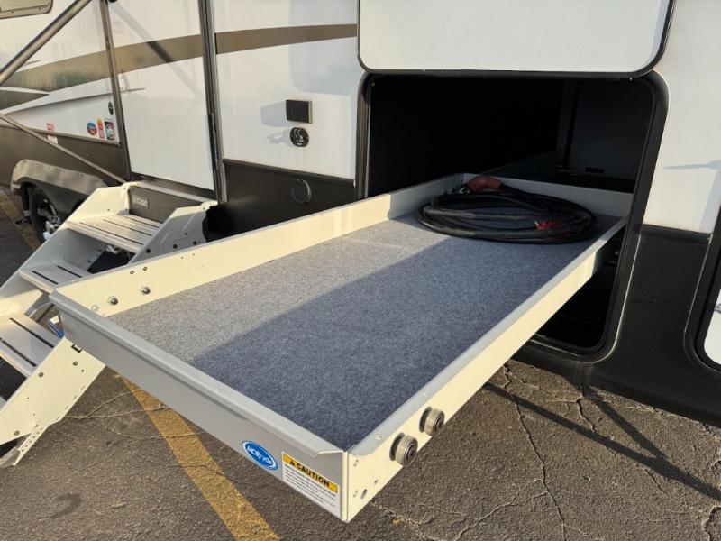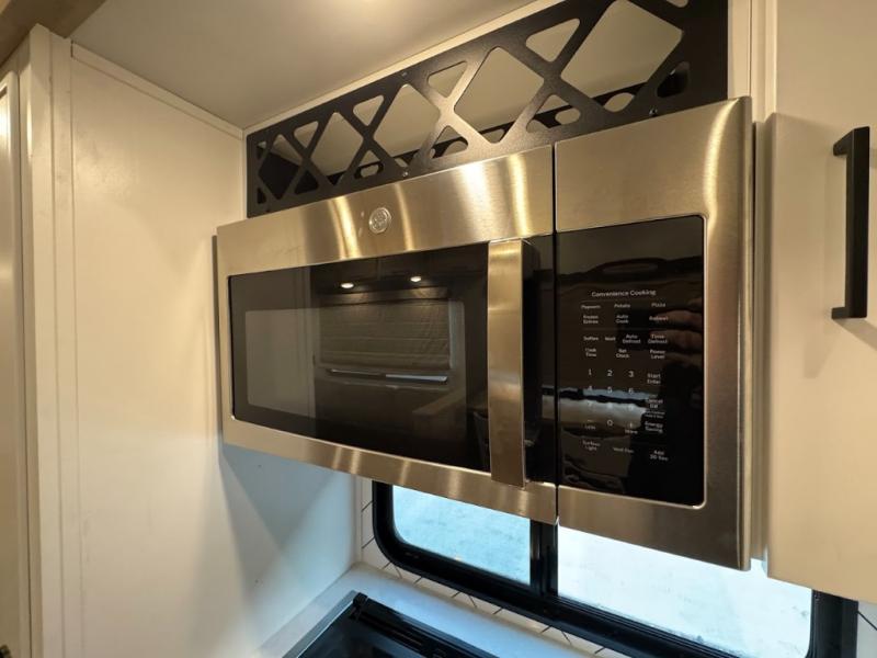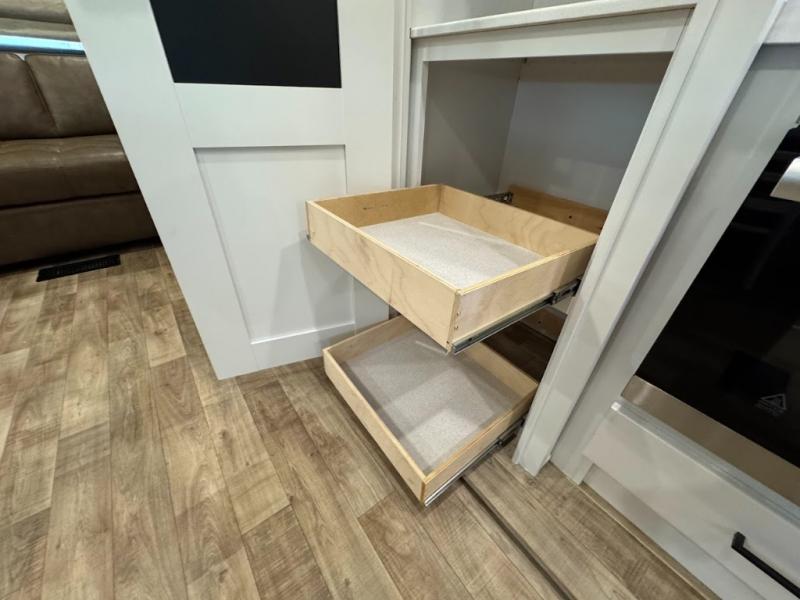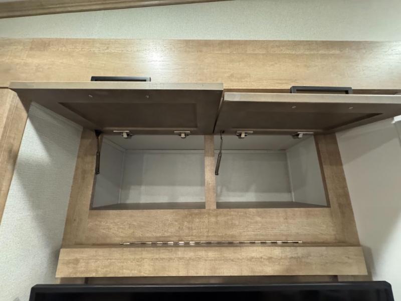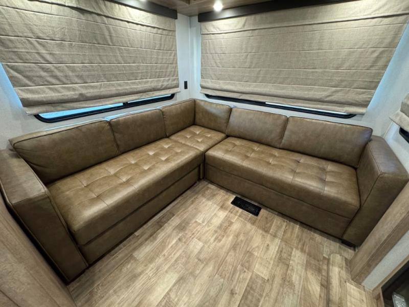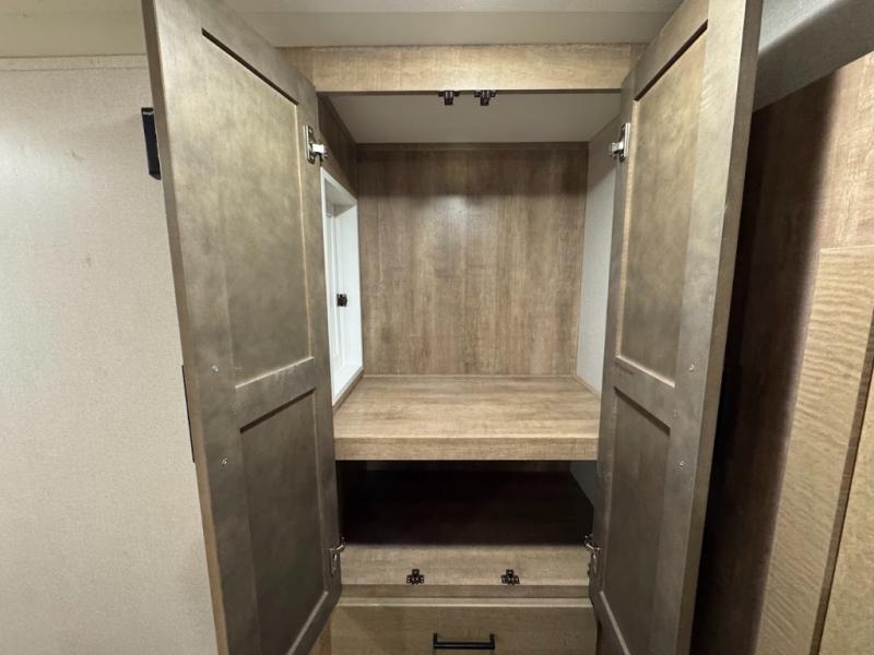 Head to your local state park for fun camping trips in this cozy fifth wheel. Your crew will love relaxing in the rear living area on the sectional sofa with a fireplace and 40" TV nearby. There is a dinette table with bench seating on one side and two chairs on the other if anyone wants to play a board game, or everyone may want to head outdoors to sit under the 17' power awning with LED lights. The kitchen includes everything you need to prepare meals each day, including a residential style range with a 21" oven, a 30" over-the-range residential microwave, plus a large pantry for snacks galore. The front private bedroom includes a queen bed just like at home, and you'll appreciate the two wardrobes, plus under-bed storage for all your items.