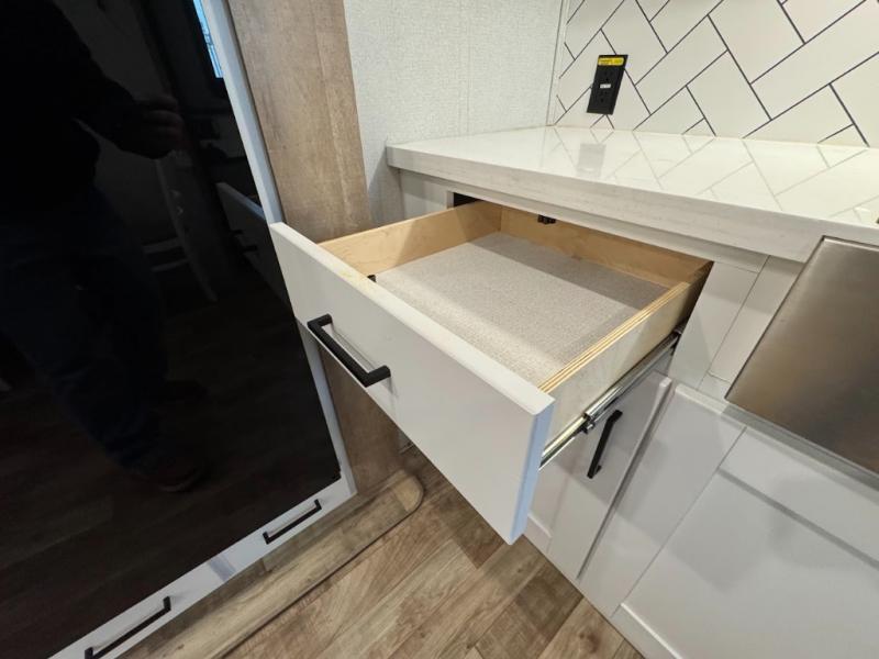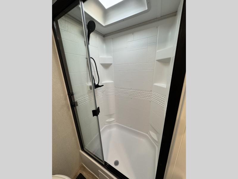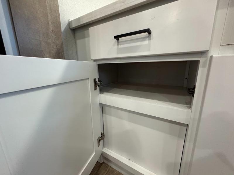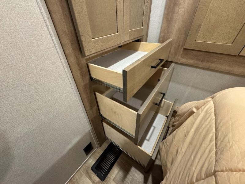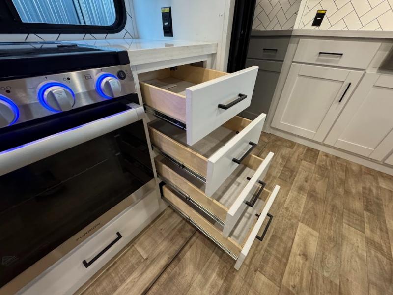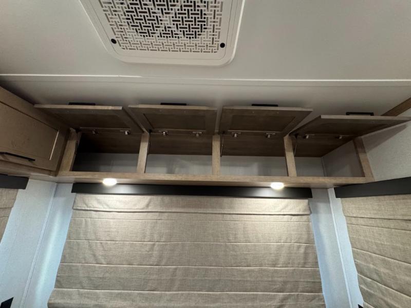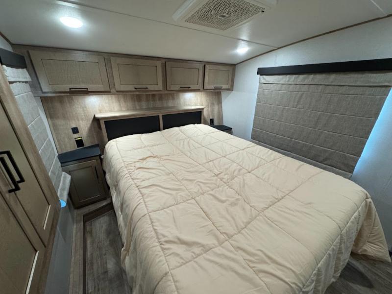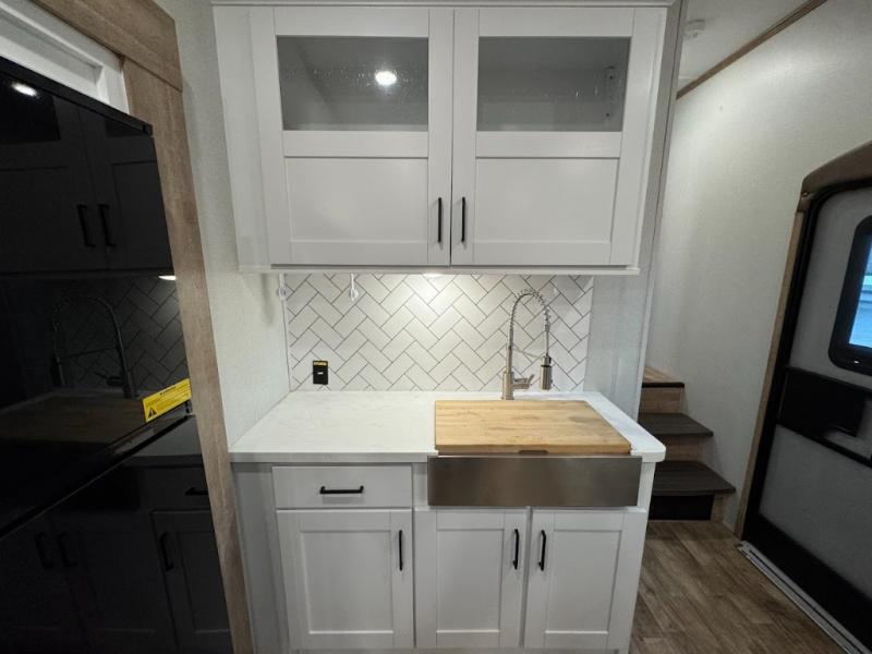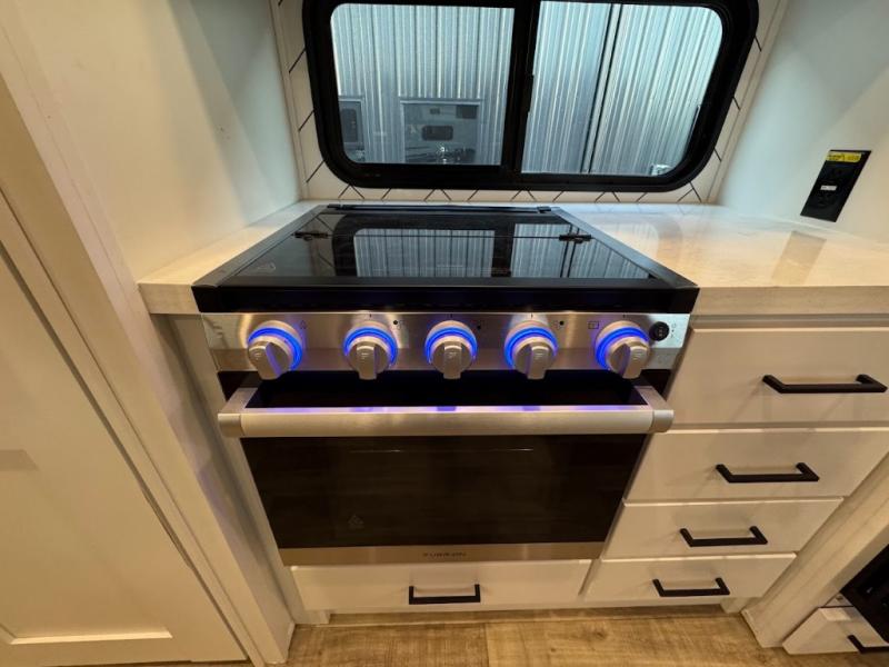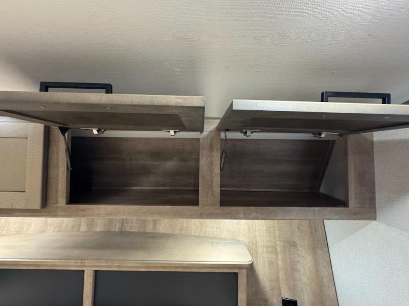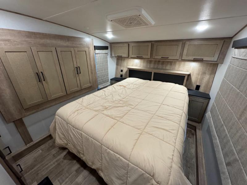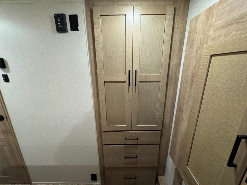 Head to your local state park for fun camping trips in this cozy fifth wheel. Your crew will love relaxing in the rear living area on the sectional sofa with a fireplace and 40" TV nearby. There is a dinette table with bench seating on one side and two chairs on the other if anyone wants to play a board game, or everyone may want to head outdoors to sit under the 17' power awning with LED lights. The kitchen includes everything you need to prepare meals each day, including a residential style range with a 21" oven, a 30" over-the-range residential microwave, plus a large pantry for snacks galore. The front private bedroom includes a queen bed just like at home, and you'll appreciate the two wardrobes, plus under-bed storage for all your items.