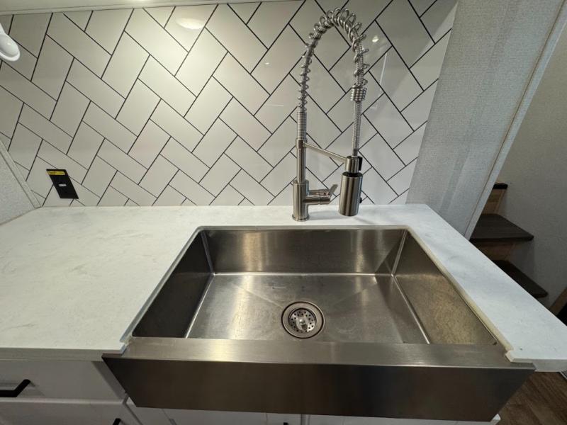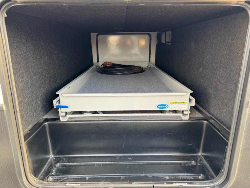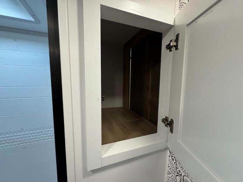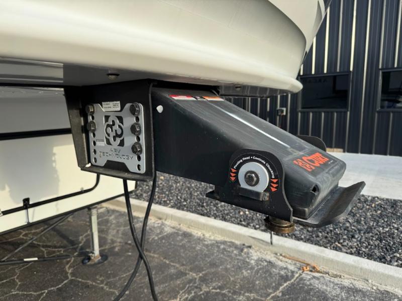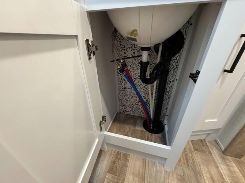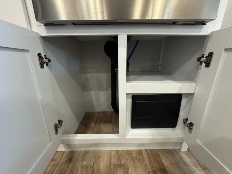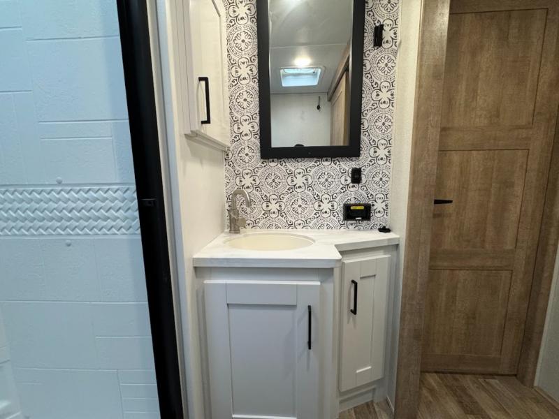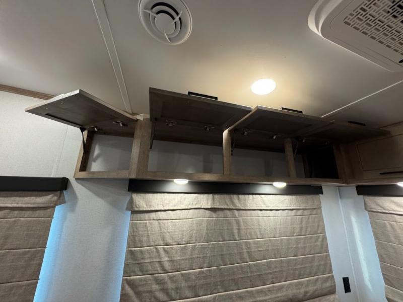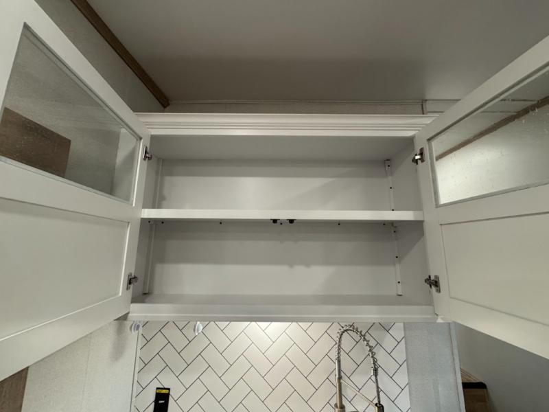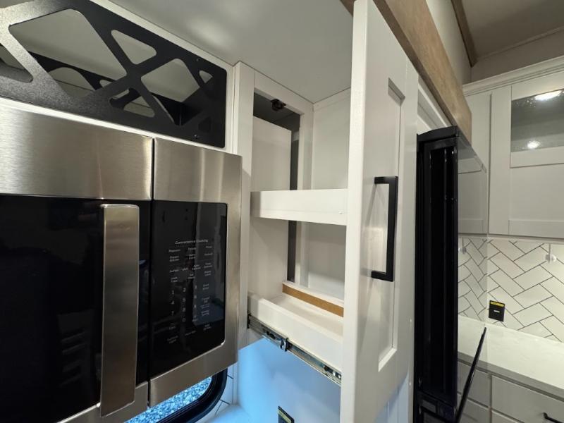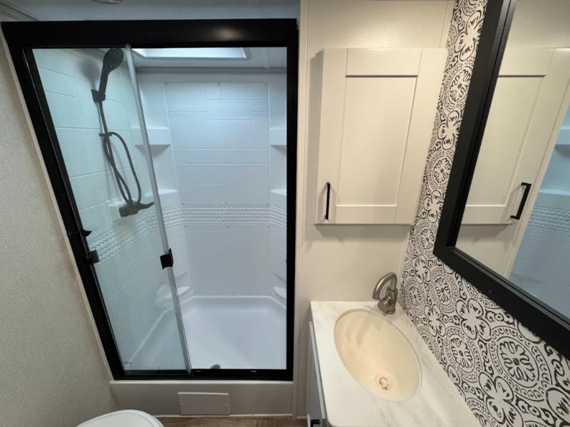 Head to your local state park for fun camping trips in this cozy fifth wheel. Your crew will love relaxing in the rear living area on the sectional sofa with a fireplace and 40" TV nearby. There is a dinette table with bench seating on one side and two chairs on the other if anyone wants to play a board game, or everyone may want to head outdoors to sit under the 17' power awning with LED lights. The kitchen includes everything you need to prepare meals each day, including a residential style range with a 21" oven, a 30" over-the-range residential microwave, plus a large pantry for snacks galore. The front private bedroom includes a queen bed just like at home, and you'll appreciate the two wardrobes, plus under-bed storage for all your items.