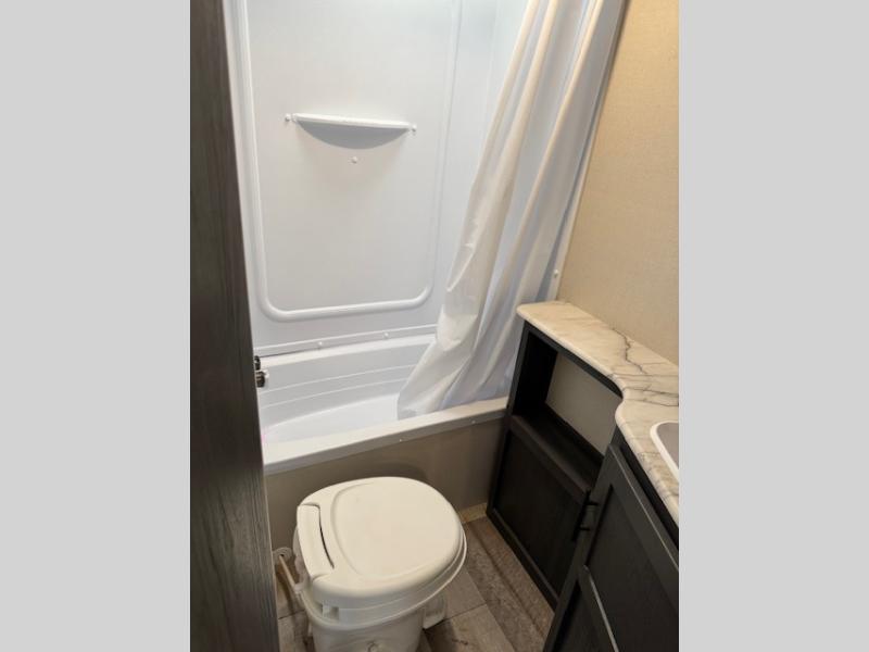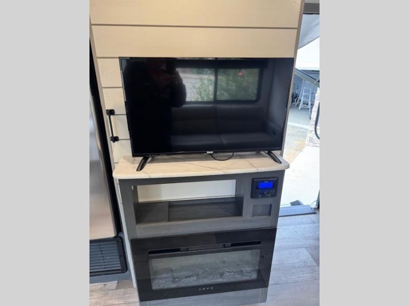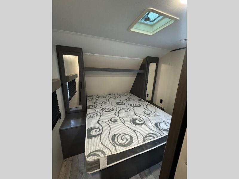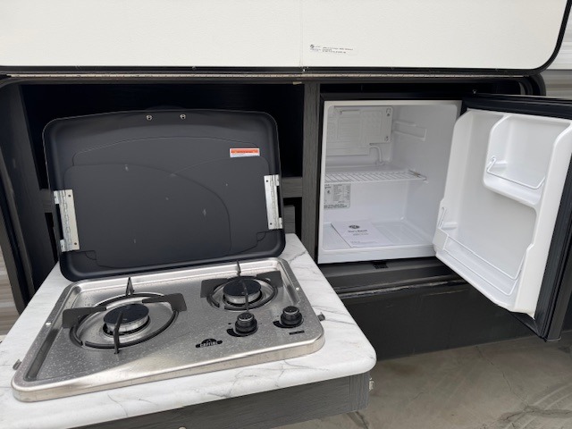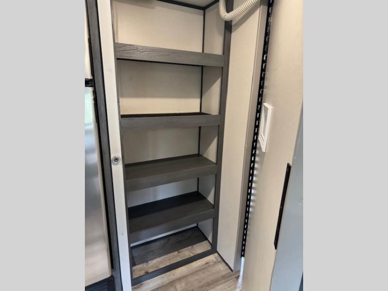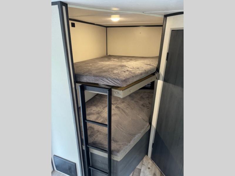 Enjoy camping with your own space in this RV with a private front bedroom with access to the full bathroom, plus a private bunkhouse in the rear that includes double-size bunks, two wardrobes, a half bath and the second entry into the trailer. The main living and kitchen is super spacious with dual opposing slides. You can relax on the tri-fold sofa or the Dream dinette, and the cook will have Furrion appliances, an 8 cu. ft. refrigerator, a kitchen island a pantry to make meals for all. Someone can use the outside kitchen as well, plus the 19' electric awning offers an outdoor living area once you add your camping chairs.
