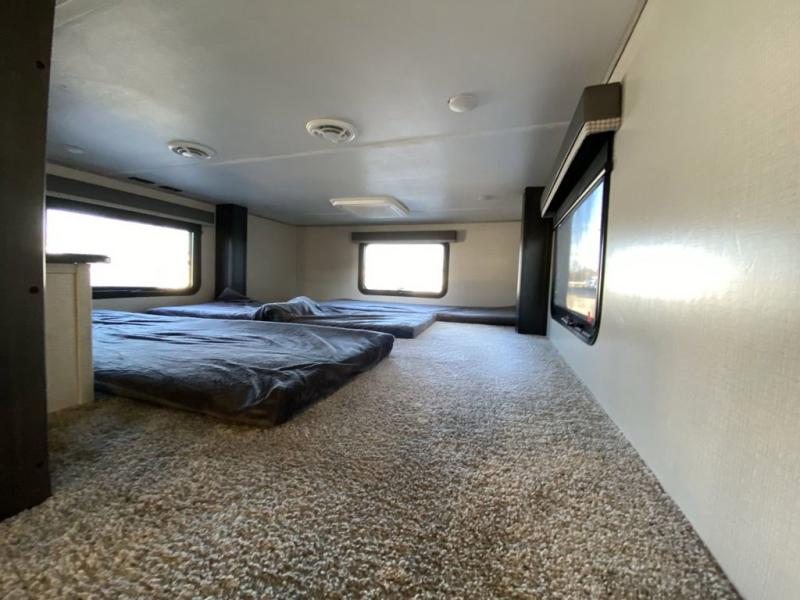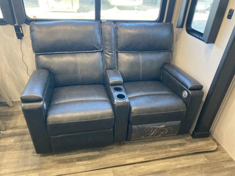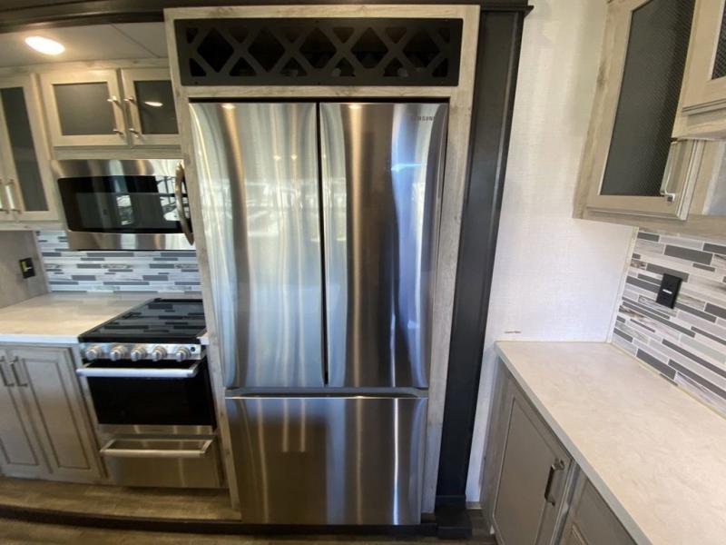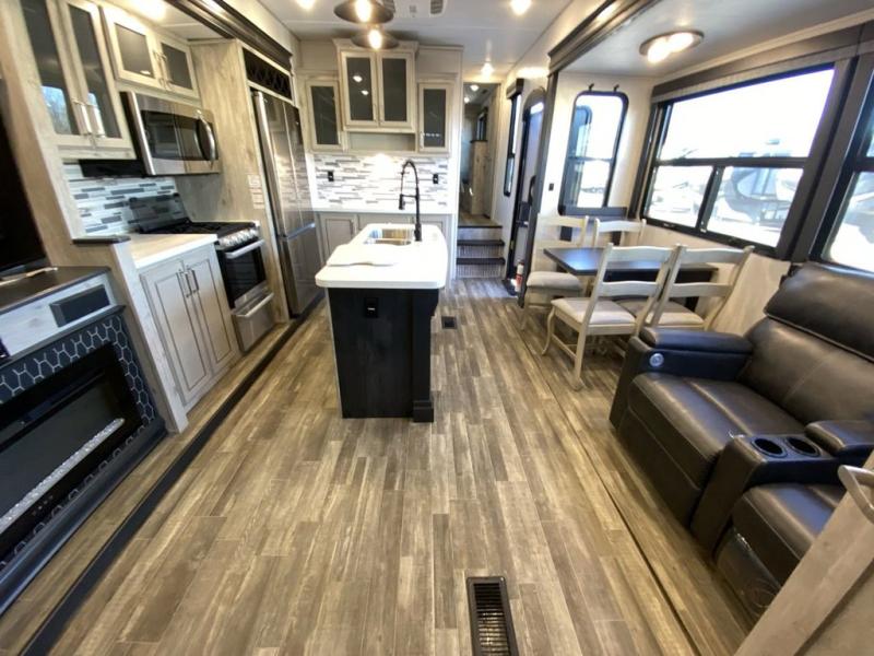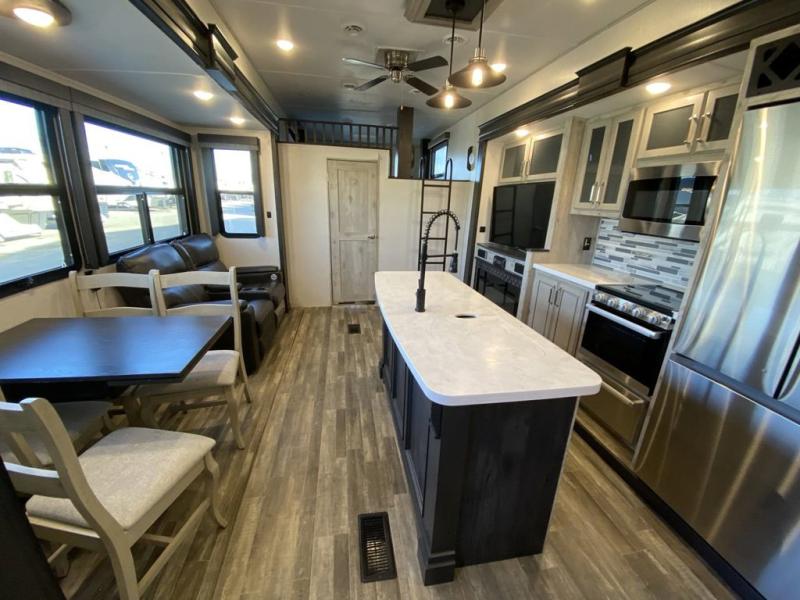 Get ready for family fun in this fifth wheel offering a front master bedroom with a king-size bed slide, plus a second master bedroom for your guests! The second bedroom includes a queen-size bed slide, a loft above the bedroom, plus a rear full bathroom including a unique rear entry/exit door. And both entrances include the LCl SolidStep. The main living and kitchen area offers dual opposing slides and include theater seating, a free standing dinette, a fireplace, a center island and full kitchen amenities to feed the crew. You might even like to add the residential refrigerator option. There is much more to enjoy inside and outside, grab your family, easily load up and head out for fun!