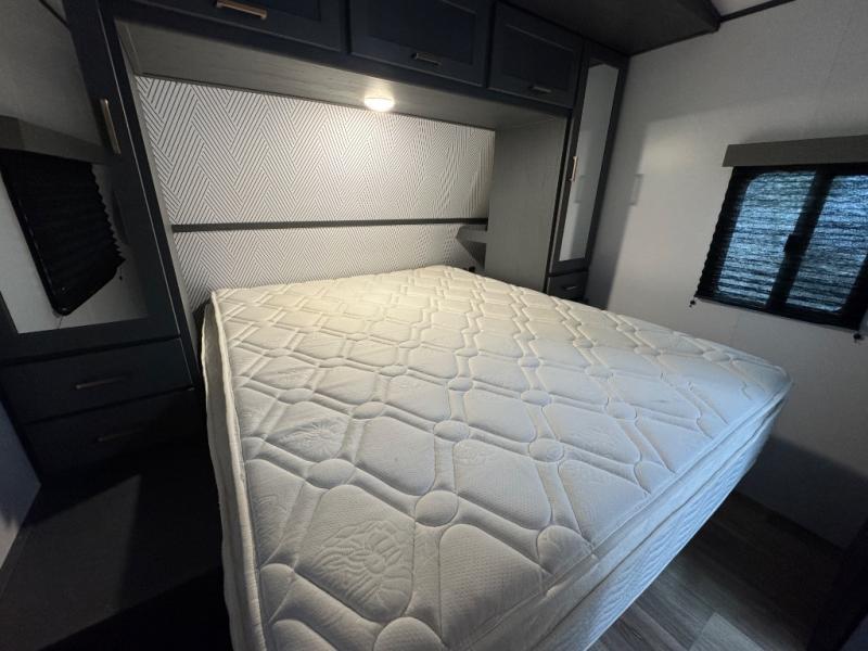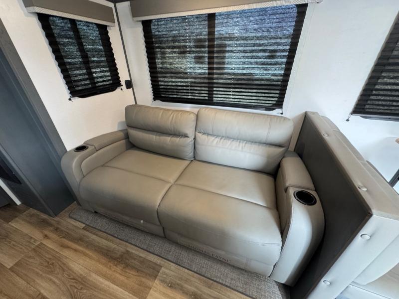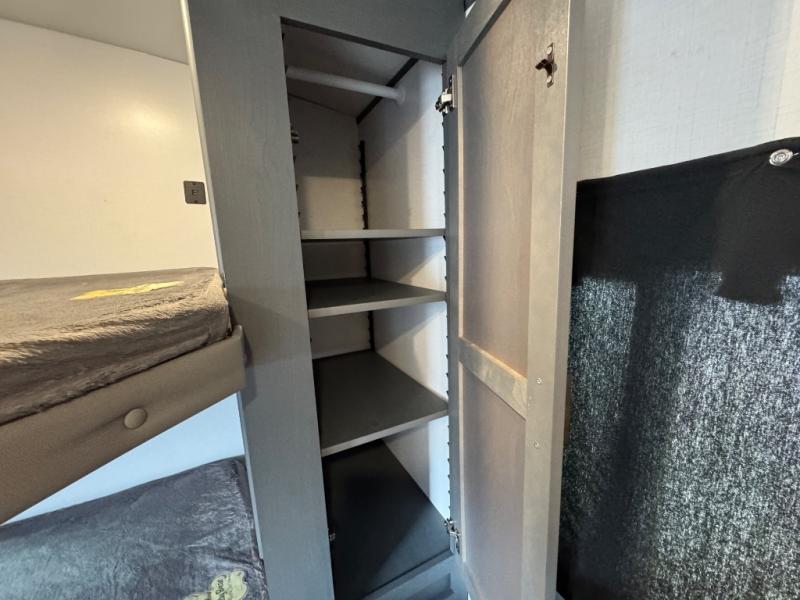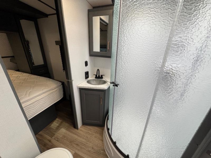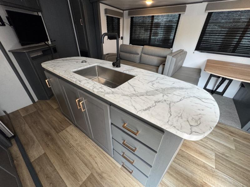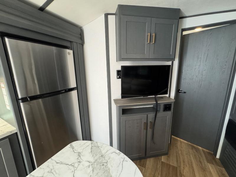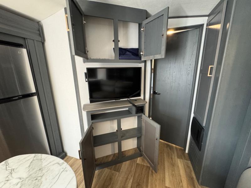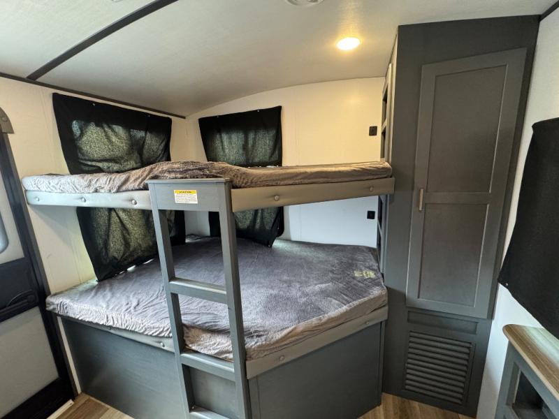Enjoy camping with your own space in this RV with a private front bedroom with access to the full bathroom, plus a private bunkhouse in the rear that includes double-size bunks, two wardrobes, a half bath and the second entry into the trailer. The main living and kitchen is super spacious with dual opposing slides. You can relax on the tri-fold sofa or the Dream dinette, and the cook will have Furrion appliances, an 8 cu. ft. refrigerator, a kitchen island a pantry to make meals for all. Someone can use the outside kitchen as well, plus the 19' electric awning offers an outdoor living area once you add your camping chairs.