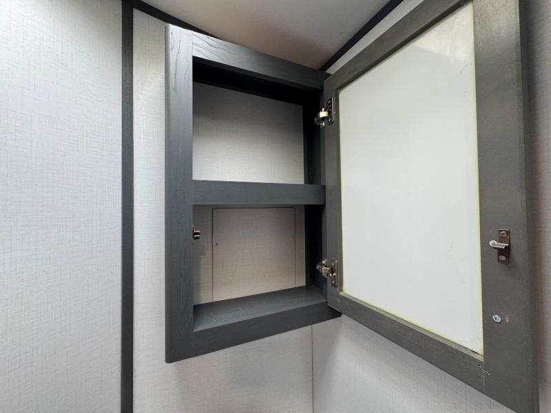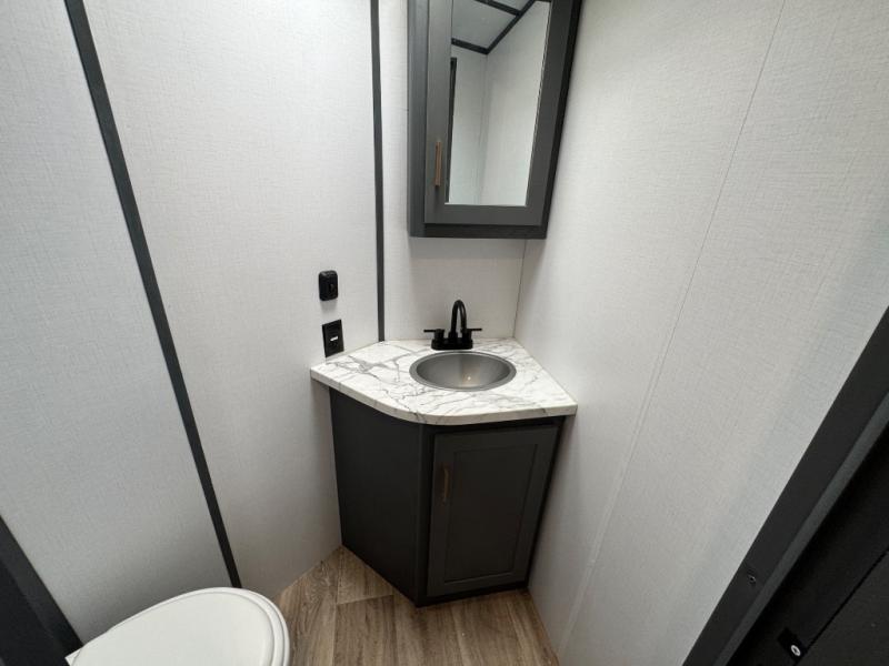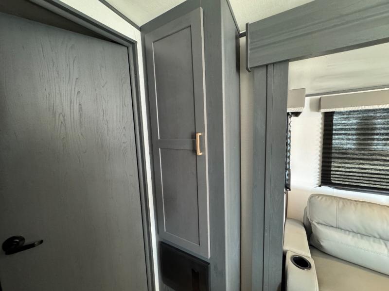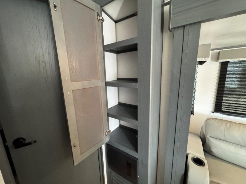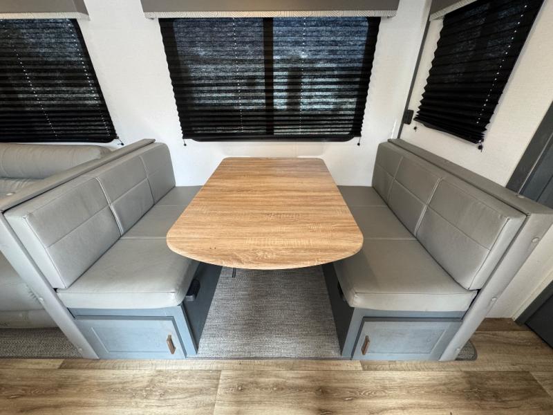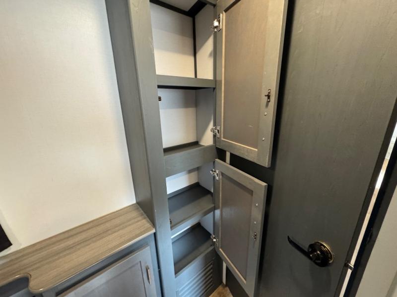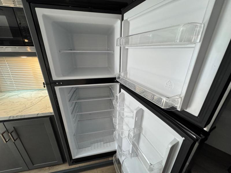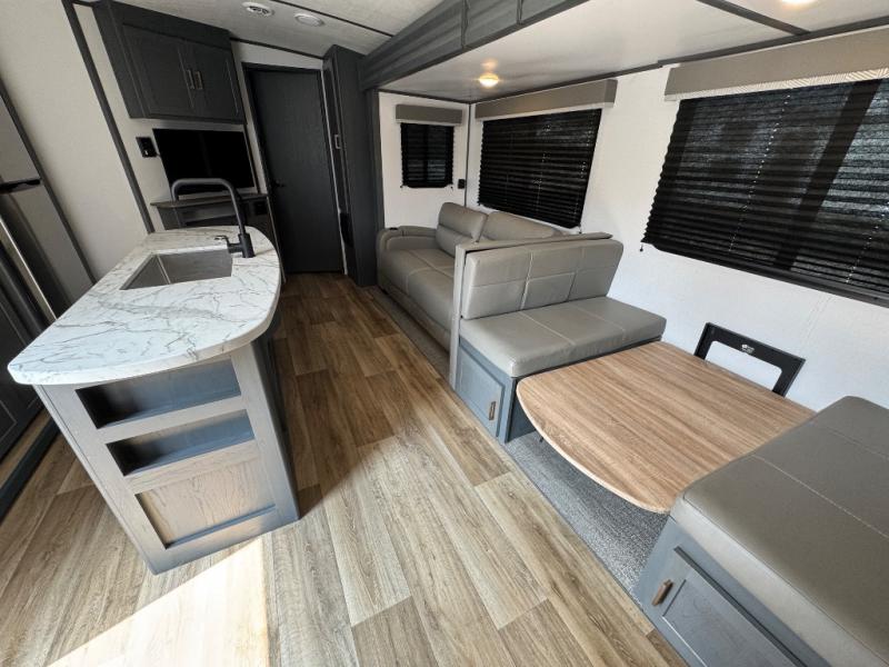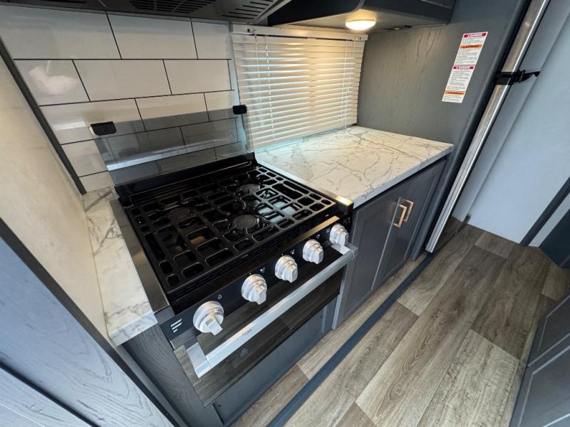 Enjoy camping with your own space in this RV with a private front bedroom with access to the full bathroom, plus a private bunkhouse in the rear that includes double-size bunks, two wardrobes, a half bath and the second entry into the trailer. The main living and kitchen is super spacious with dual opposing slides. You can relax on the tri-fold sofa or the Dream dinette, and the cook will have Furrion appliances, an 8 cu. ft. refrigerator, a kitchen island a pantry to make meals for all. Someone can use the outside kitchen as well, plus the 19' electric awning offers an outdoor living area once you add your camping chairs.