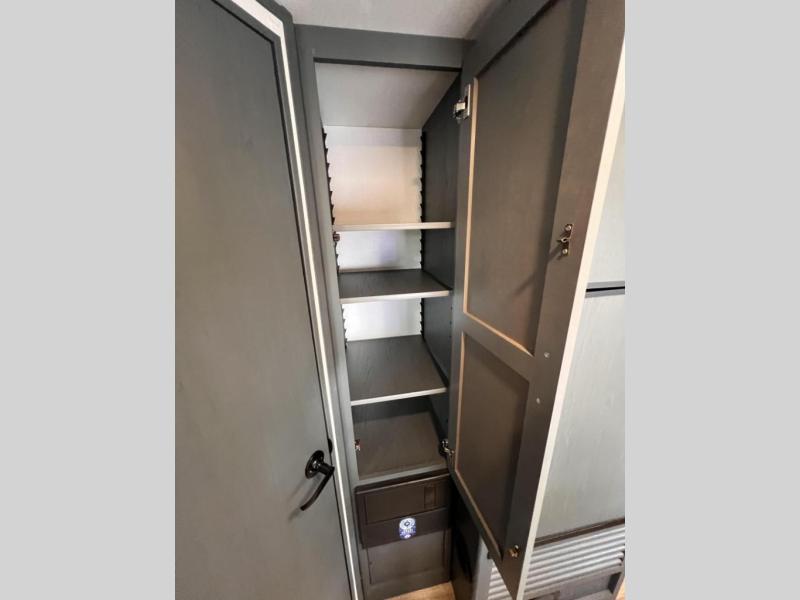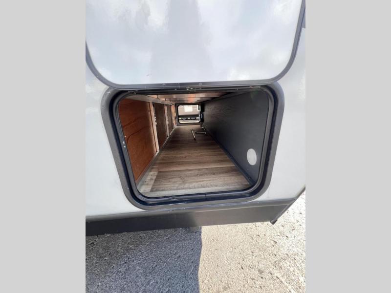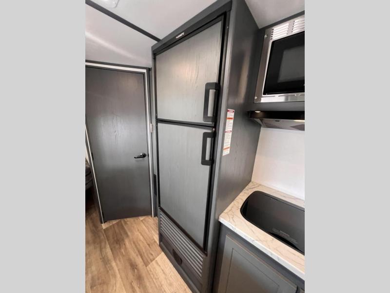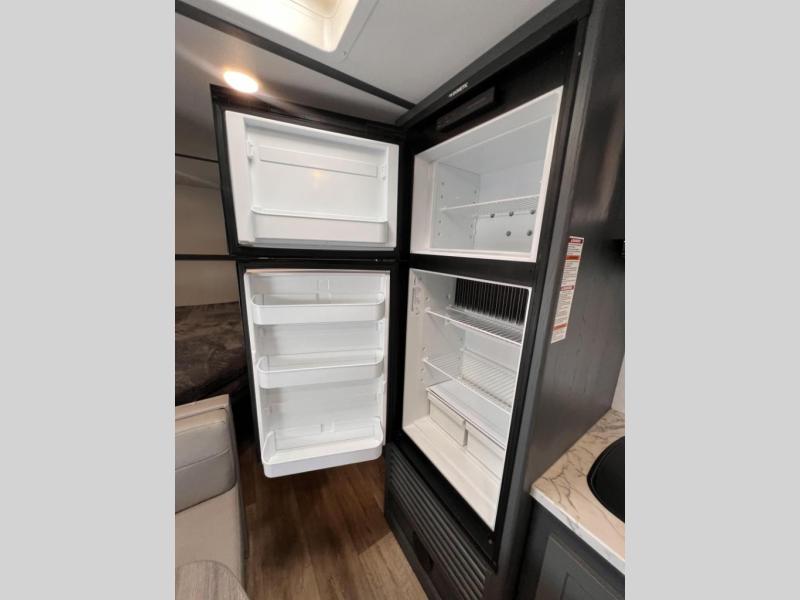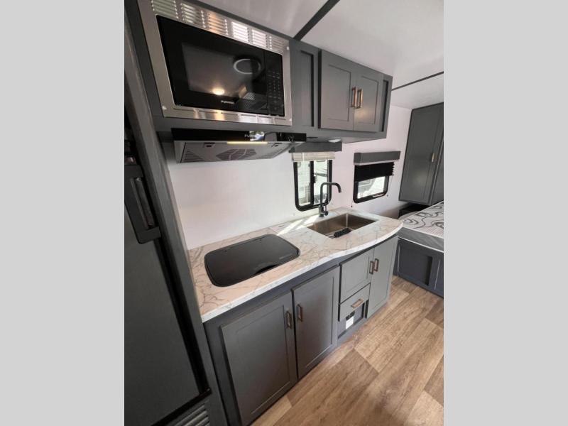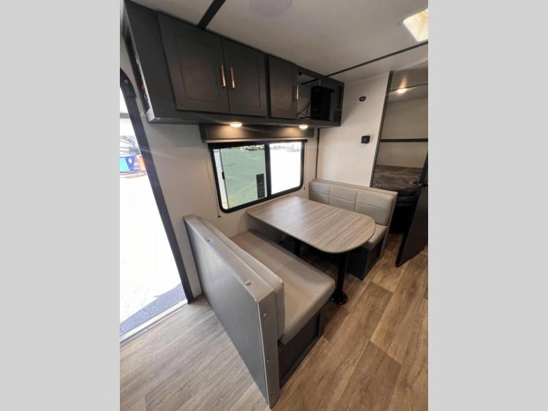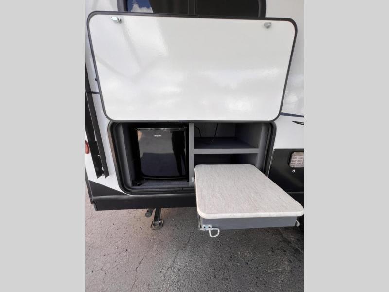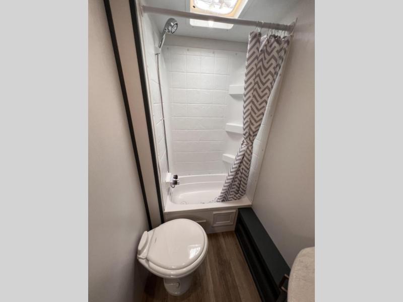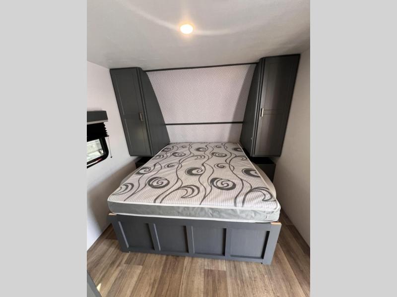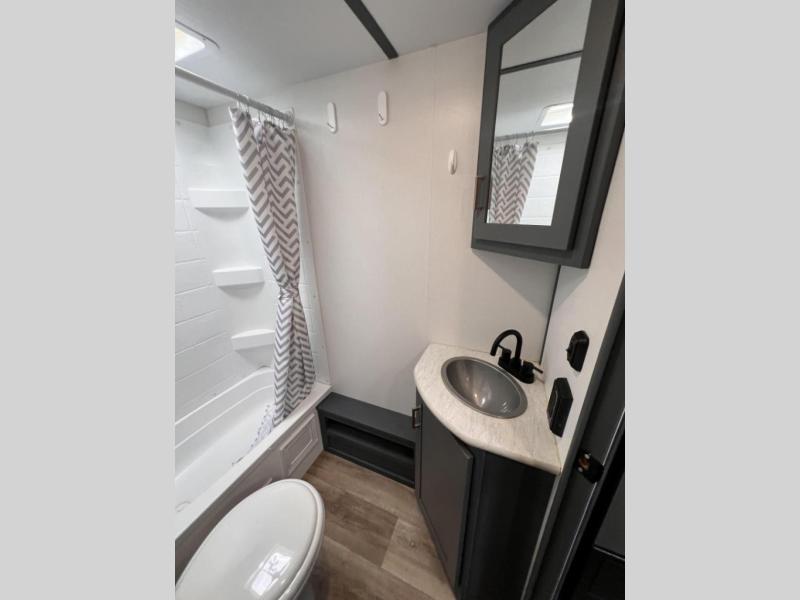Added sleeping space and a versatile Murphy bed are a dream come true in this cozy travel trailer. The double-size bunks include a flip-up bunk for added storage, and the front Murphy bed can be folded away in the morning so you can relax on the sofa. There is also a booth dinette where you can dine, play games, and sleep more guests. This model includes a full bath with a tub/shower that will make bath time for little ones easier than ever, and there is a wardrobe/pantry just outside the bath for clean towels and necessities. And check out the exterior with its 15' power awning with LED lights, pass-through storage, and mini refrigerator with an added shelf for snacks or cups.