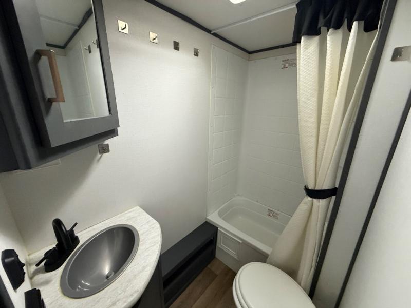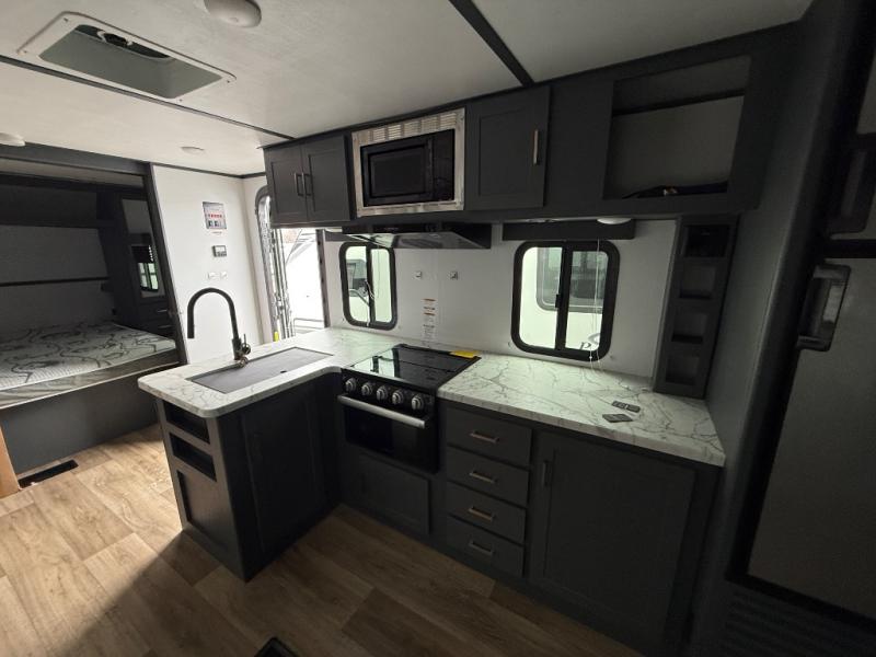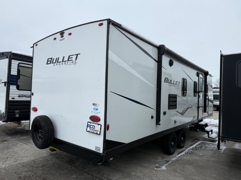 Each Bullet Crossfire by Keystone is constructed with a NORCO HSLA steel/automotive deposition coated frame assembled with huck bolts for durability. The one-piece ABS enclosed underbelly will help extend your camping season, and the Dexter E-Z Lube axles will provide smooth towing from home to campground. Setting up your trailer will be a breeze with the electric tongue jack and four electric stabilizer jacks, and there is an electric awning with adjustable arms and LED lighting for an inviting outdoor living space. The affordable, high-quality RV solar energy system, SolarFlex 200 comes standard with each model and will allow you to go off-grid when you want. Inside, you'll find fabric night shades, Beauflor with woven flooring in the slides, full depth cabinets with full extension drawer guides, and many more comforts.