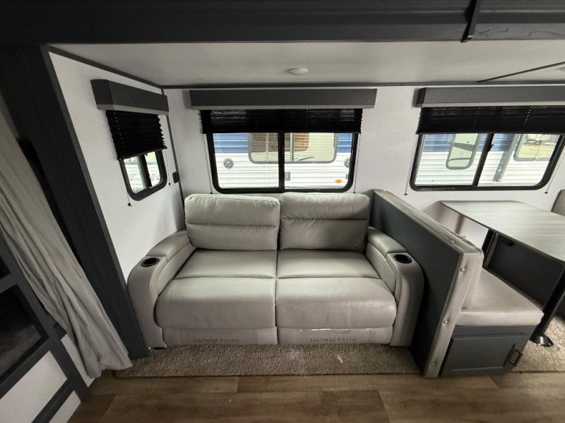 Head to the lake in this travel trailer that can comfortably sleep up to ten people each night. Your guests or kids will have double-size bunks to sleep on, while you take the queen bed in the front private bedroom. There are dual wardrobes here and a laundry chute so you can throw your dirty clothes straight to the pass-through storage. Everyone can gather in the main living area on the tri-fold sofa or booth dinette, and these areas will serve as additional sleeping space as well. This model also includes an entertainment center with TV prep so you can bring along your own TV for movie night. And don't forget about the rear corner bath that will allow you to clean up each day!