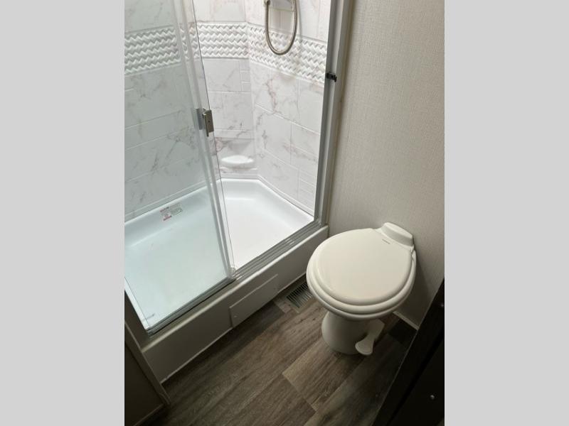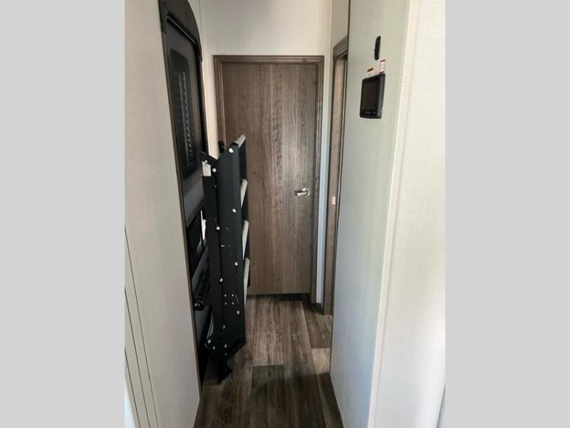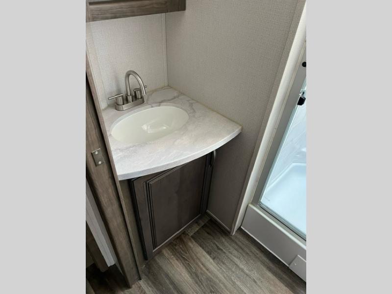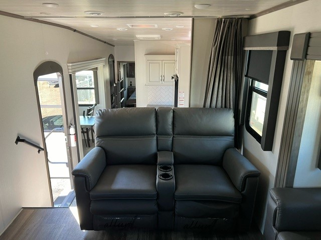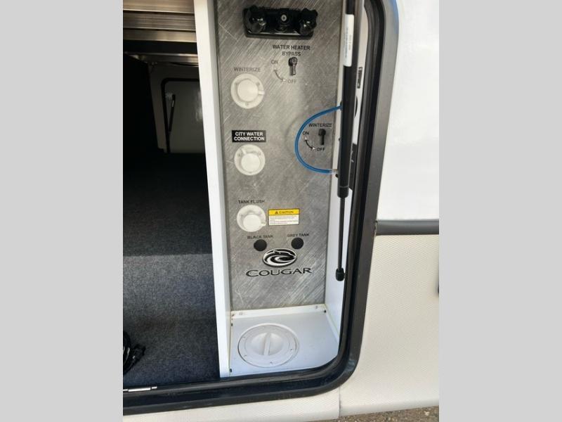 This Cougar fifth wheel will make you feel like you're on top of the world! It offers you a living space that truly feels like home because of its residential layout. The front separate living room has all of your favorite features, like a fireplace, LED HDTV, two 68" tri-fold sleeper sofas, and theater seating, and the kitchen is centrally located and sectioned off from the rest of the interior so that you don't have to try to cook on top of someone who is lounging in front of the TV. You can add an optional free-standing dinette to the slide out across from the kitchen for a place to sit down and eat those delicious meals, and the two entry doors give you access to the front or back portion of this unit. The rear private bedroom has a queen-size bed with a shoe garage underneath, and there is a wardrobe slide that can be used for other clothing items.