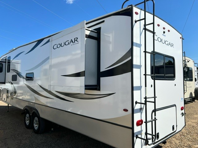 Spend more time having fun and less time worrying about your RV with the Keystone Cougar fifth wheel! These units have all that you will need for excellent vacations. The interior comes with 5/8" one-piece DynaSpan® flooring, tall slide outs for added comfort and head room, night roller shades throughout, residential, raised-panel hardwood cabinet doors and drawers, decorative crown molding, a 5,500 BTU electric fireplace with thermostat control and remote, and a Max Air exhaust fan with rain sensor. The exterior is also fully outfitted with a convenience center, friction-hinge entry door, electric four-point auto leveling system, an LCI® SolidStep® on main entry, a full pass-through storage with slam-latch baggage doors, an industry-best 80-gallon fresh tank capacity, a 2" accessory hitch with 300-LB storage capacity, and an outside shower.