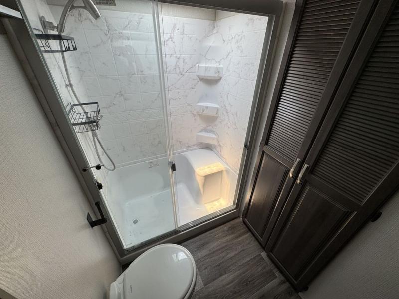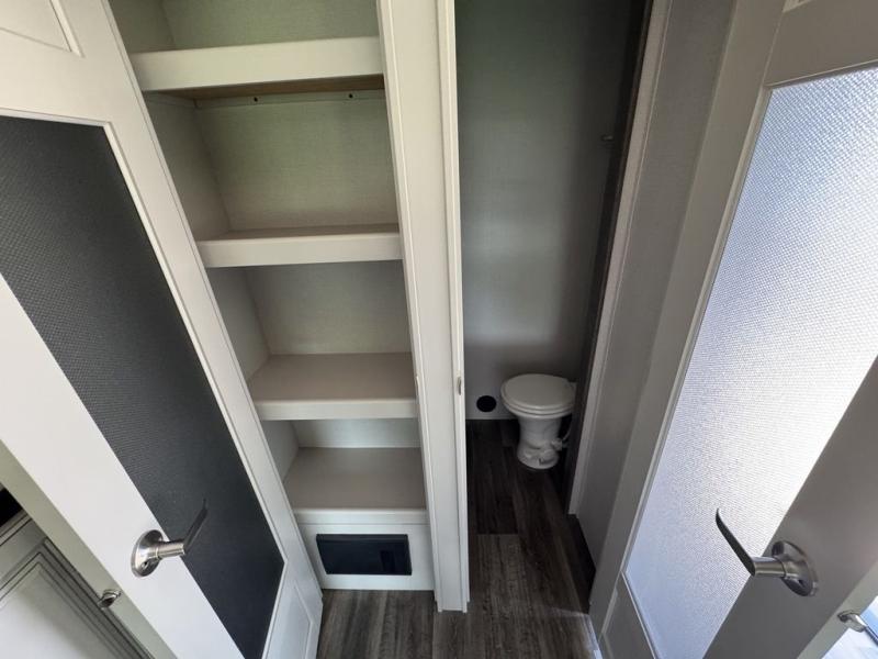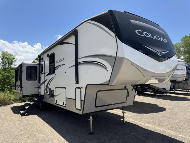 You will be so excited to take this Cougar fifth wheel out for the first time! Because of its secluded and fully stocked master suite at the front, this unit is perfect for a couple who want to see the country or visit family. The master bathroom has a wonderful walk-in closet that has shoe storage and preparations for a washer/dryer. There is also under-bed storage in the bedroom portion, and the queen bed slide gives you a little more space to get to the dresser and linen closet. The half bathroom is located out in the main living area so that your friends will have a place to go when they visit. Opposing slides keep this living area open for lounging comfortably on the tri-fold sleeper sofa and theater seating, and you can get everyone together for a board game at the booth dinette.