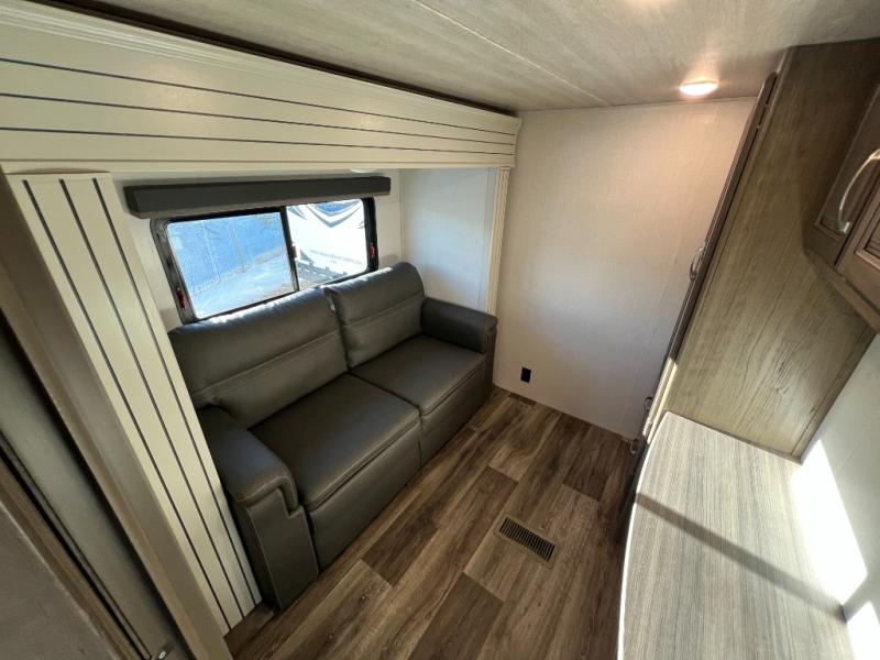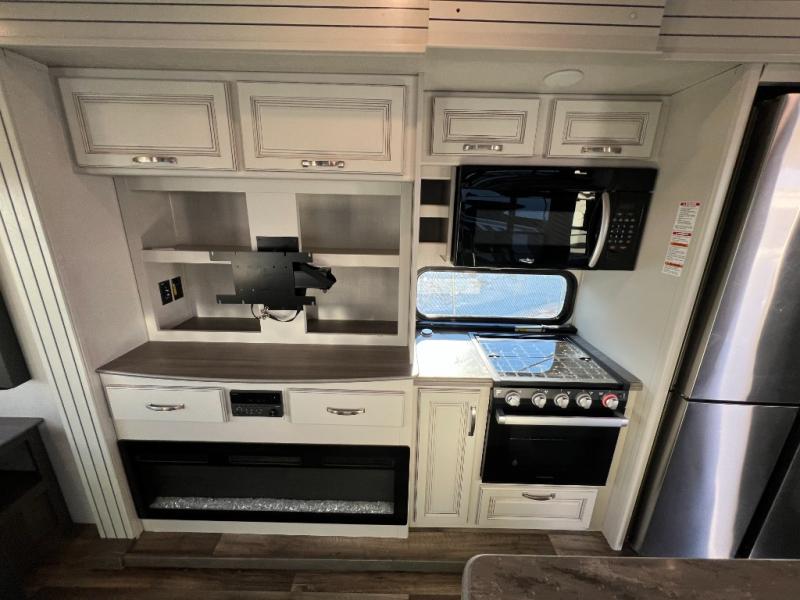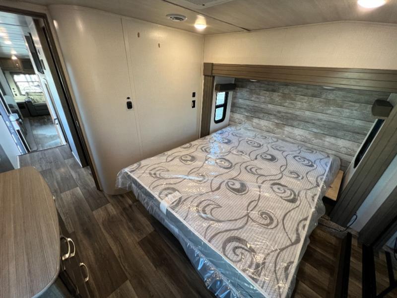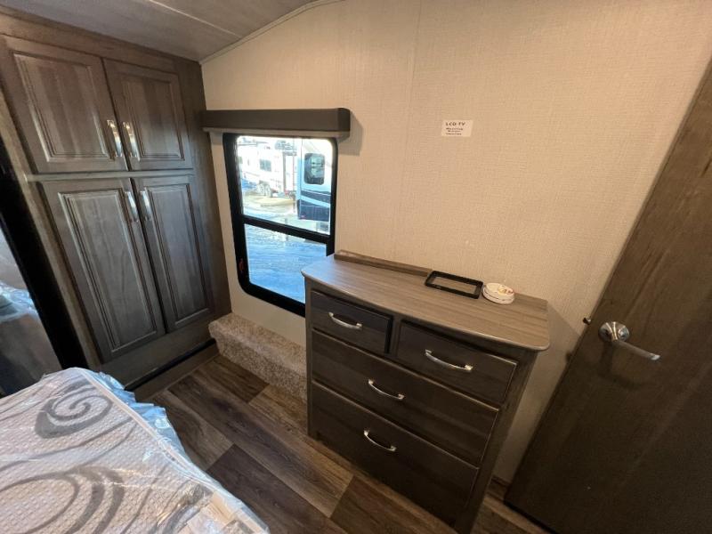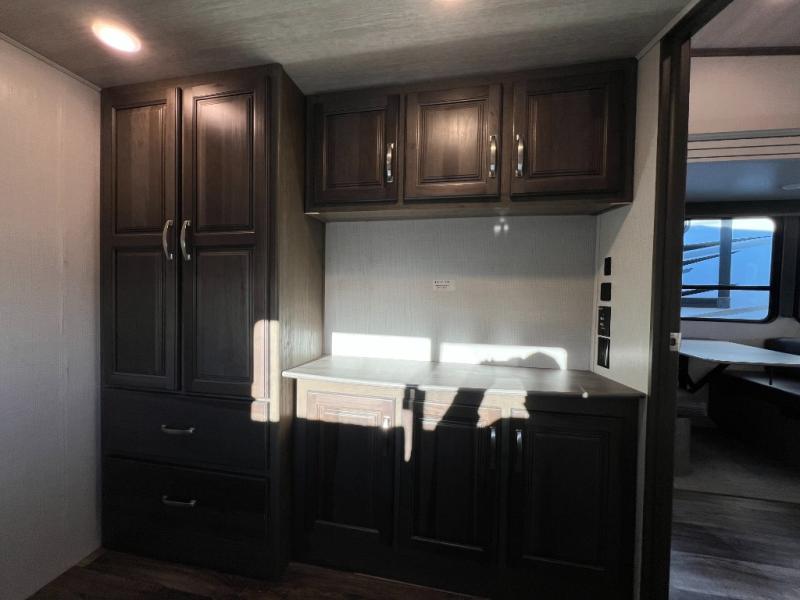 You'll love having an extra room that you can decide what to do with on this Cougar fifth wheel! Since it has a 68" tri-fold sleeper sofa and desk, it can serve as a bedroom, living room, or even an office. Above this room is a loft which adds more sleeping space without taking up precious interior living space. And speaking of space, you'll find more of it in the main living area when you push out the opposing slides. Another tri-fold sleeper sofa sits in the living area, and there is also theater seating that you can rest on in front of the fireplace and LED HDTV. Grab a snack from the pantry, or heat up some food in the microwave if you can't wait for dinner to be ready. The full bathroom has a linen closet for your towels and washcloths, and there is also great storage in the front private bedroom with the under-bed storage, dresser, and full-height wardrobe.