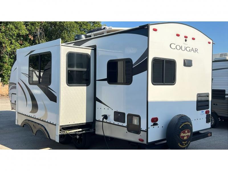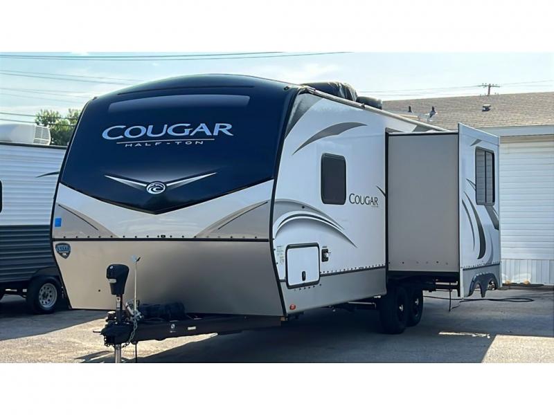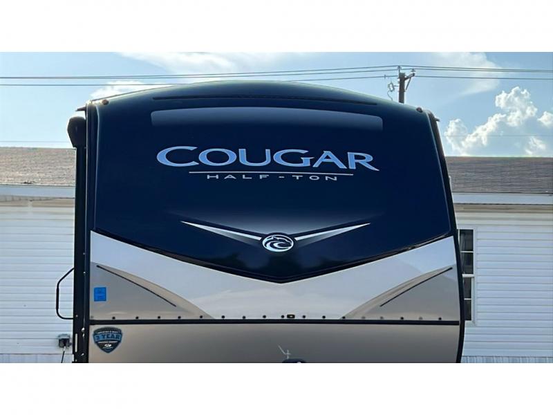 Get to your favorite places with this accommodating and stylish Cougar Half-Ton travel trailer! The single slide holds the 68" tri-fold sleeper sofa so that you can have enough room to spread out and relax at night, and if you want a little snack while you play some games, you can heat up some popcorn in the microwave. After the night has ended, nothing will feel better than snuggling into the king-size bed up front in the master suite.