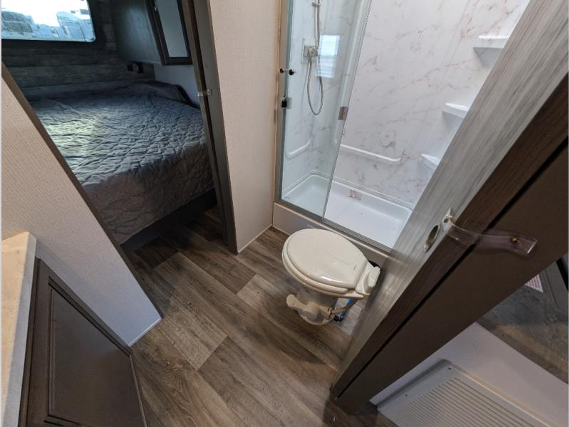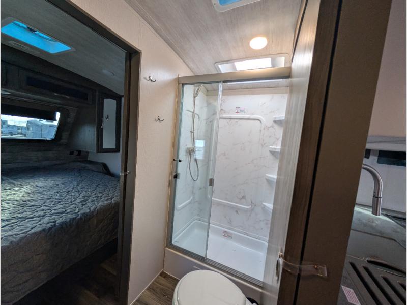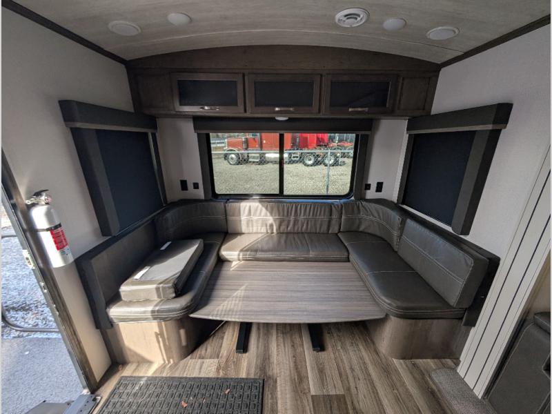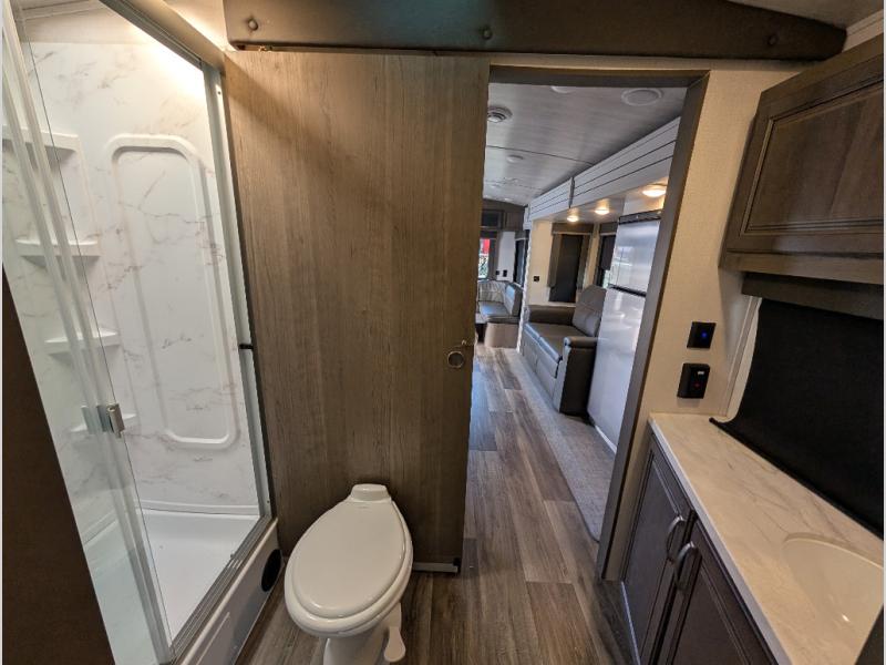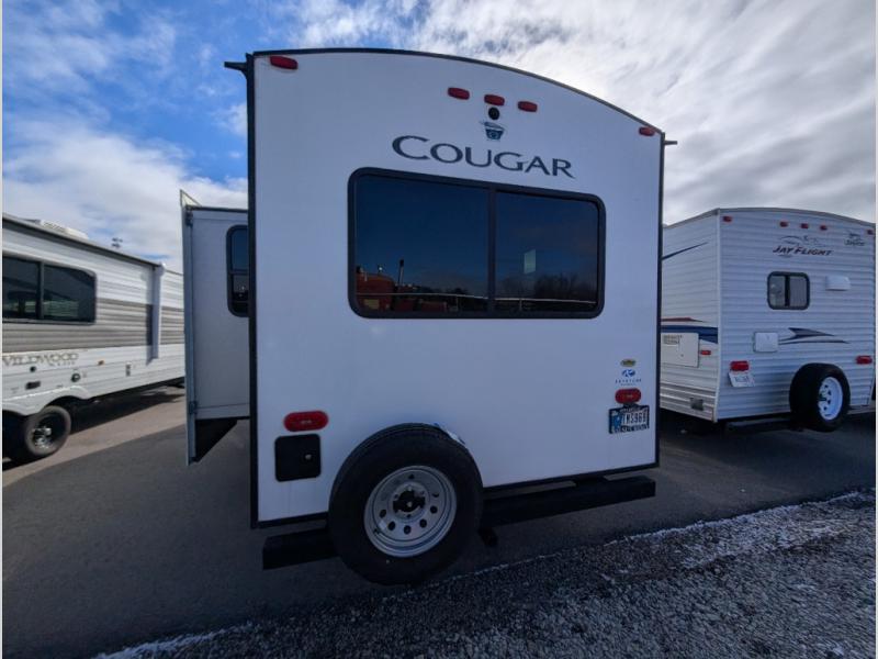 This Cougar Half-Ton travel trailer has an excellent dining area with its huge rear U-shaped dinette! Right next to the dinette is a large slide out that holds the 68" tri-fold sleeper sofa, 8-cubic foot refrigerator, and pantry. The kitchen has been excellently appointed with a Furrion range, foil-wrapped seamless countertops, a stainless steel undermount sink, and a microwave, and you will be grateful that you can access both sides of the walk-through bathroom. The private bedroom is ultra convenient with its exterior entrance, king-size bed, and wardrobe/nightstands on either side of the bed.