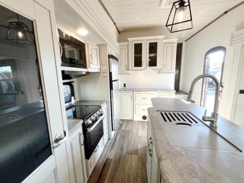 You will have the time of your life in this Cougar Half-Ton fifth wheel! There is so much comfort with the theater seating and 68" tri-fold sleeper sofa with end tables in the living area, and the comfort is taken up a notch with the addition of the fireplace below the entertainment center. You also have lots of space in this area because of the opposing slides, so you can work freely around the kitchen island preparing dinner or washing dishes. The dinette is right next to the kitchen, so you won't have to go far to set the table. The pantry is big enough to keep your favorite foods stored away, and the 8-cubic foot refrigerator can hold the items that need to be kept chilled.
