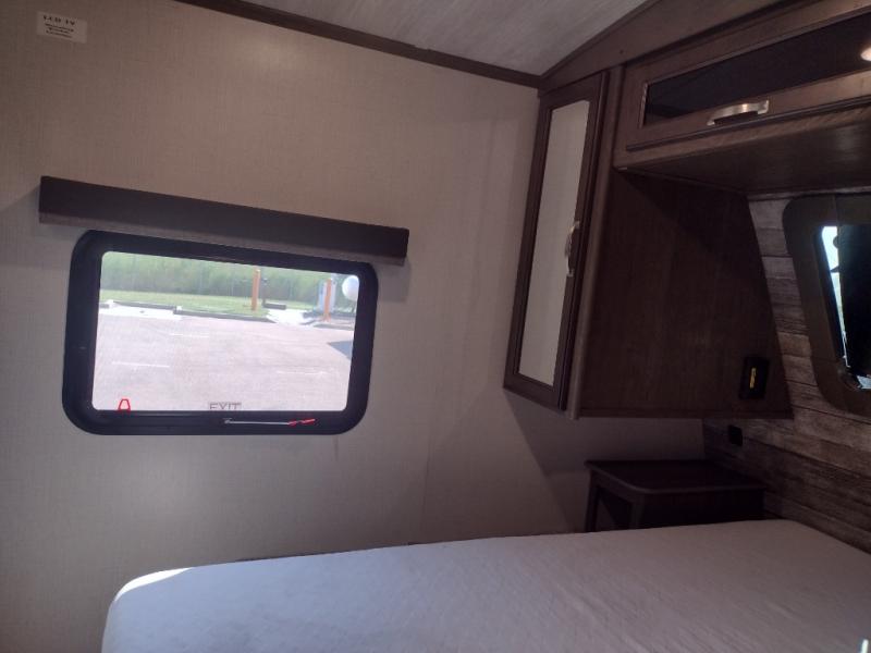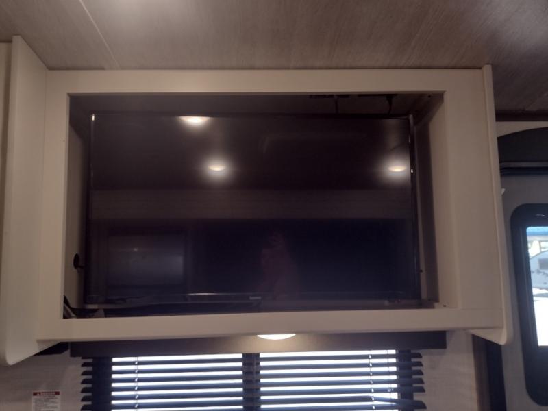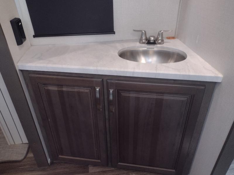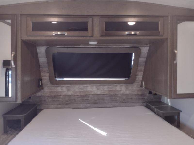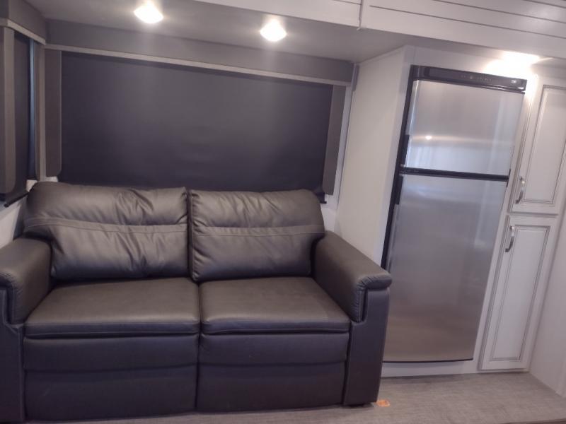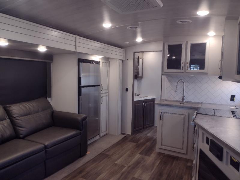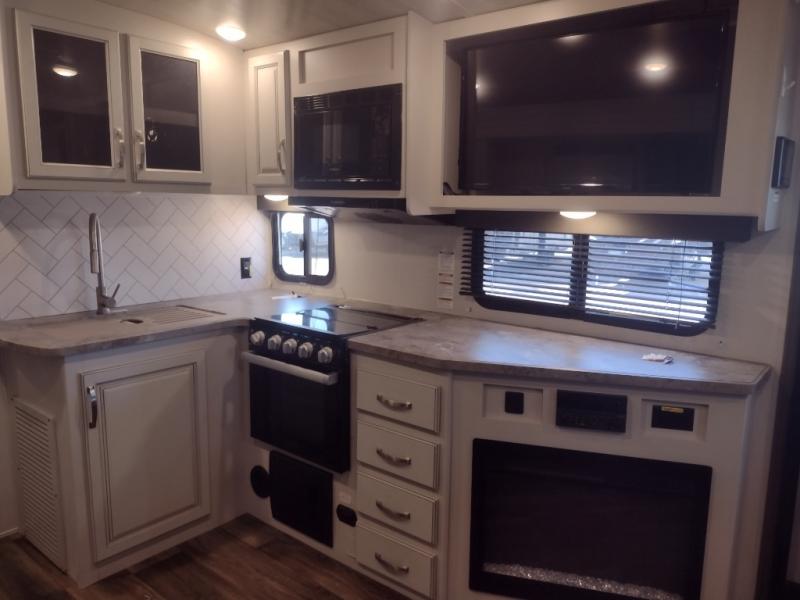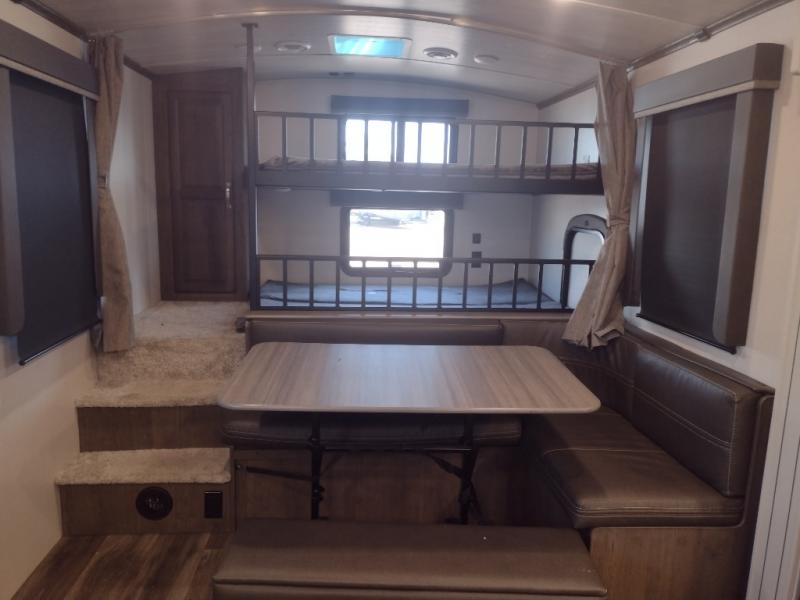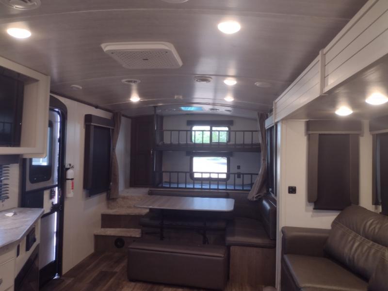 You're going to love camping with friends or family in this spacious travel trailer. There are double-size bunks in the back, and the lower bunk flips up for storage of luggage, camp gear, or toys. The group can relax in the main living area that includes a tri-fold sleeper sofa within the large slide out, plus there is an L-shaped booth dinette with an ottoman/bench seat for a unique set-up. There is even a fireplace and an LED HDTV for those rainy days you stay indoors. This model includes all the appliances indoors needed to prepare meals each day, plus there is a capital grill outdoors and an exterior mini fridge for cold drinks. And check out the 19' power awning that will shade you as you cook up lunch!