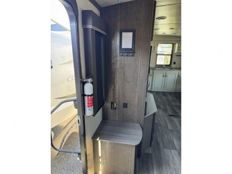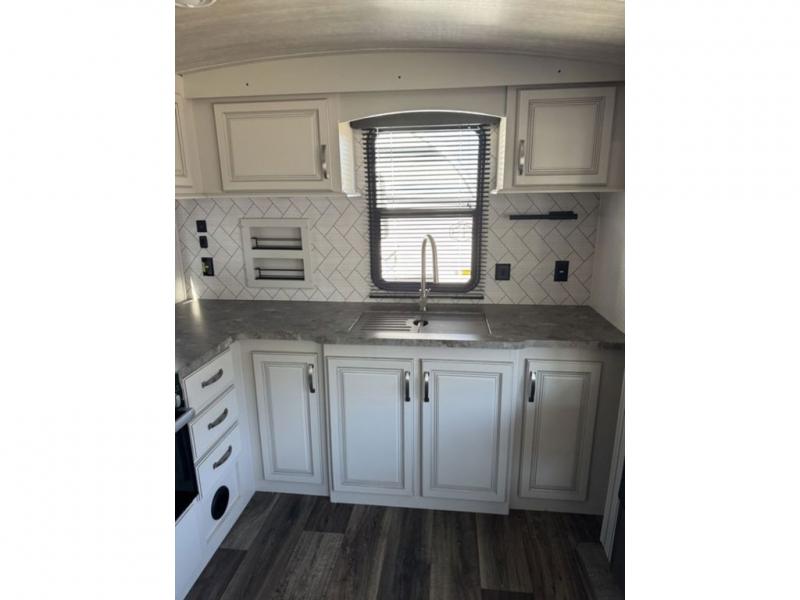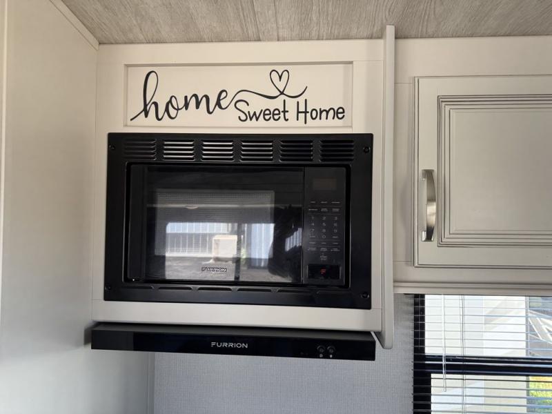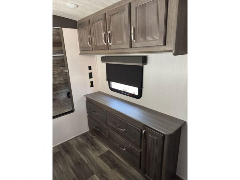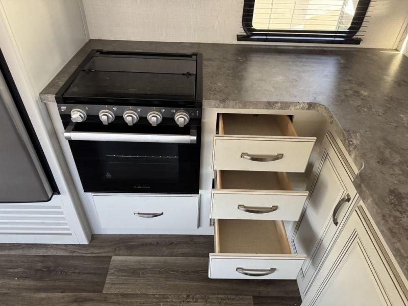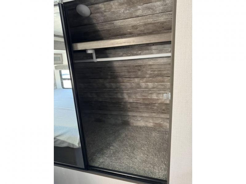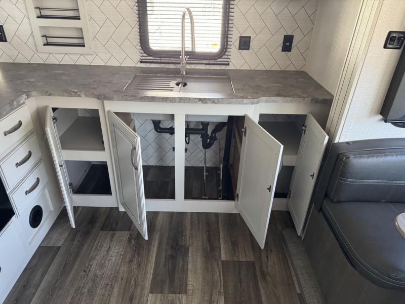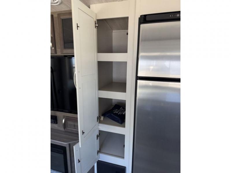 How does a king bed slide within a master suite sound? With this Cougar Half-Ton travel trailer, you'll have extra floor space and a full-width wardrobe allowing you to stay at your favorite campsite for long periods of time. The second slide located in the main living and kitchen area opens up this space for you to enjoy time spent inside just as much as outdoor adventures. The furniture even doubles as sleeping space for the kids or overnight guests. The rear kitchen layout is a convenience, and you will appreciate all the counter space for preparing and serving meals. You will find hidden storage behind the entertainment center, and next to the entertainment center is a pantry where you can store your favorite snacks.
