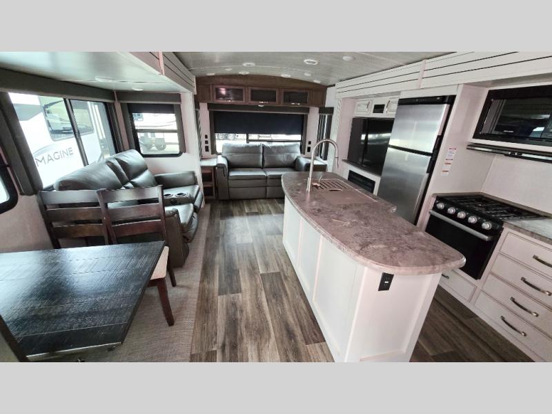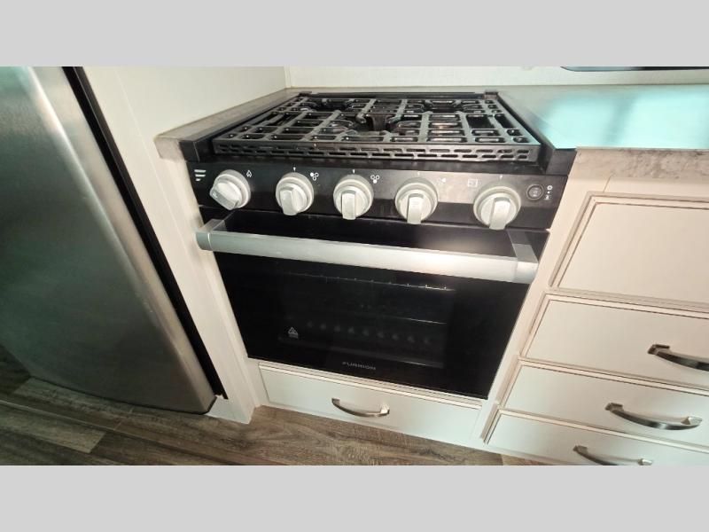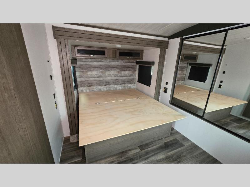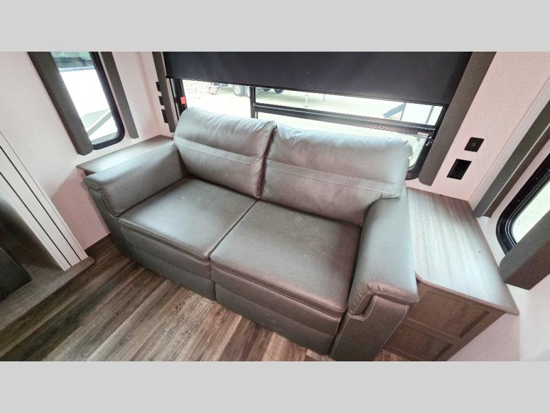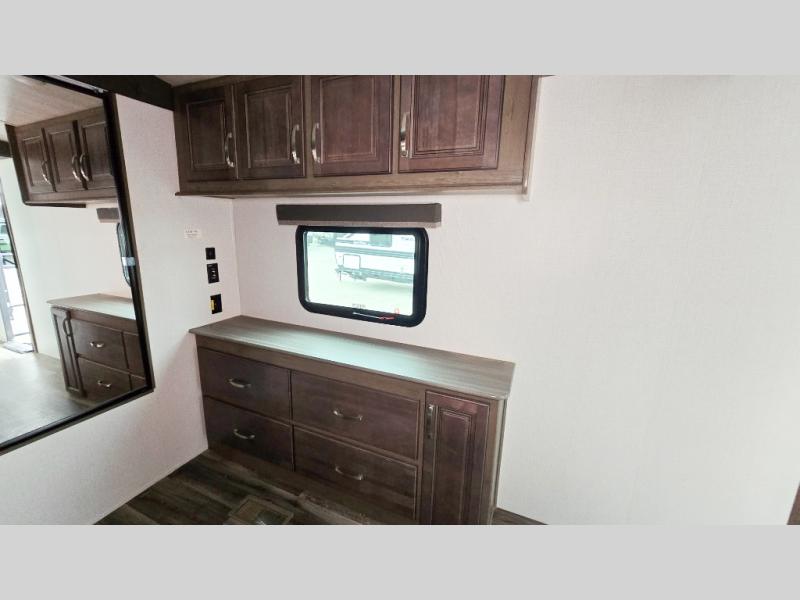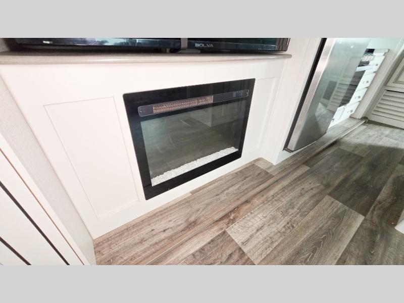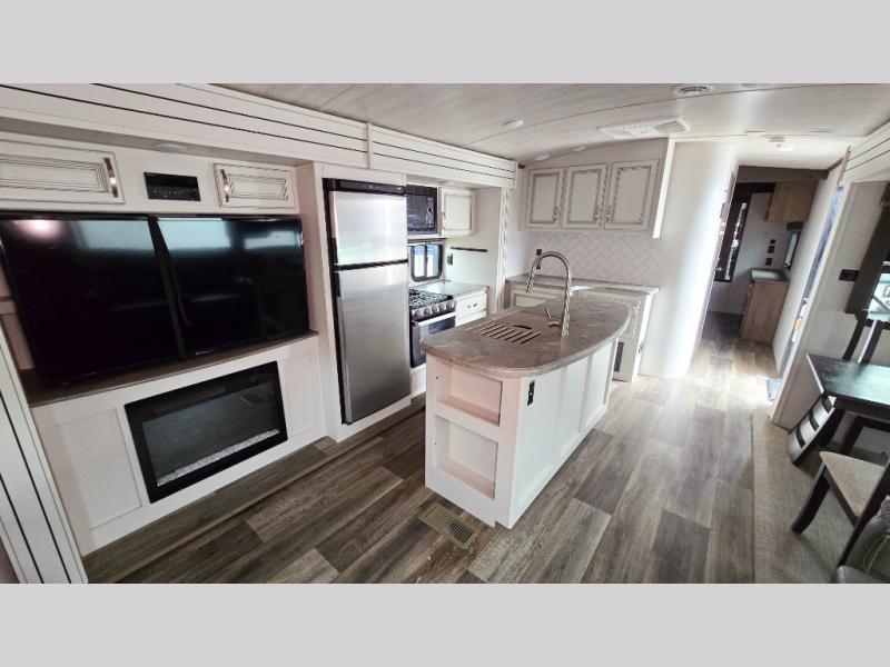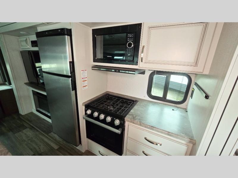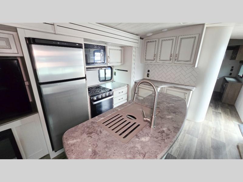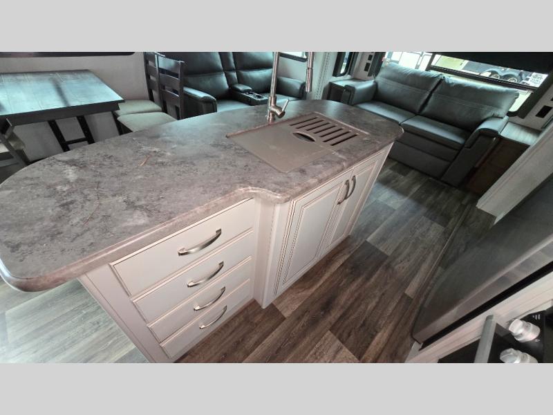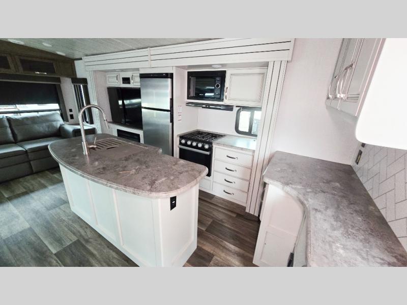A kitchen island with a stainless steel undermount sink and chef's sprayer faucet creates an inviting space in which to prep dinner each evening with this Cougar Half-Ton travel trailer! Not only that, but this model also comes with a 21" Furrion range with Piezo ignition and microwave oven so that you can have all of the same dishes you love to make at home. The front private bedroom is spacious and accommodating with its king bed slide, full-width wardrobe, and dresser, and the rear living area is just as great because it has an entertainment center that everyone can watch from the comfort of the theater seating or sleeper sofa. You can also add an optional fireplace to this model.