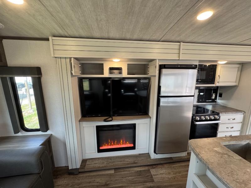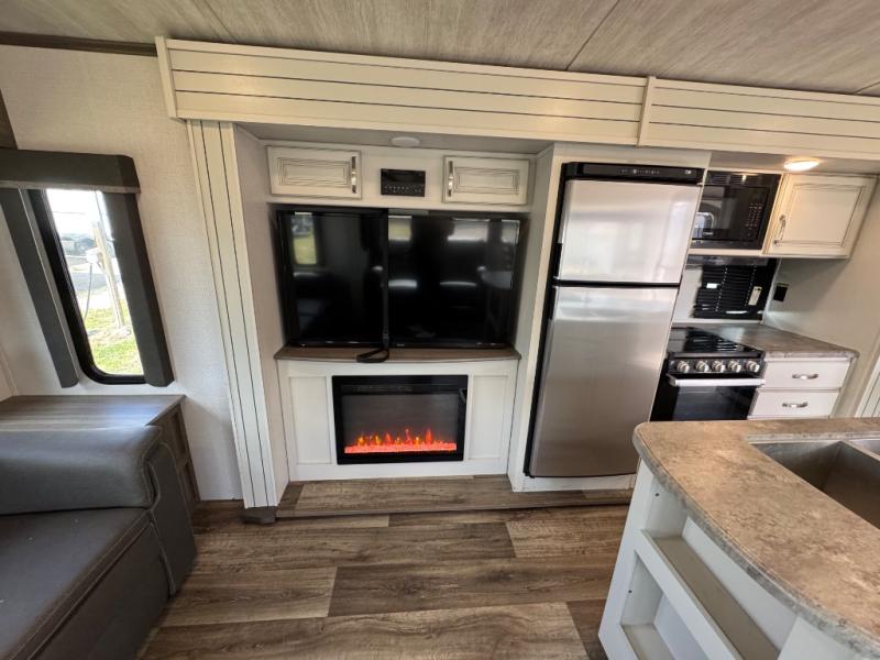 A kitchen island with a stainless steel undermount sink and chef's sprayer faucet creates an inviting space in which to prep dinner each evening with this Cougar Half-Ton travel trailer! Not only that, but this model also comes with a 21" Furrion range with Piezo ignition and microwave oven so that you can have all of the same dishes you love to make at home. The front private bedroom is spacious and accommodating with its king bed slide, full-width wardrobe, and dresser, and the rear living area is just as great because it has an entertainment center that everyone can watch from the comfort of the theater seating or sleeper sofa. You can also add an optional fireplace to this model.