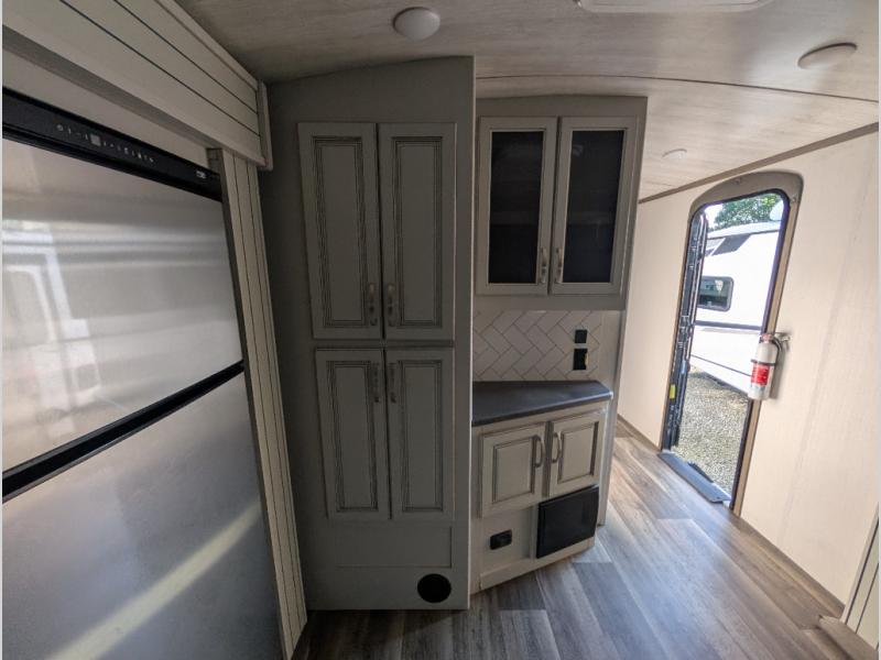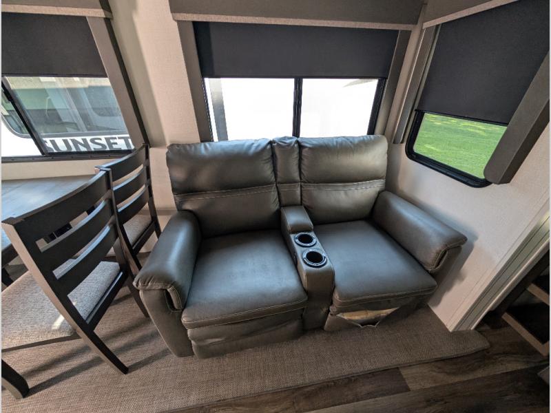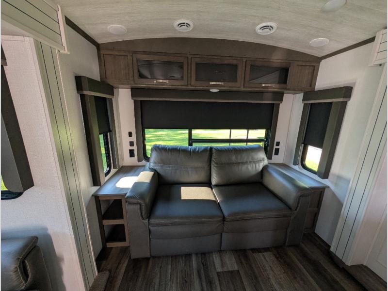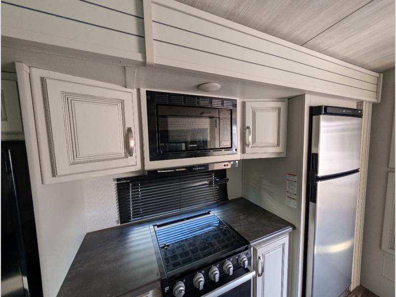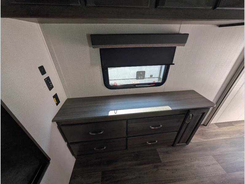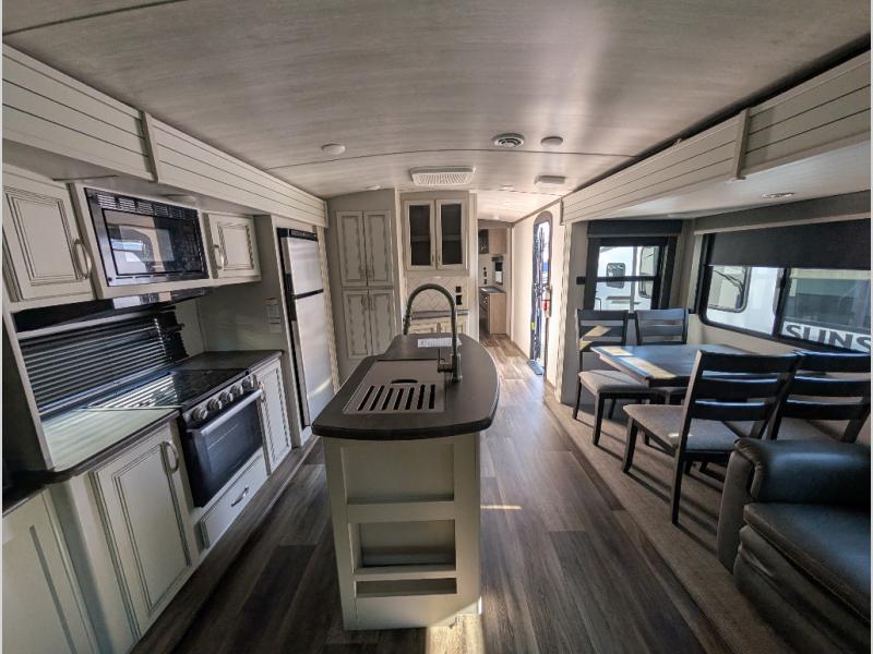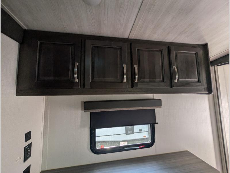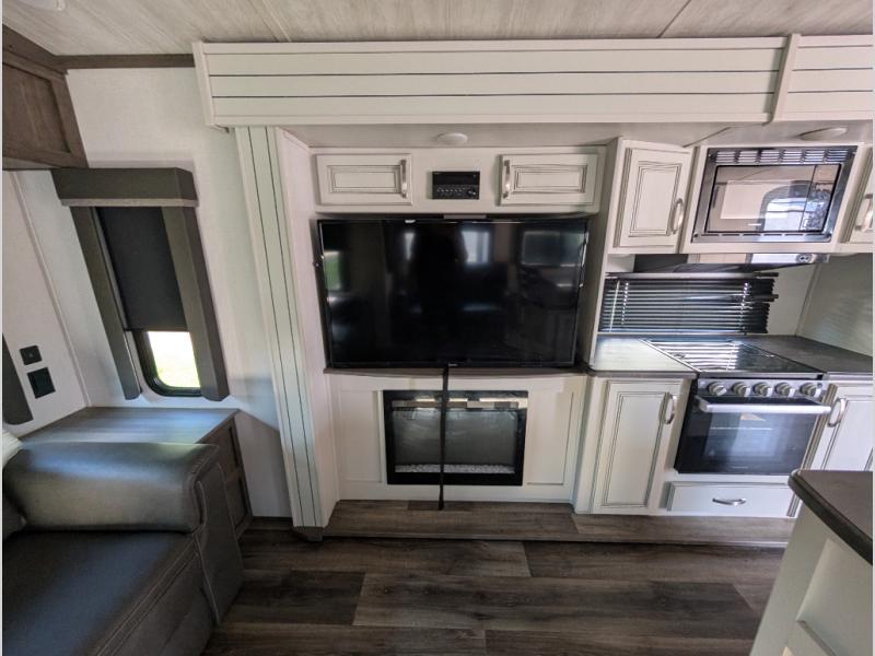 You'll definitely want to snatch up this Cougar Half-Ton travel trailer if you're a couple or small family that wants to live in comfort while at the campsite! There is a private bedroom at the front, and it has a king bed slide, full-width wardrobe, entertainment center, and bench seat which will give you those residential vibes. Right next to the bedroom is a full bathroom that comes with a linen closet prepped for a washer/dryer. The main living area is what truly gives you the royal treatment because it has theater seating directly across from the entertainment center and fireplace, a kitchen island that you can gather around when it's snack time, a booth dinette that will serve as a bed or a dinner table, and a 68" tri-fold sleeper sofa with end tables for your glass of wine. The kitchen also has a pantry, so you can keep your trailer stocked with goodies throughout the whole trip.