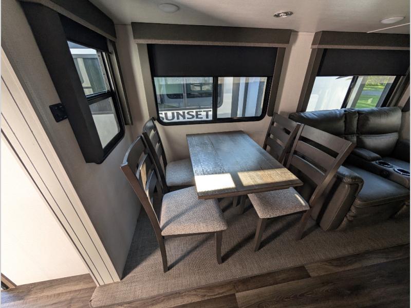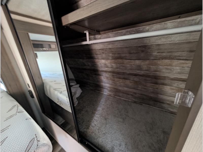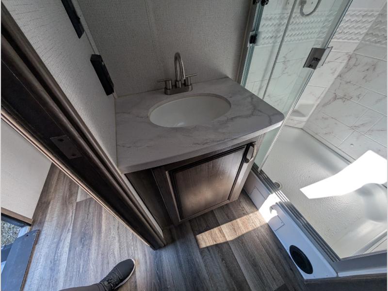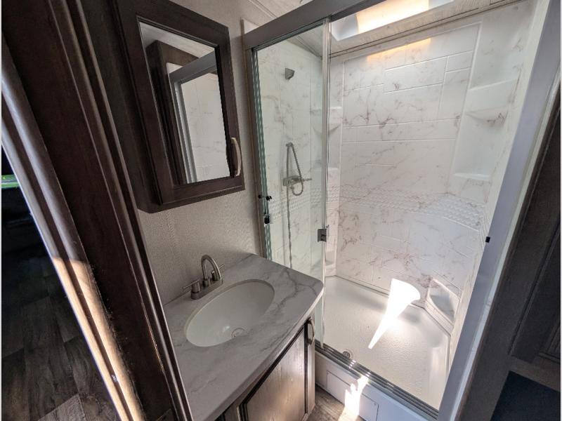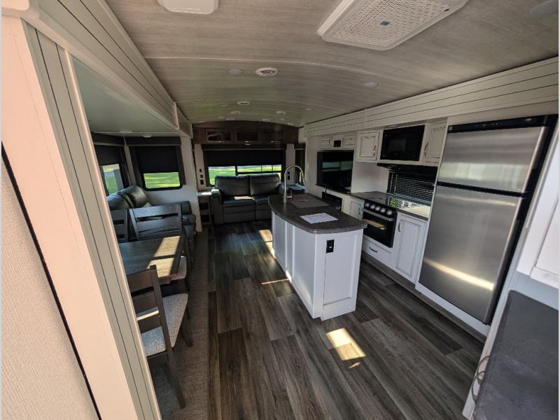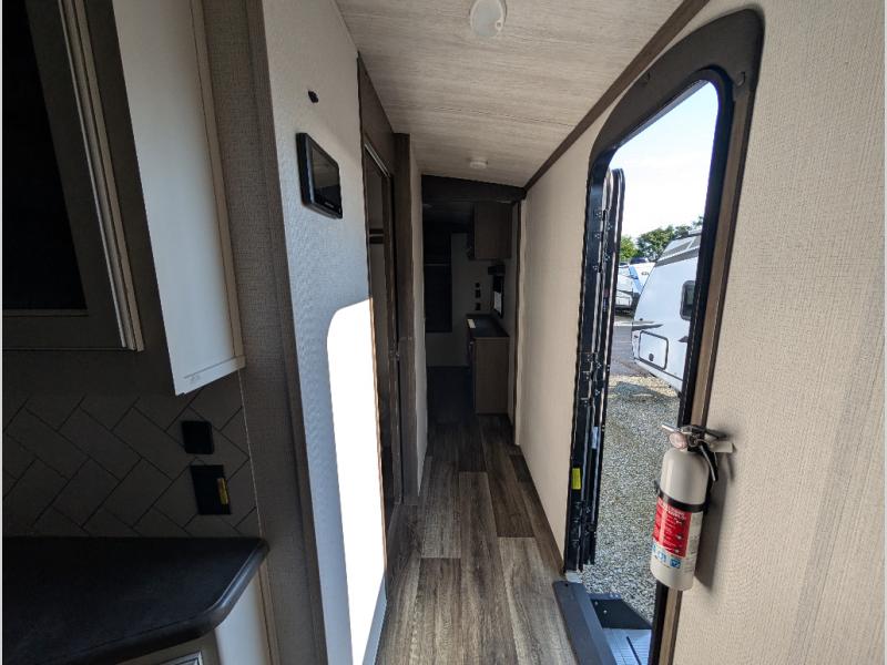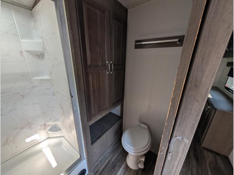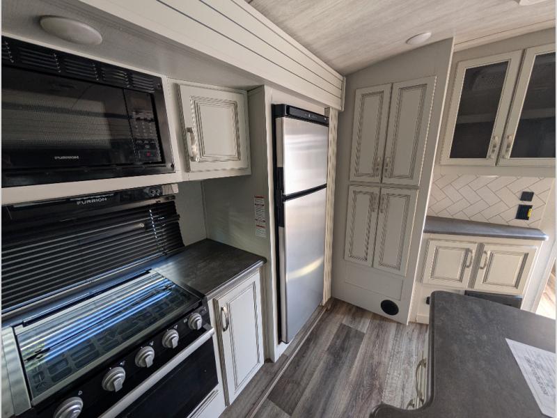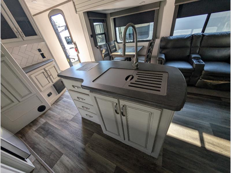 You'll definitely want to snatch up this Cougar Half-Ton travel trailer if you're a couple or small family that wants to live in comfort while at the campsite! There is a private bedroom at the front, and it has a king bed slide, full-width wardrobe, entertainment center, and bench seat which will give you those residential vibes. Right next to the bedroom is a full bathroom that comes with a linen closet prepped for a washer/dryer. The main living area is what truly gives you the royal treatment because it has theater seating directly across from the entertainment center and fireplace, a kitchen island that you can gather around when it's snack time, a booth dinette that will serve as a bed or a dinner table, and a 68" tri-fold sleeper sofa with end tables for your glass of wine. The kitchen also has a pantry, so you can keep your trailer stocked with goodies throughout the whole trip.