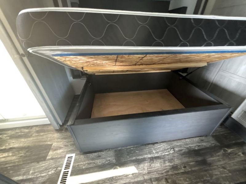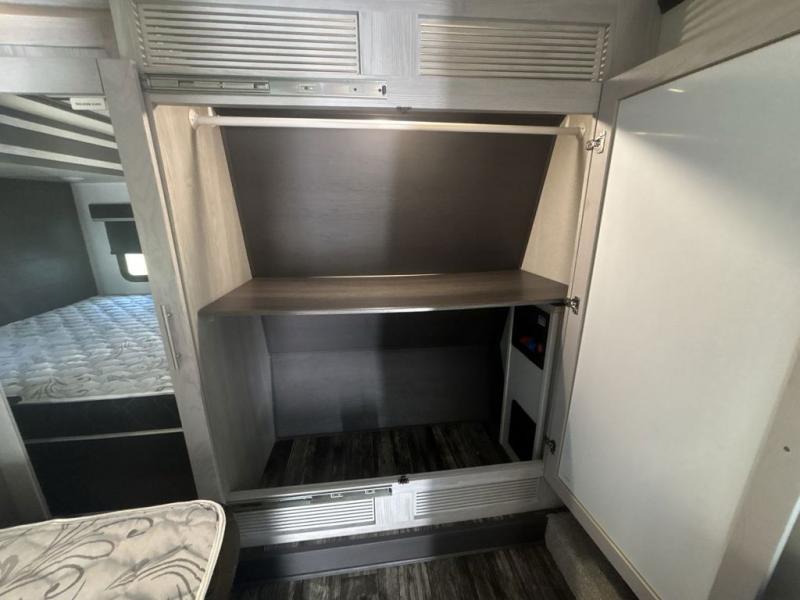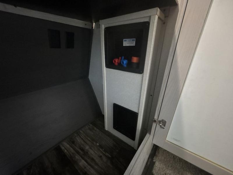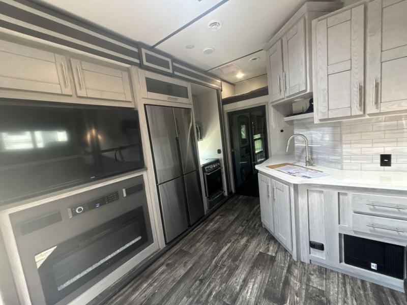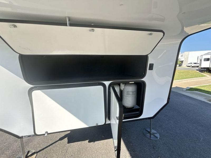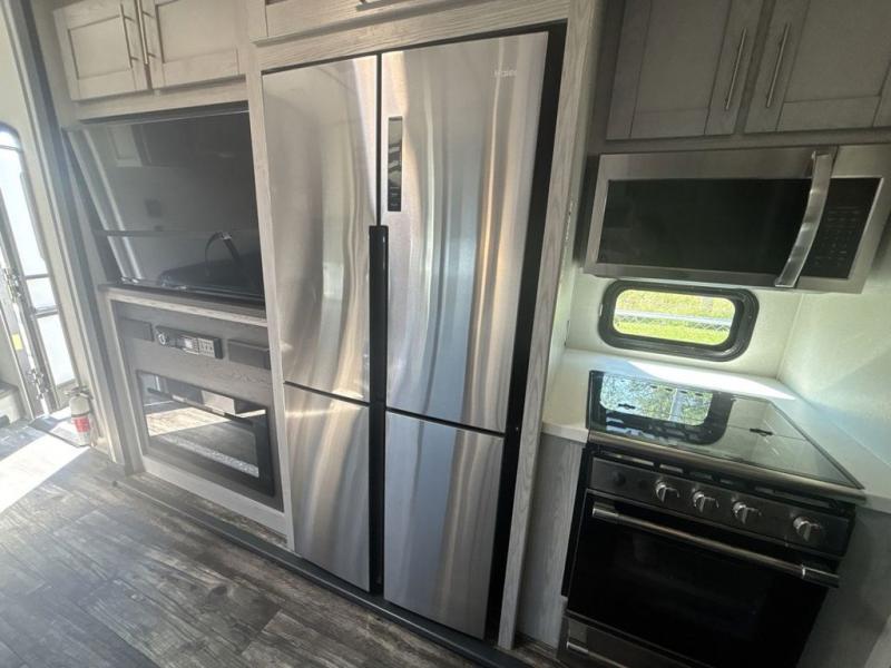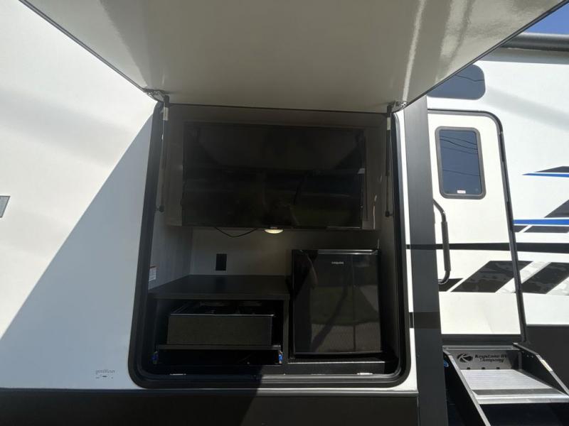 This toy hauler is packed with handy features! Starting with the 11' garage area that has dual opposing sofas with a queen bed above them, an LED TV, a loft with a bunk mat, a half bathroom, and one of the dual entrance doors to the unit. The kitchen slide not only opens up the living space, but also has a three burner range with a convection microwave above, a stainless steel refrigerator, and an entertainment center with an LED TV and fireplace all of which is across from the theater seating slide and a hide-a-bed sofa. There is even an outdoor entertainment center with an LED TV, a pull-out cooktop, and a refrigerator to keep your beverages cold while you watch the big game. When you're ready to wind down your nights, clean up in the dual entry bathroom with the residential shower with a seat then head directly into the front private bedroom to lay your head on the residential queen bed slide with USB ports on either side, plus there is a front master closet that is prepped to add an optional washer and dryer!